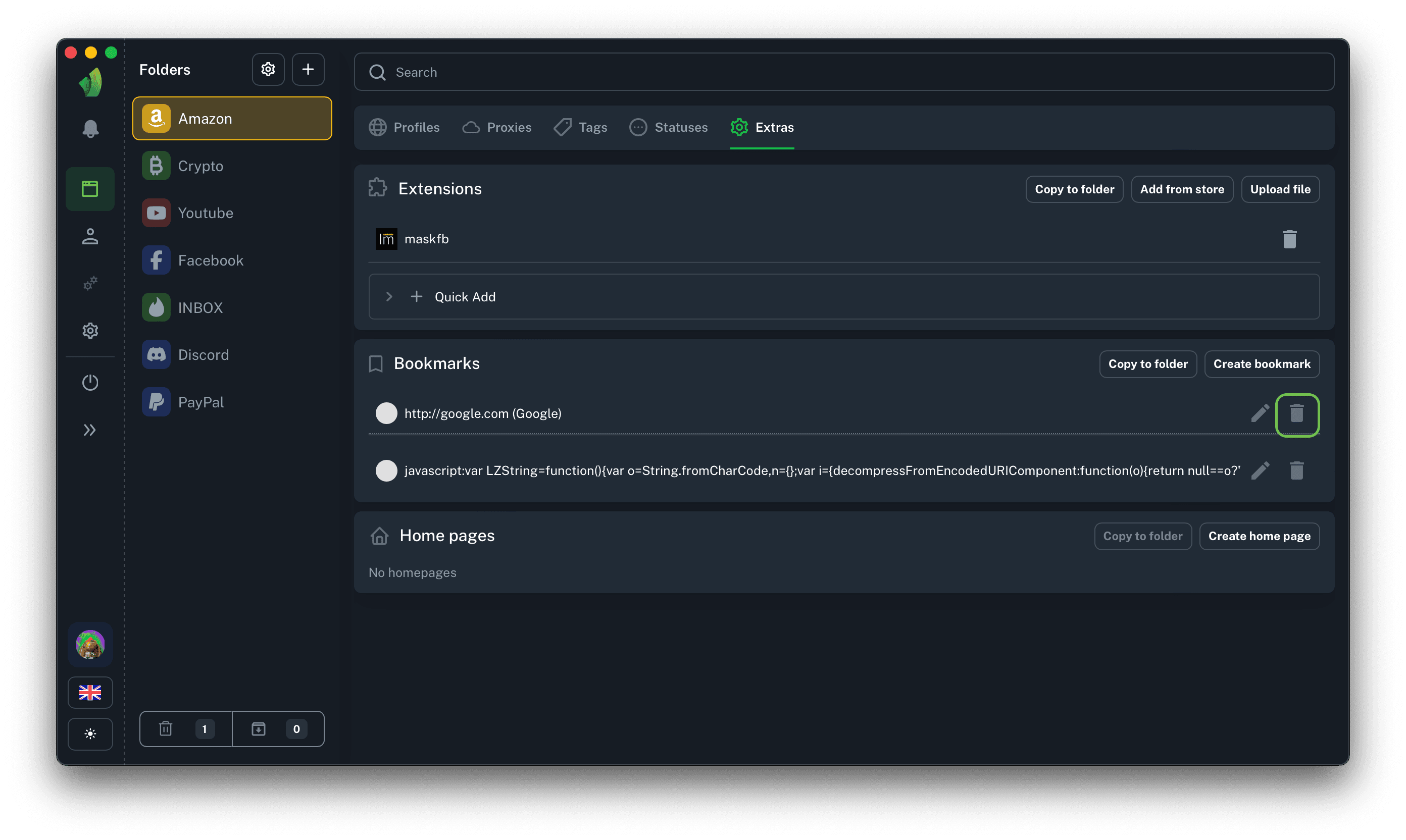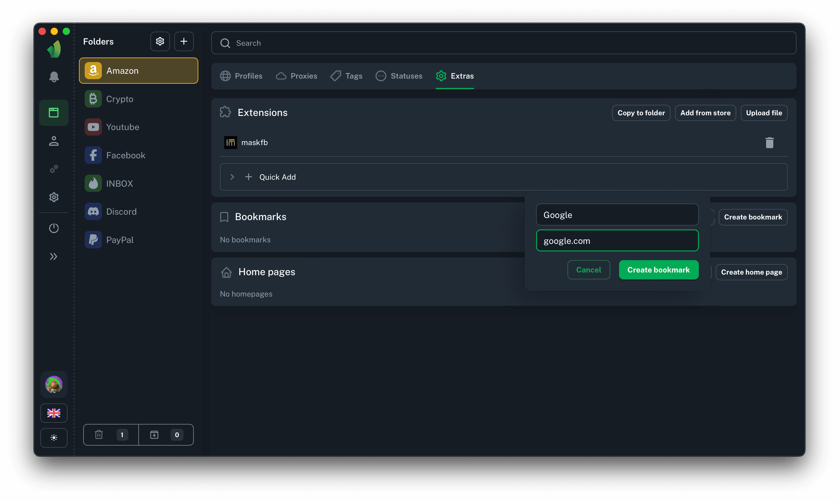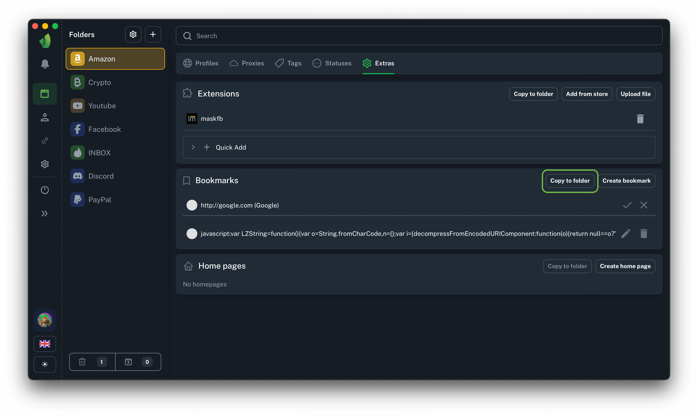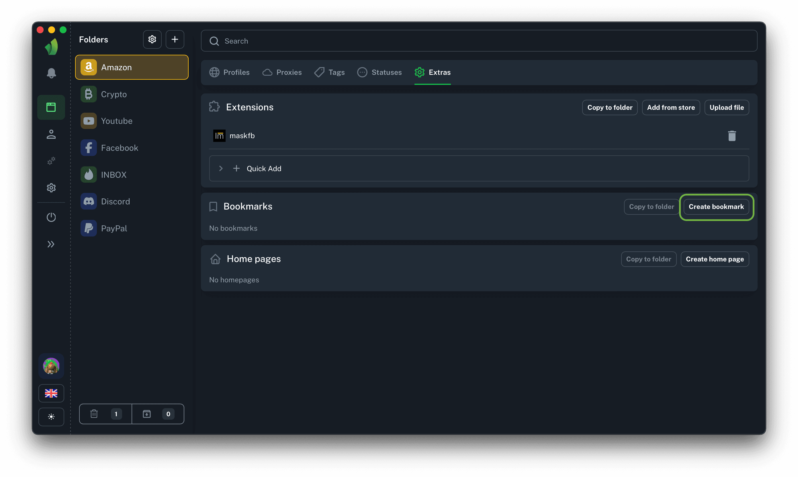 The result of adding bookmarks will be their display in the Extras section, as well as their presence in each profile in the current folder.