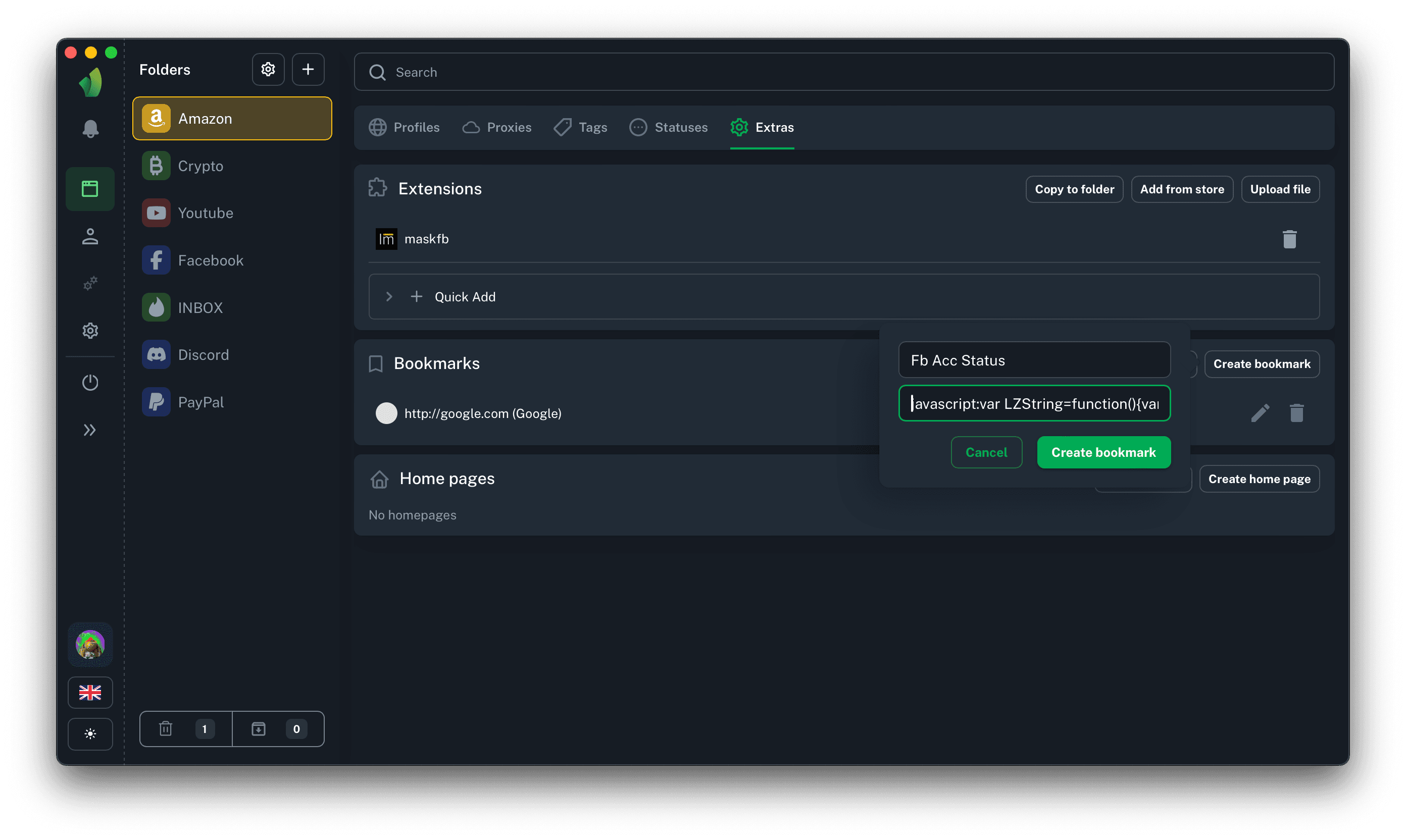 In Vision you can add JavaScript code as a bookmark, for example FB Acc Status. The process itself is no different from adding regular bookmarks, but you need to add JS code instead of URL.