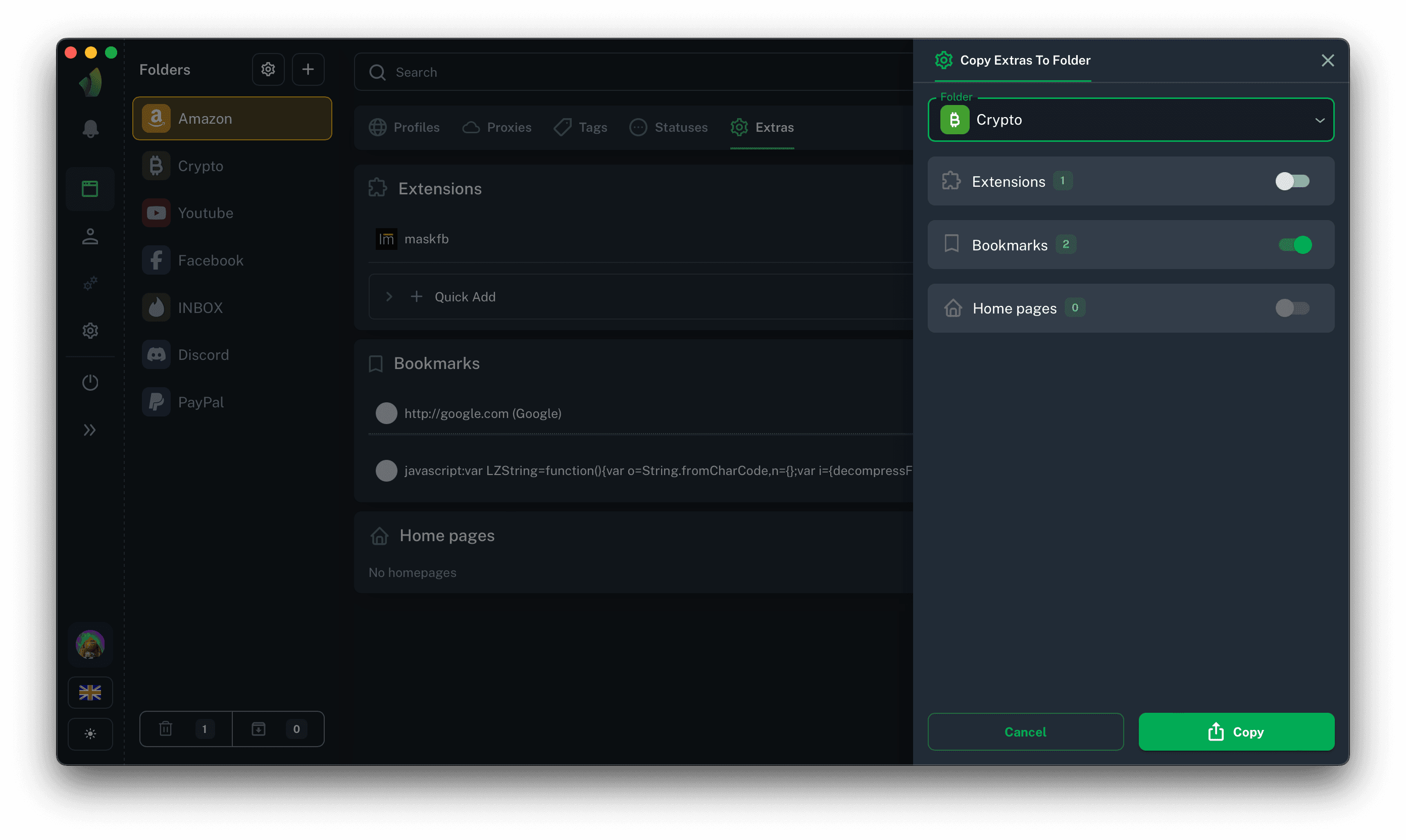 In the copy sidebar that opens, select the folder to which you want to copy the bookmarks and click the Copy button