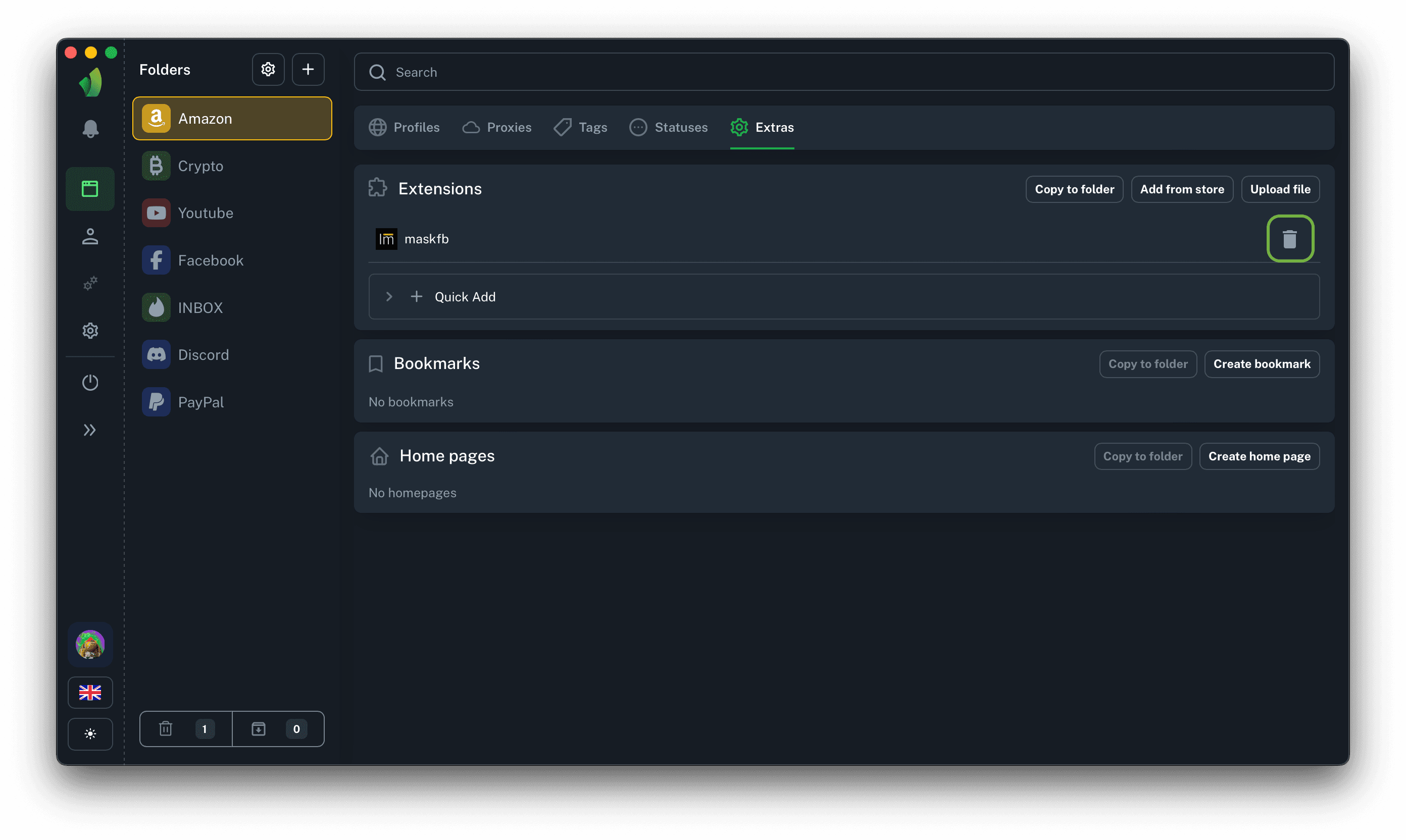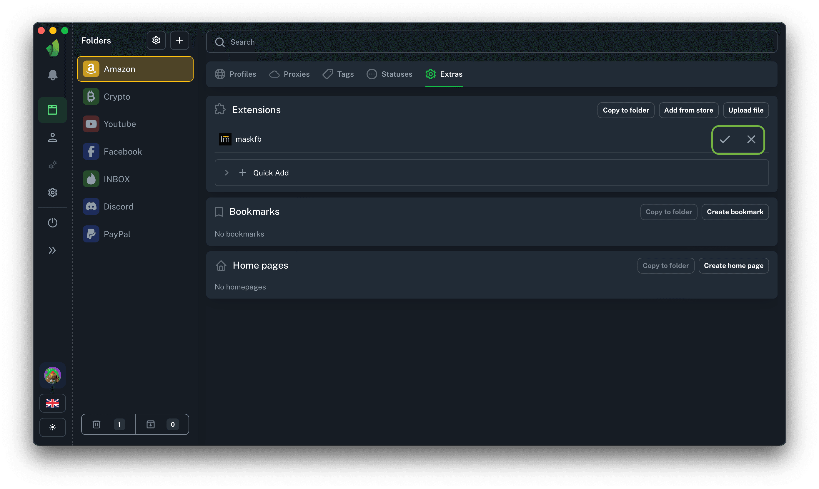 To remove an extension from a folder, click the trash can icon next to the extension and then the confirm or cancel icon, depending on the action required.