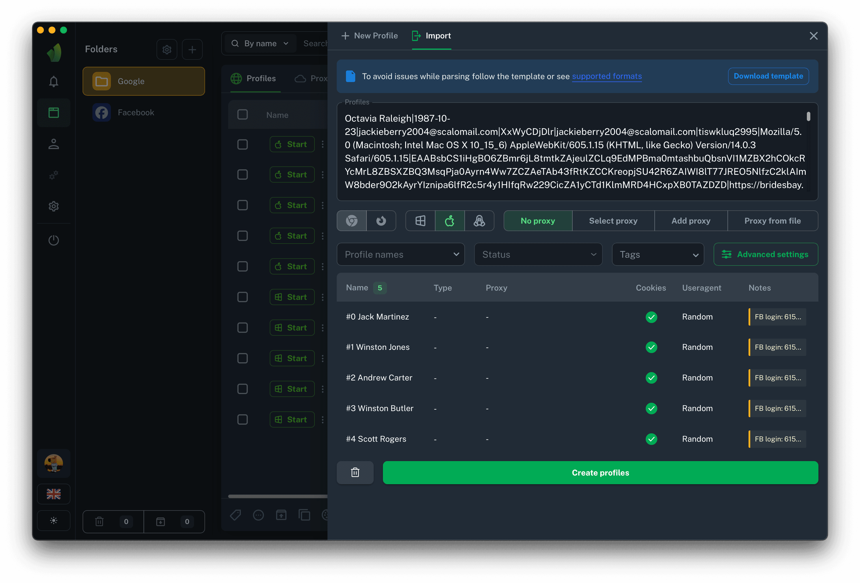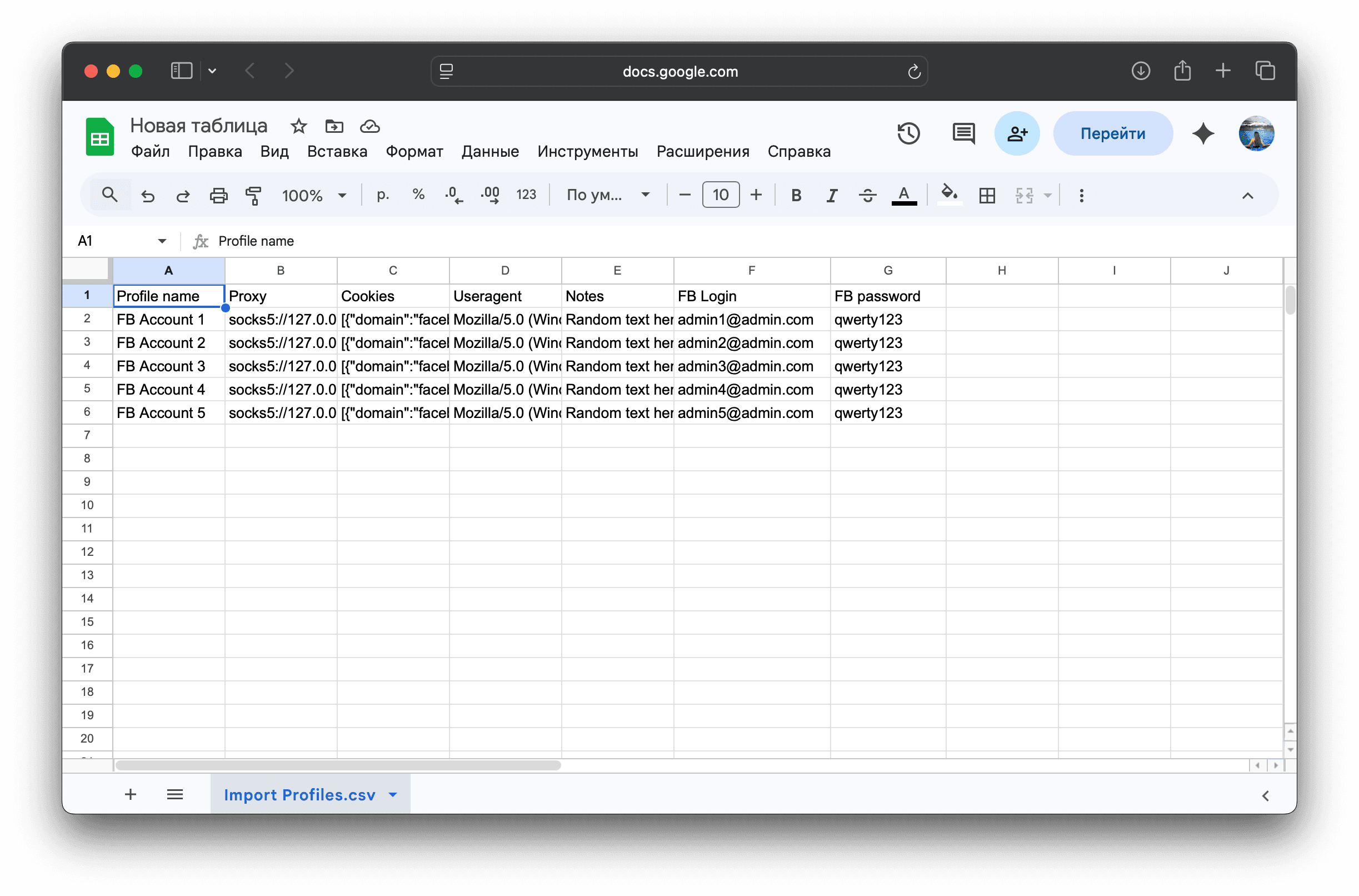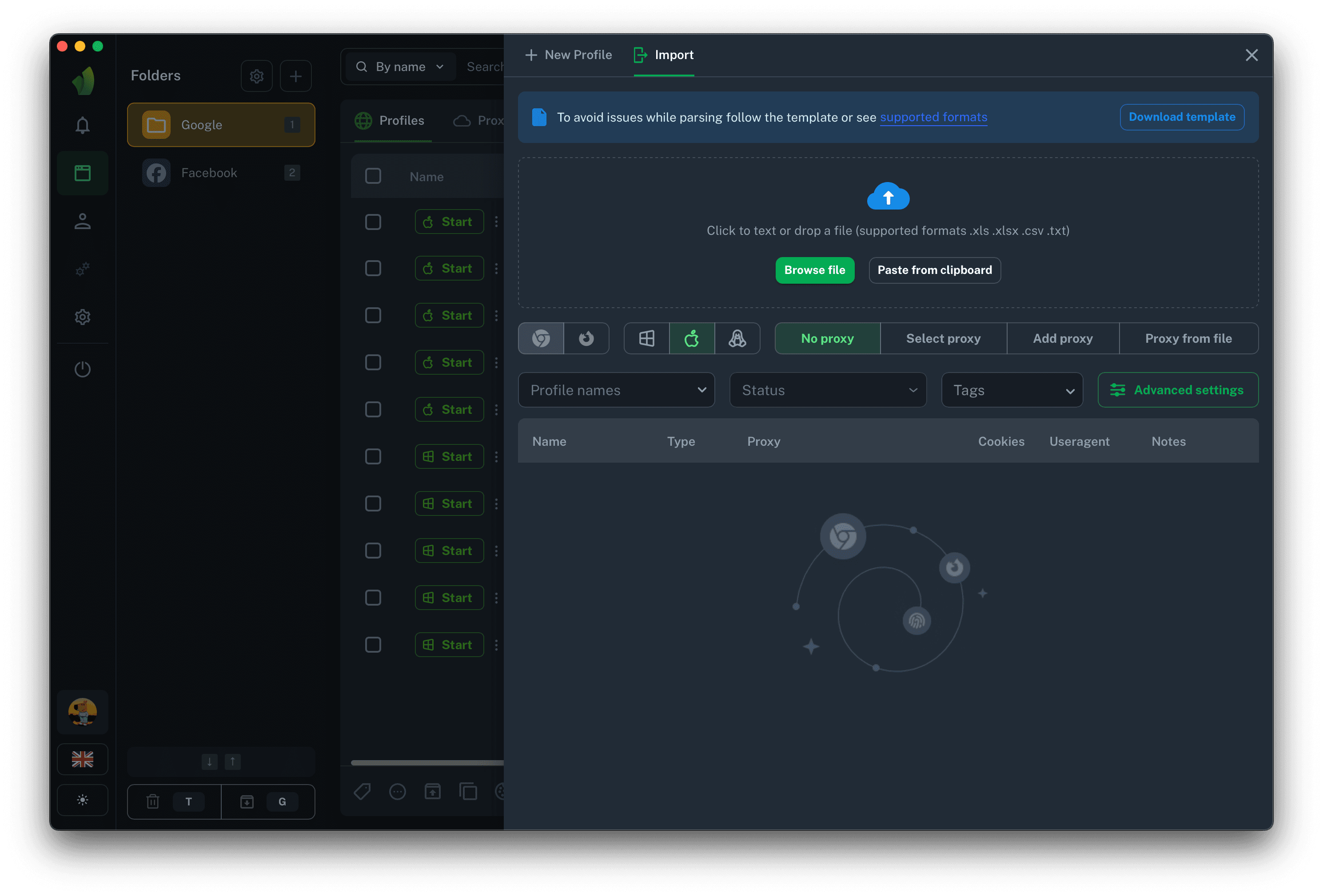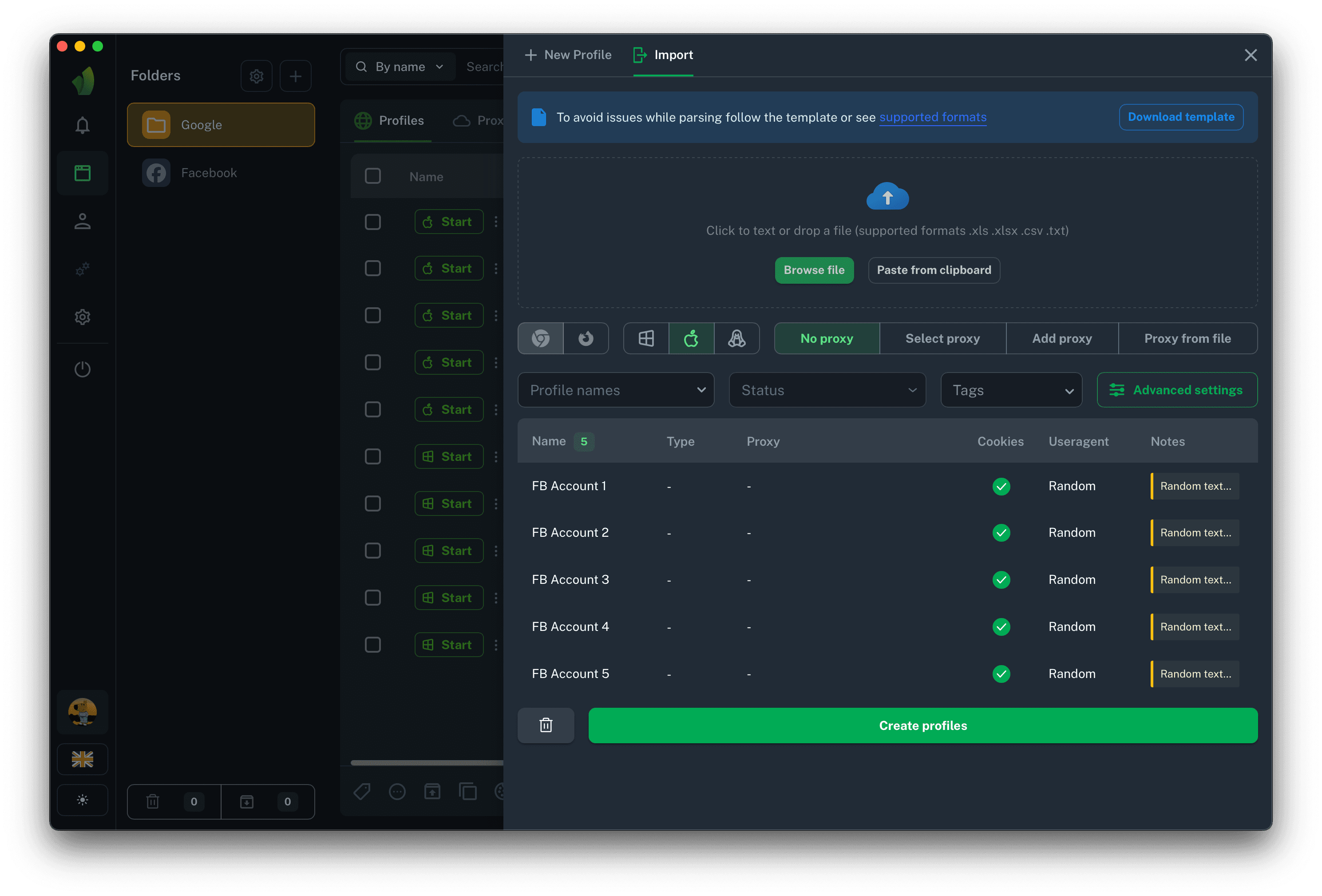 Mass import from a spreadsheet is convenient because it allows you to upload accounts that you obtained not from the store but, for example, from another anti-detection tool. It will also be useful for users who only have cookies; you can simply paste them into the spreadsheet and transfer the spreadsheet to the mass profile creation interface.