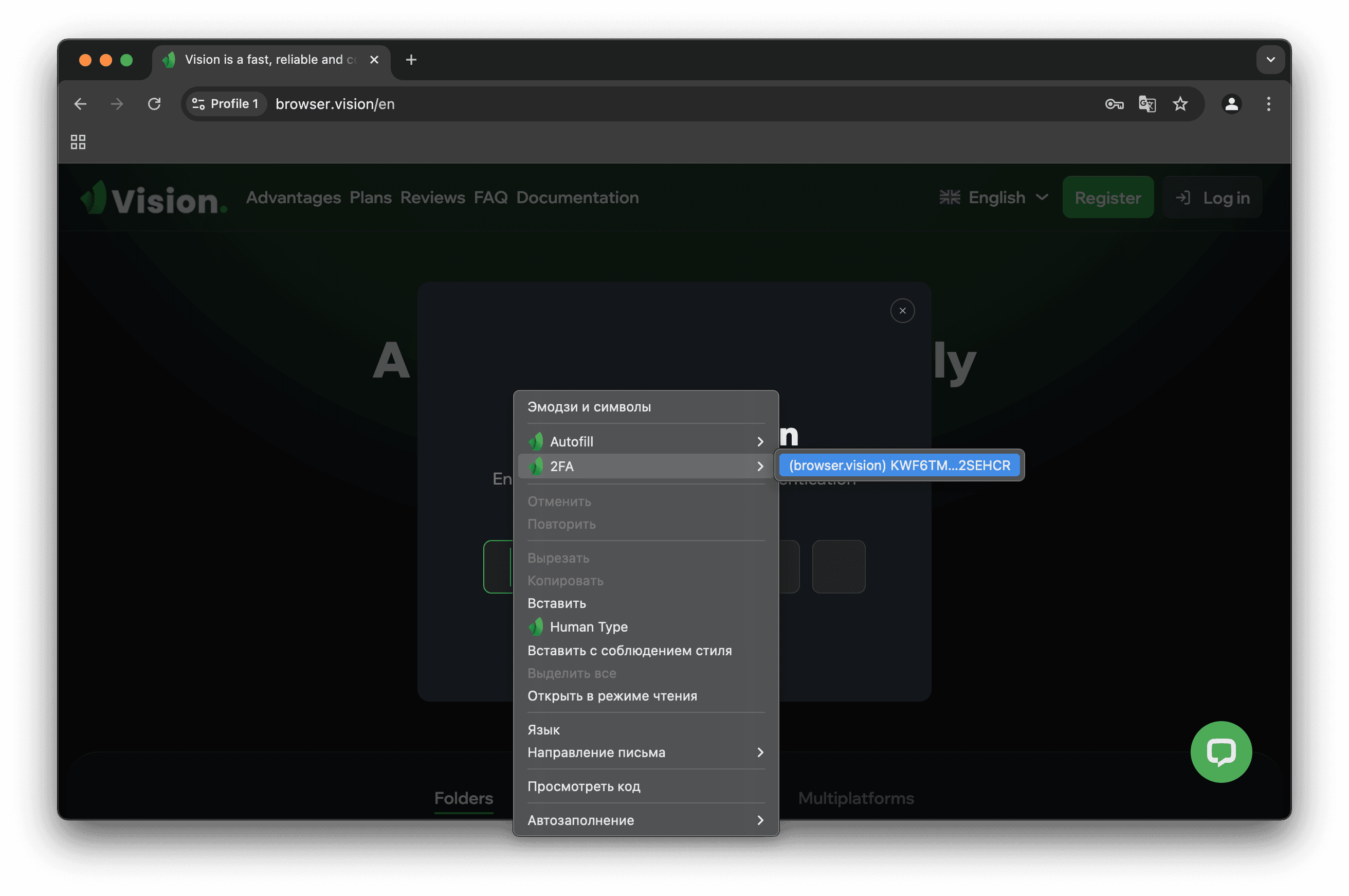 In order to generate 6-digit codes of two-factor authentication, you need to go to the required website and in the field for data entry call the context menu by right-clicking, go to the item 2FA and select the required website.