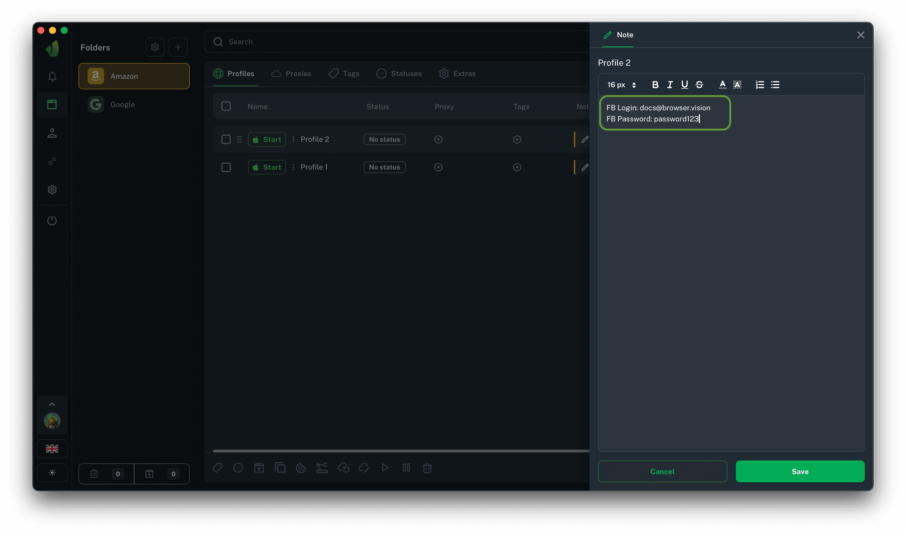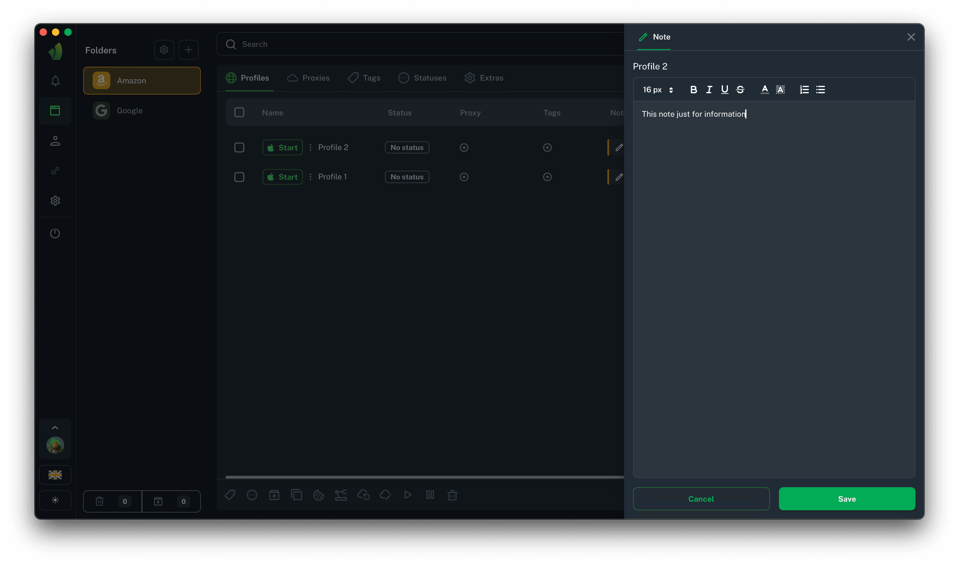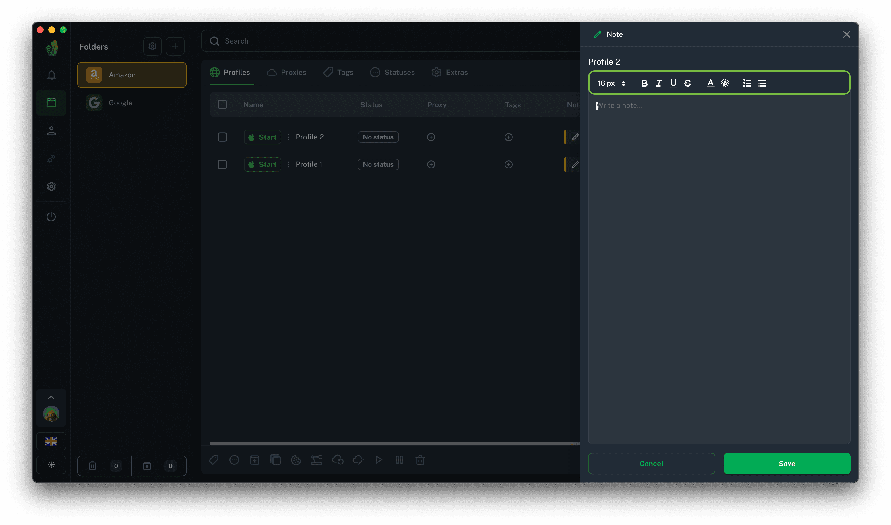 Clicking on the icon will open the note editing sidebar, where you can not only leave the text data, but also add the necessary formatting (the text formatting panel is highlighted in green in the screenshot above):
