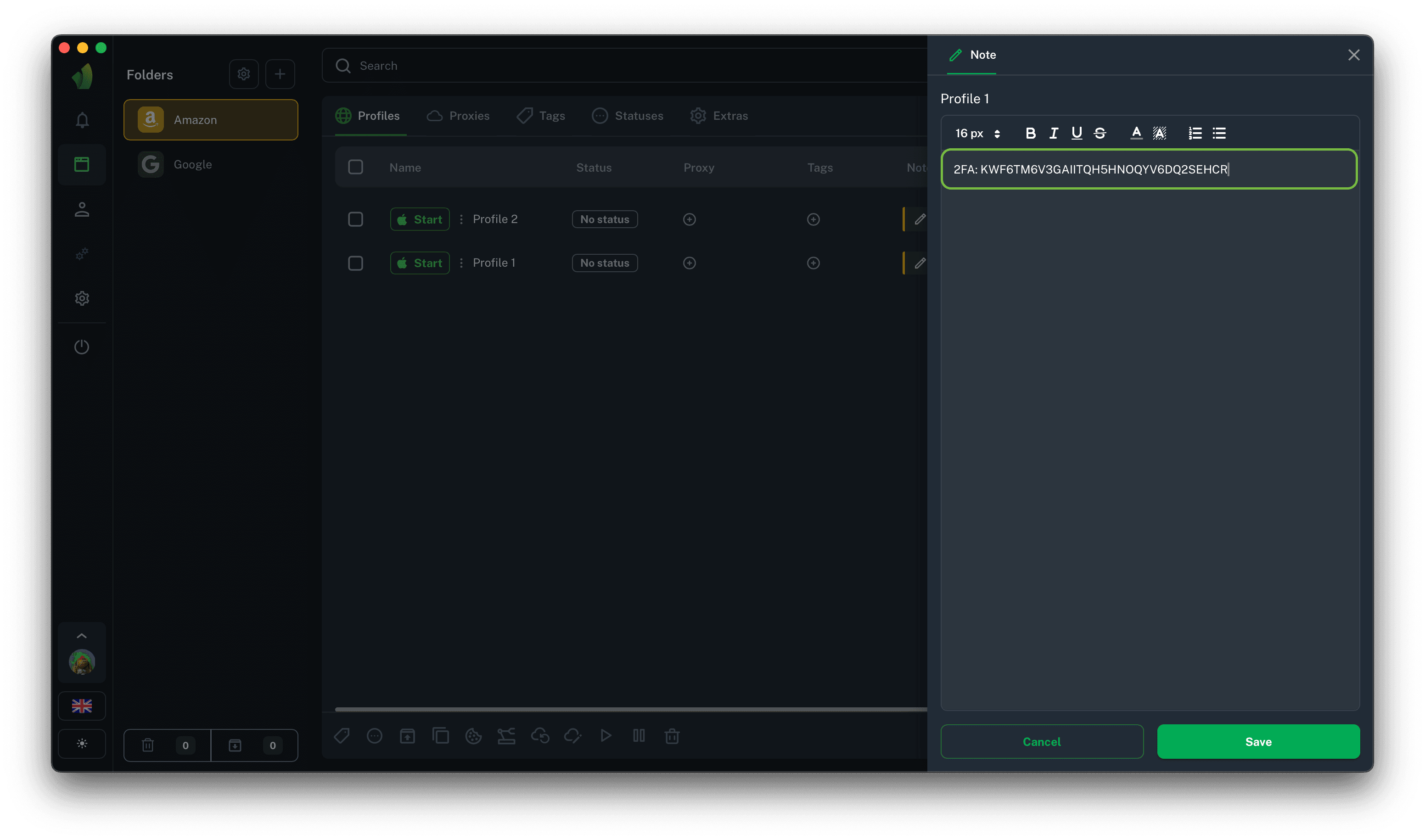 In order to generate two-factor authentication codes, you need to add data to the note in the format key: value, for example: