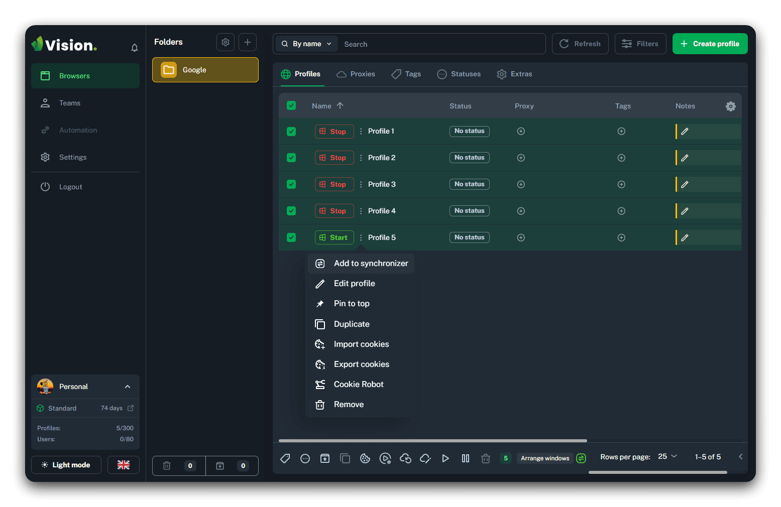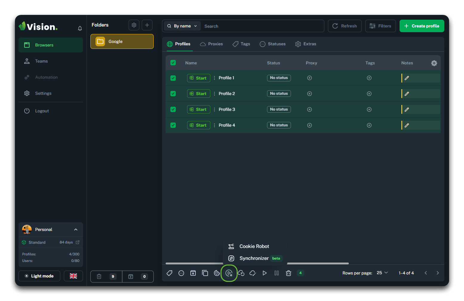 The Vision includes the Synchronizer feature, which allows you to perform actions simultaneously across multiple profiles. This tool significantly speeds up work and makes it possible to completely eliminate routine tasks from the workflow by performing actions only in the master profile.