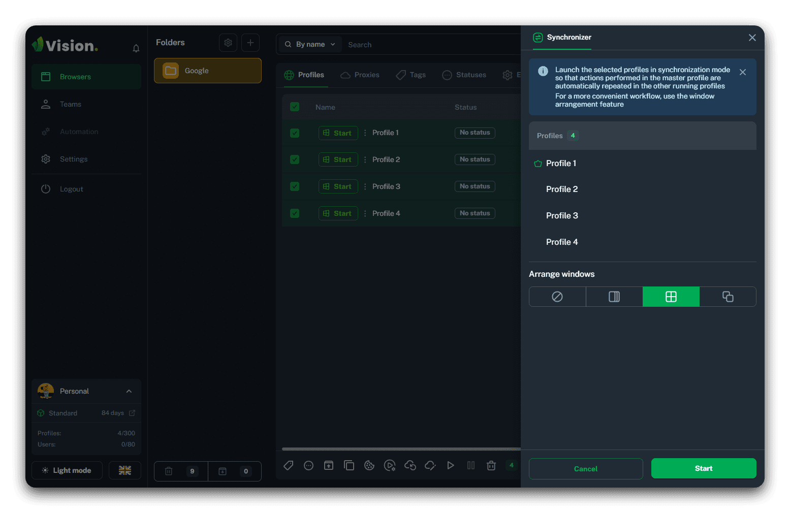 After opening the Synchronizer sidebar, you need to choose one of the four options (No arrangement, Stacked, Fixed grid, Cascade) for placing the windows of the launched profiles on the screen and click the Start button.