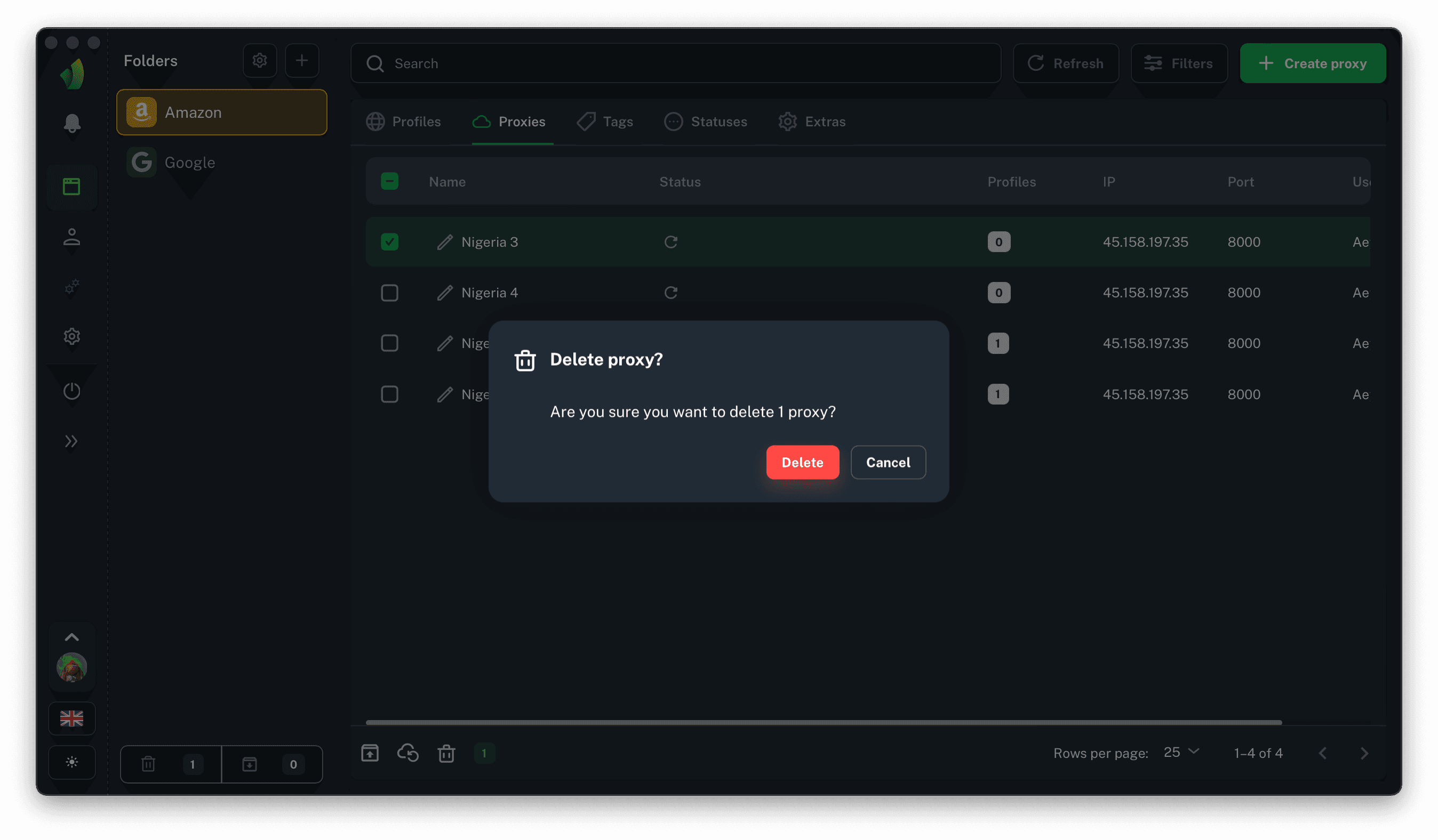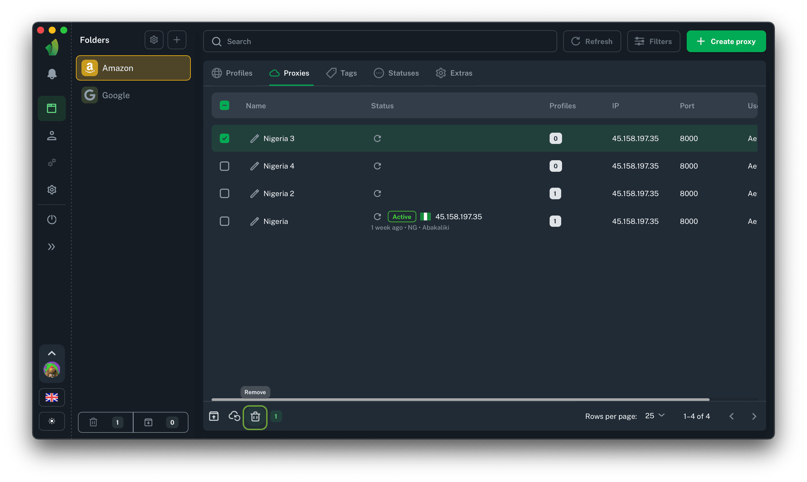 To delete an already added proxy, go to the tab of the same name in the necessary folder, select the proxies you want to delete and click the trash can icon (highlighted in green on the screenshot) in the mass actions menu.