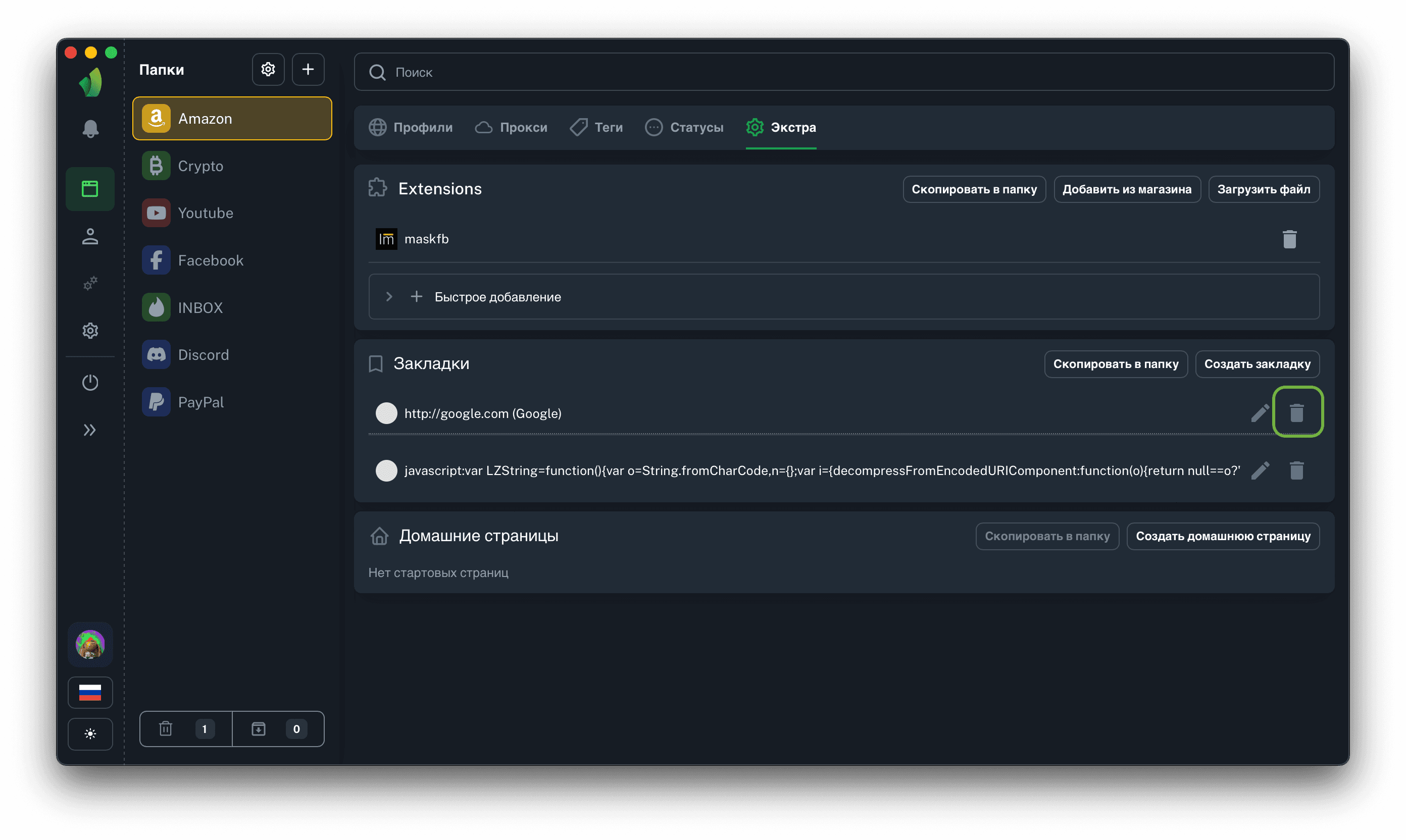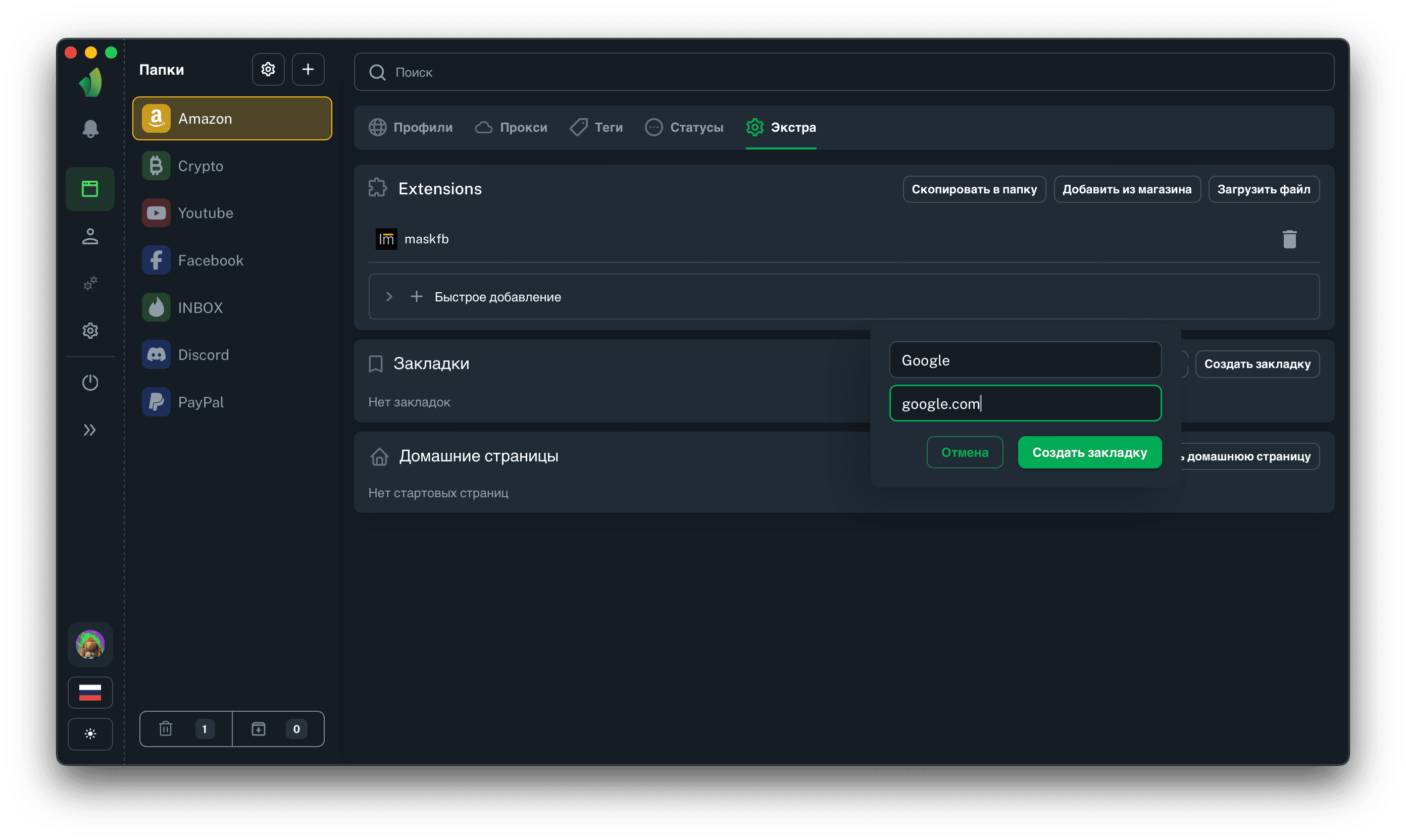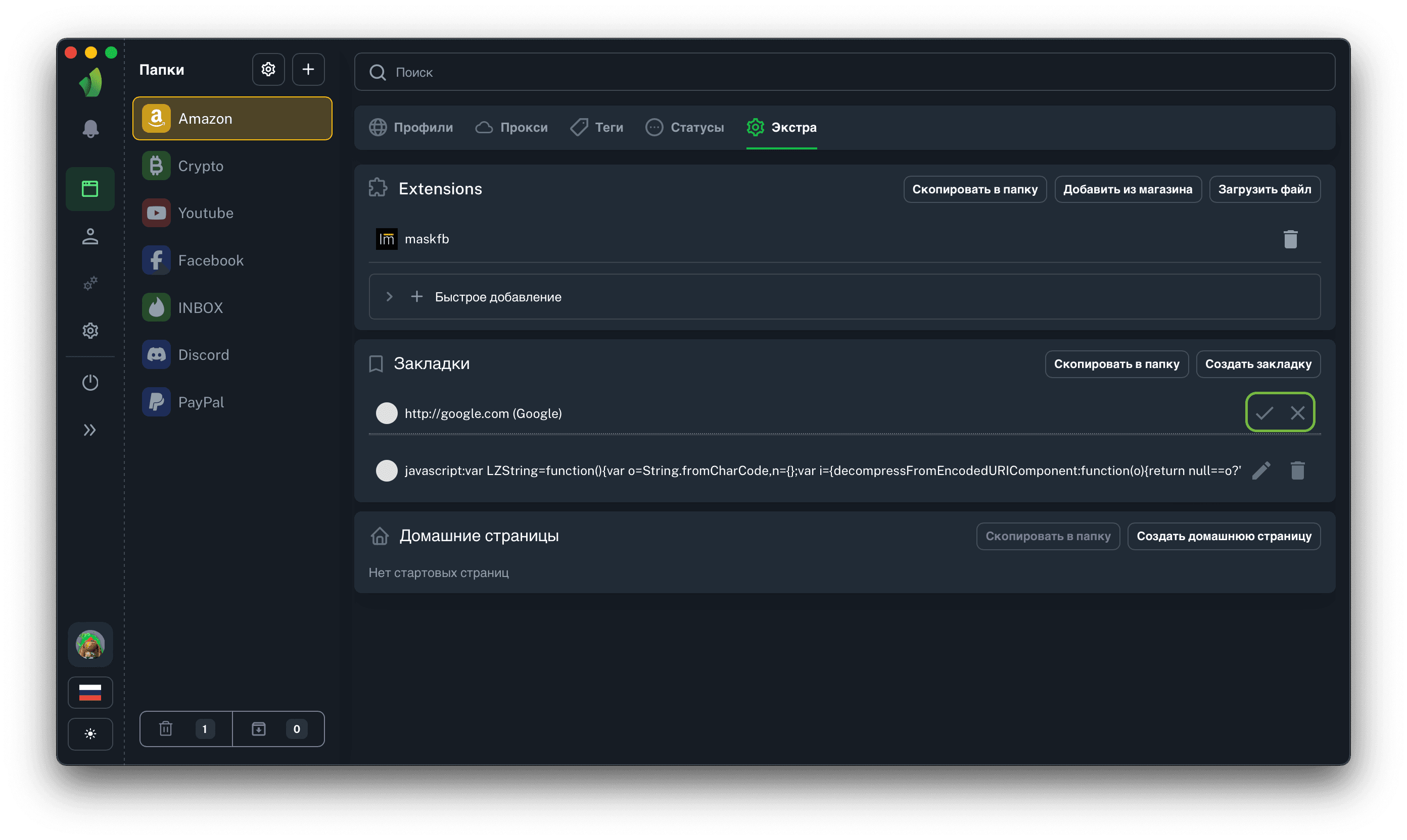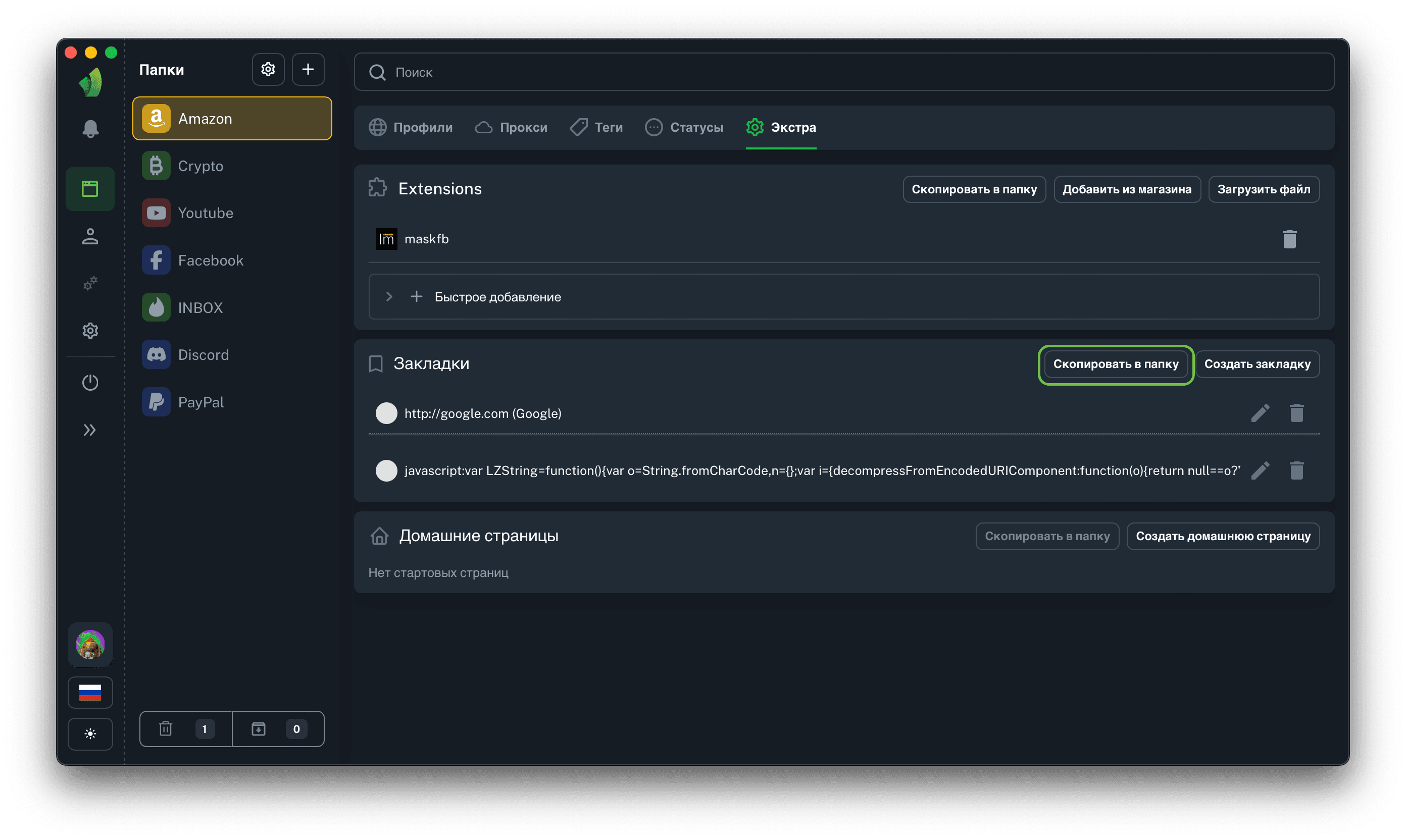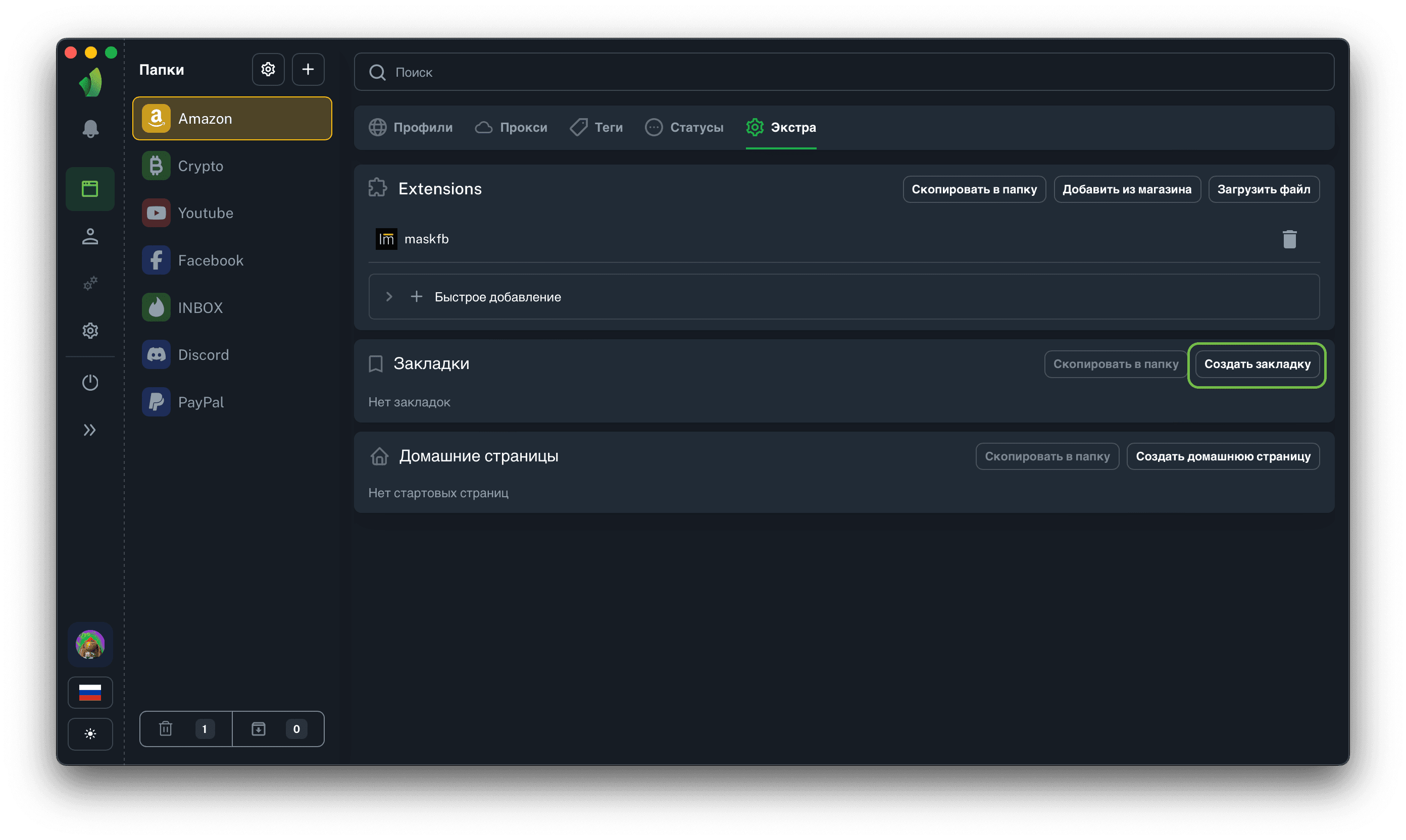 Результатом добавление закладок будет их отображение в разделе Extras, а также их присутствие в каждом профиле в текущей папке.