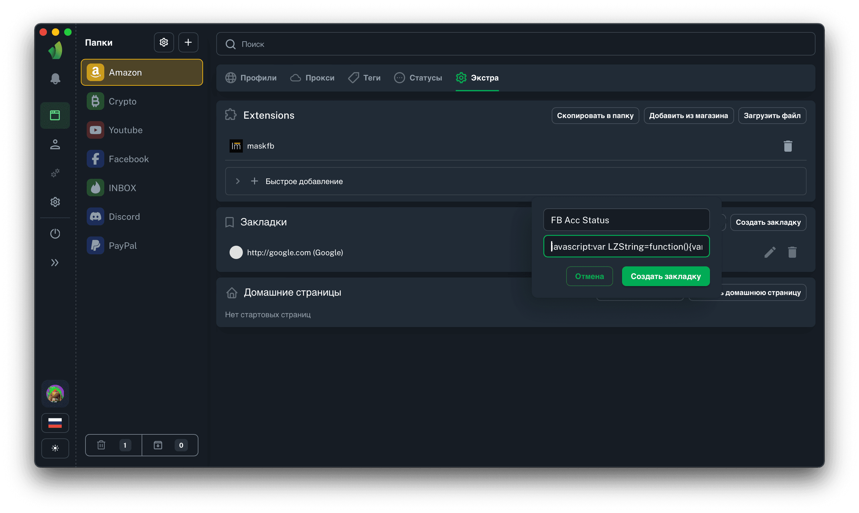 В появившемся модальном окне введите название закладки, JS-код скрипта в поле URL и нажмите кнопку Создать закладку