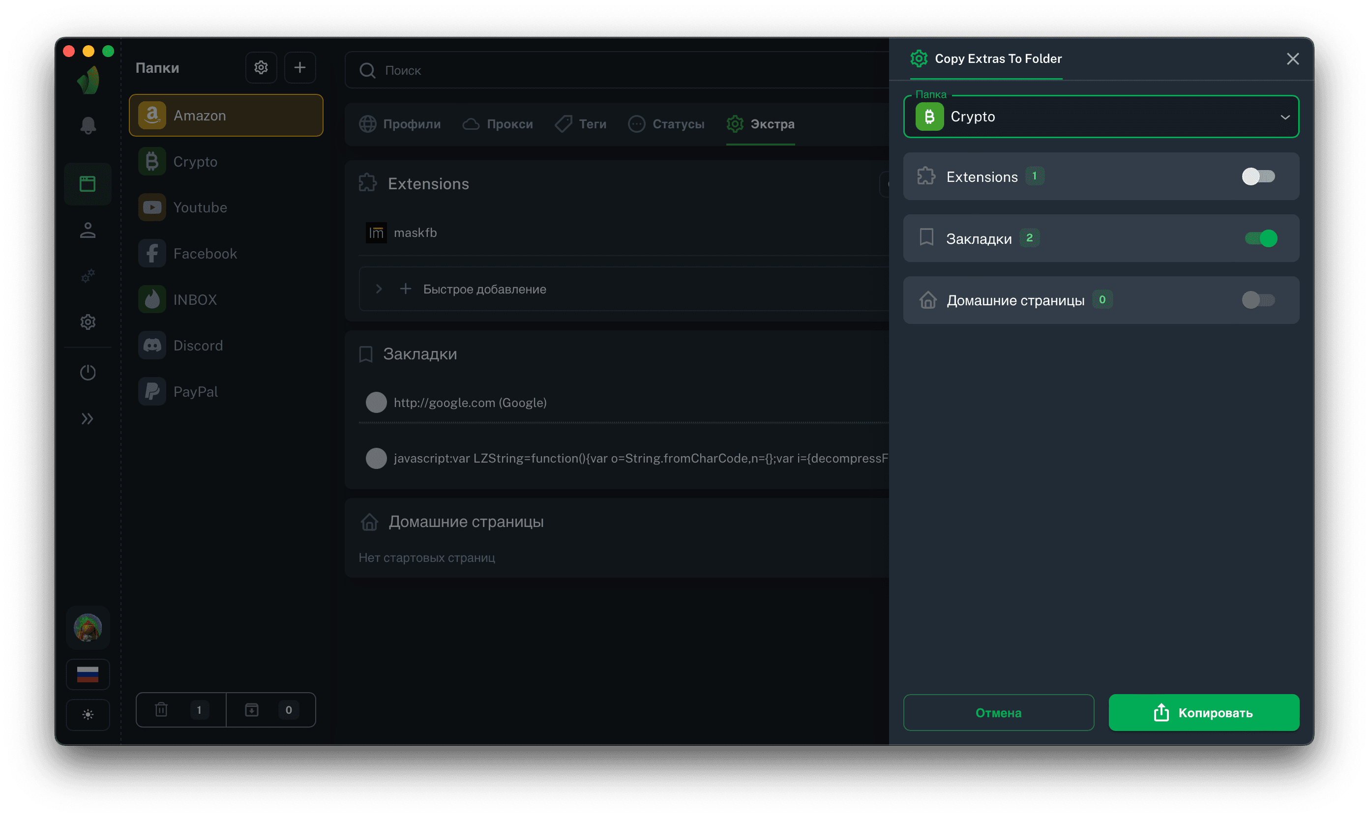 После нажатия кнопки Копировать в разделе Extras в выбранной папке появятся закладки, скопированные из текущей.