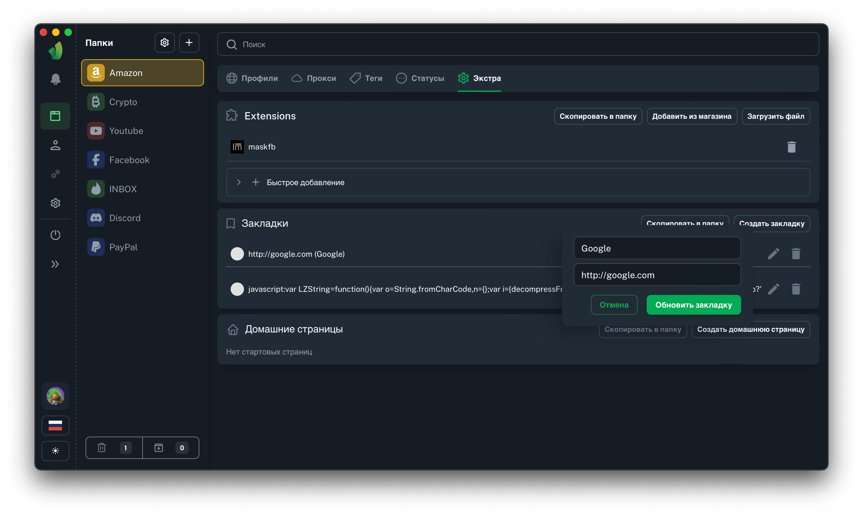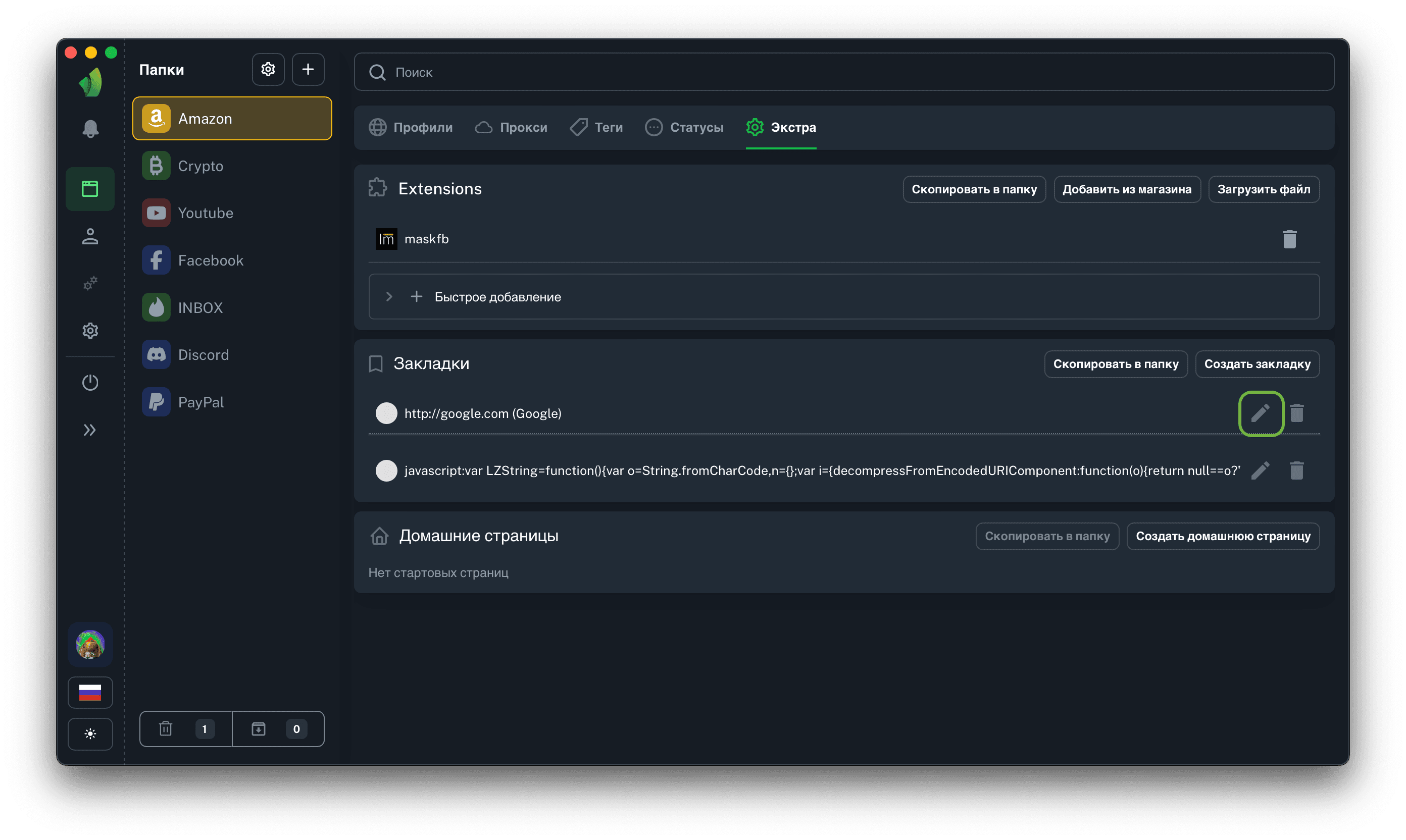 Важно понимать, что в профилях, которые были запущены на момент редактирования закладки, данные изменятся только после перезапуска профиля.