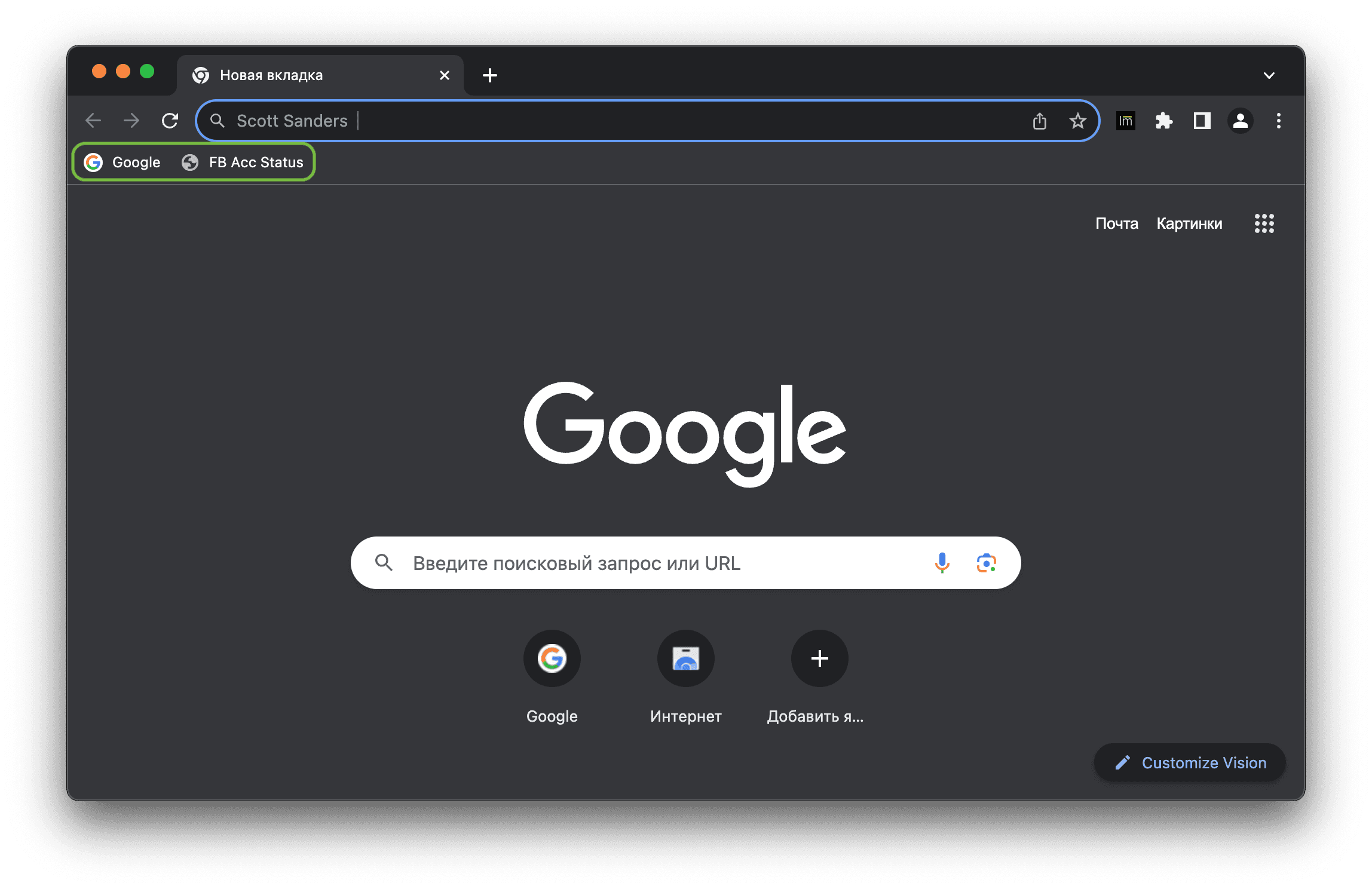 В Vision вы можете добавить JavaScript-код в качестве закладки, например FB Acc Status. Сам процесс ничем не отличается от добавления обычных закладок, но вместо URL нужно добавить JS-код.