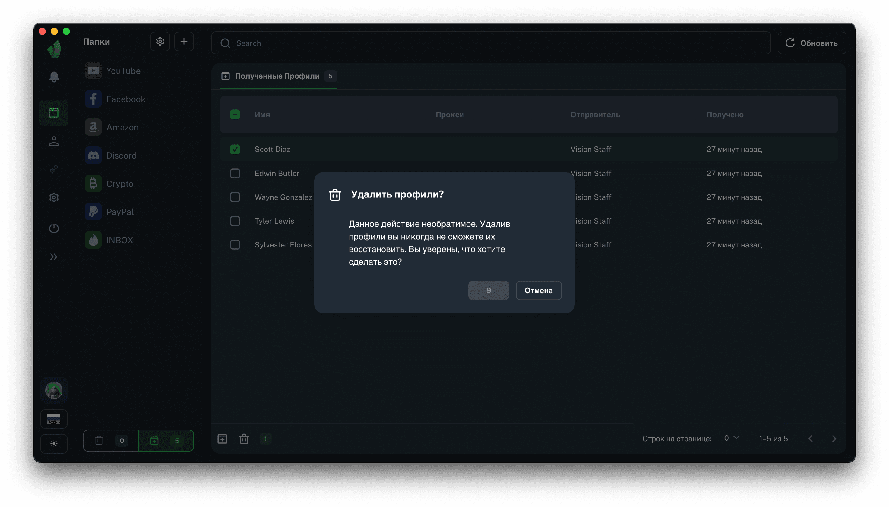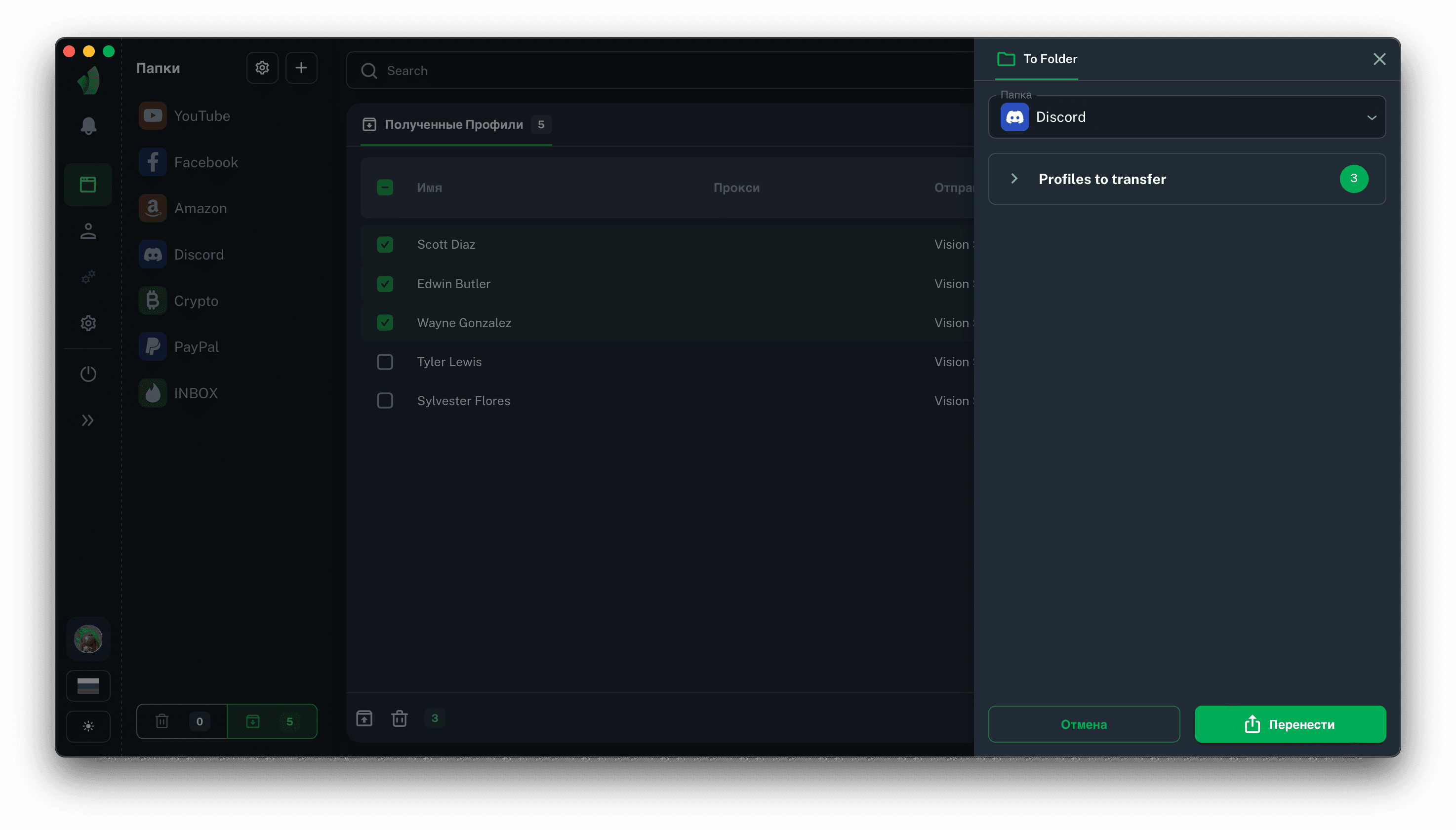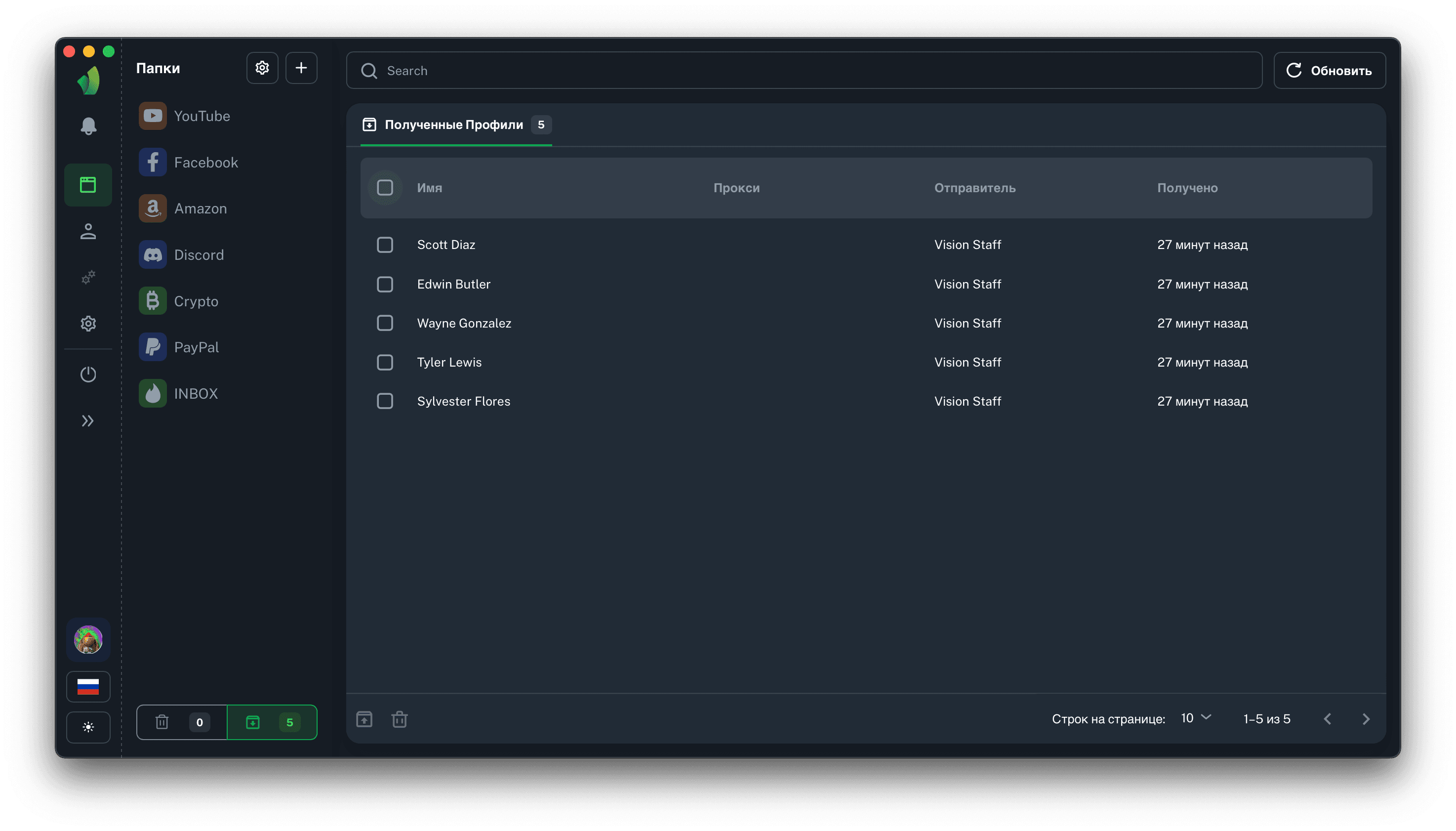 Все профили, которые были переданы вам извне отправляются в папку полученных профилей. Найти её можно в сайдбаре папок, рядом с кнопкой Корзины, на скриншоте выше она обведена зелёным цветом.
