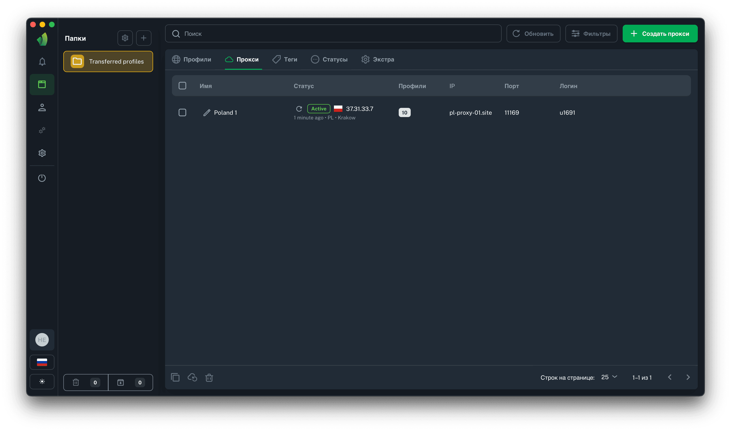 После получения данных из Dolphin Anty появится количество полученных профилей, а также таблица, в которой находится информация о них: ОС, название, наличие прокси на профиле и заметки. Получаемые данные не ограничиваются лишь этими параметрами, но для упрощения вида отображается только самая важная информация по профилям.