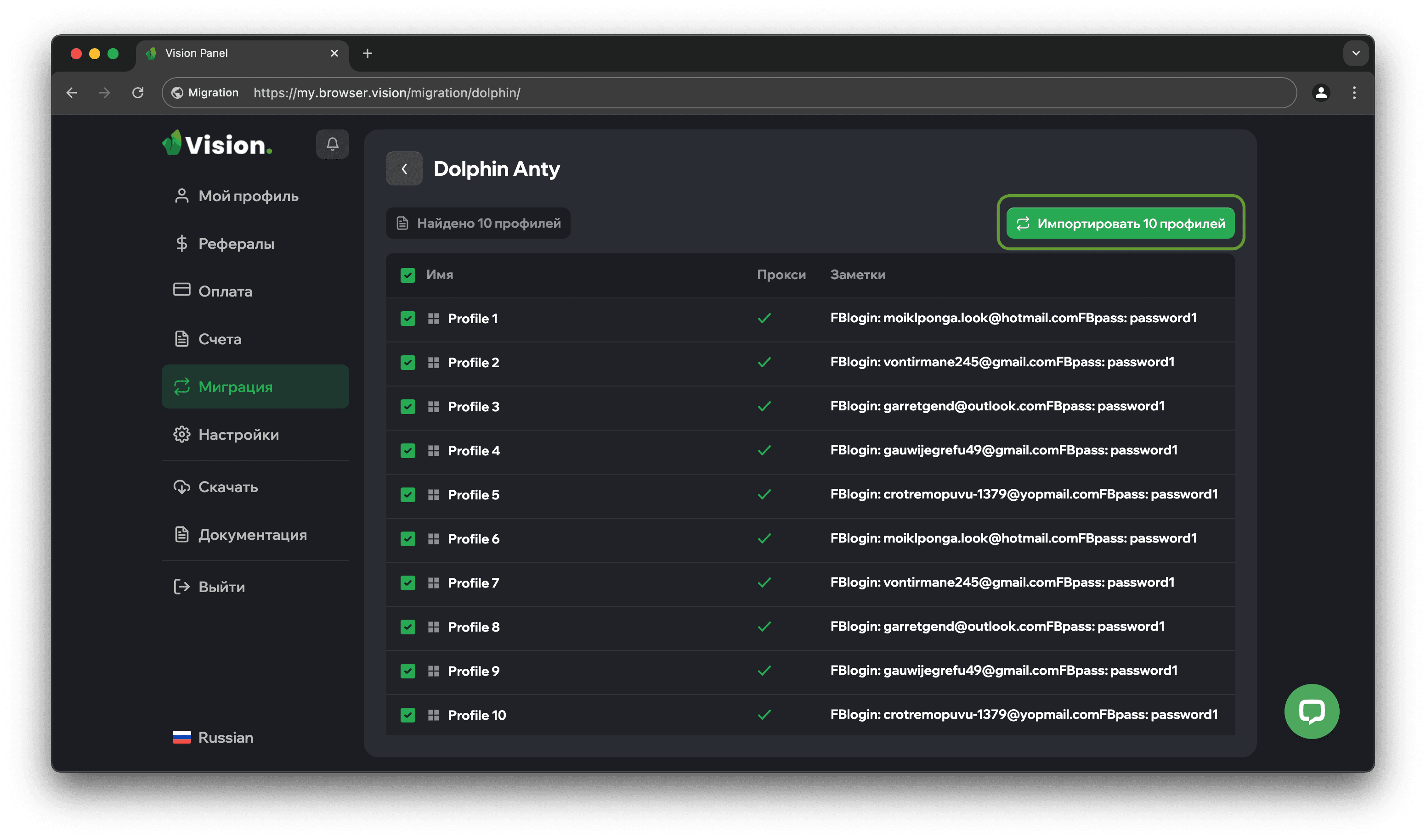 Вам остаётся выбрать профили, которые необходимо перенести из Dolphin Anty в Vision и нажать кнопку Импортировать N профилей