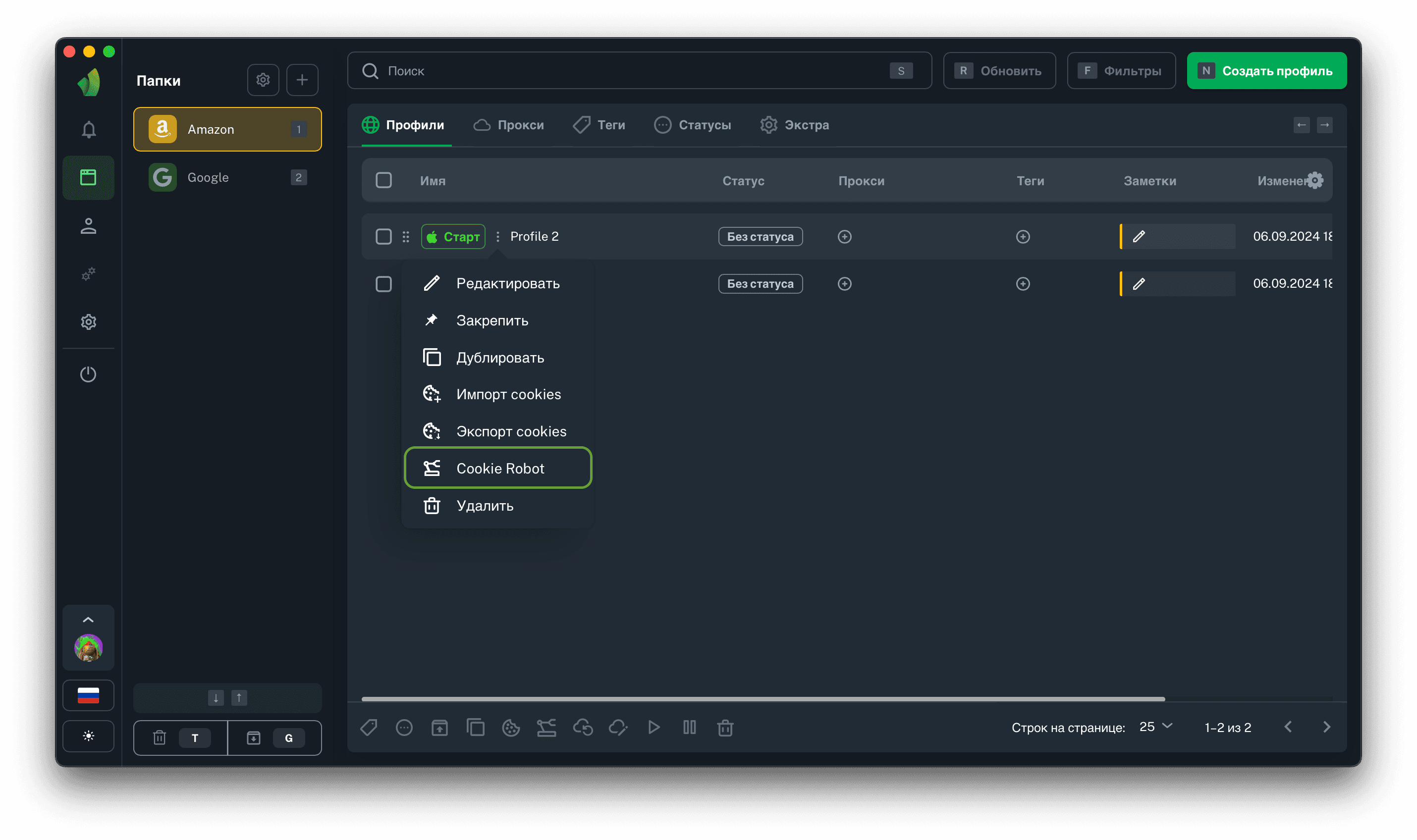 Запустить Cookie-робот можно массово (сразу на нескольких профилях) или на одном профиле.