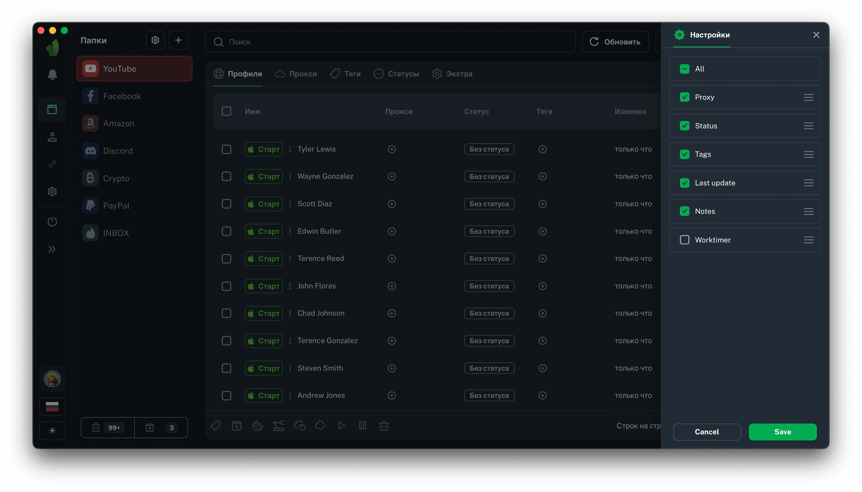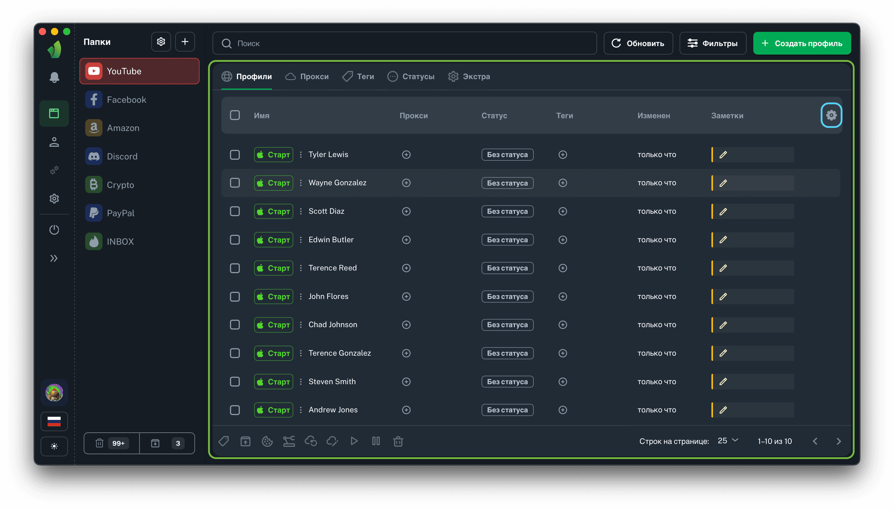На скриншоте выше зелёным цветом обведена таблица с браузерными профилями. Рядом с каждым профилем есть кнопка Старт для запуска конкретно этого профиля, а также ряд параметров: название, прокси, статус, теги, заметки.