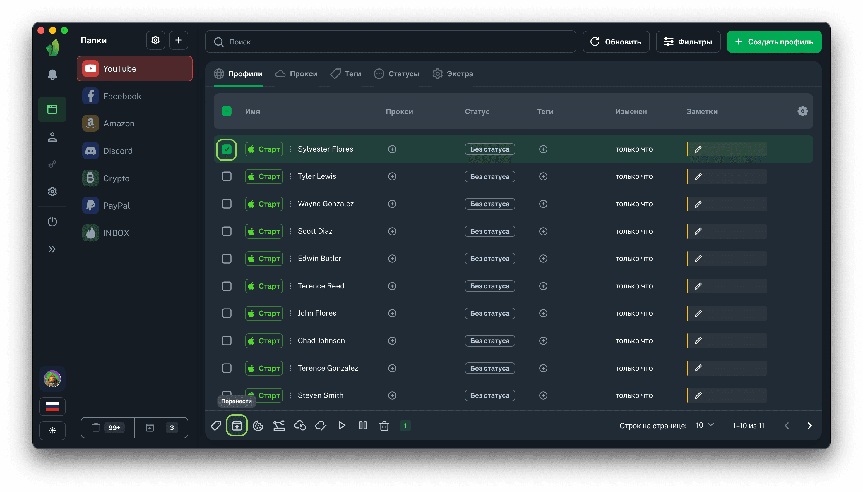 Сделать это очень просто: выделяете нужный профиль, в меню массовых действий нажимаете на иконку Передачи профиля, в открывшемся сайдбаре выбираете папку, в которую хотите перенести профиль, нажимаете кнопку Перенести.