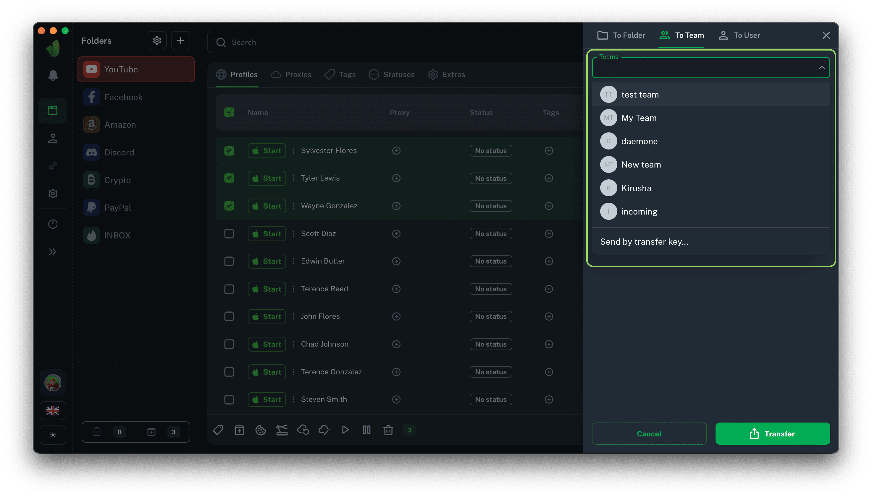Сама передача выглядит следующим образом: в сайдбаре передачи профилей, на вкладке В команду необходимо в поле выбора команды выбрать пункт Отправить по трансфер ключу, он всегда в самом низу списка. При выборе данного пункта появится дополнительное поле для ввода трансфер ключа. Необходимо вставить его в соответствующее поле и при необходимости включить свитчер Передача с прокси