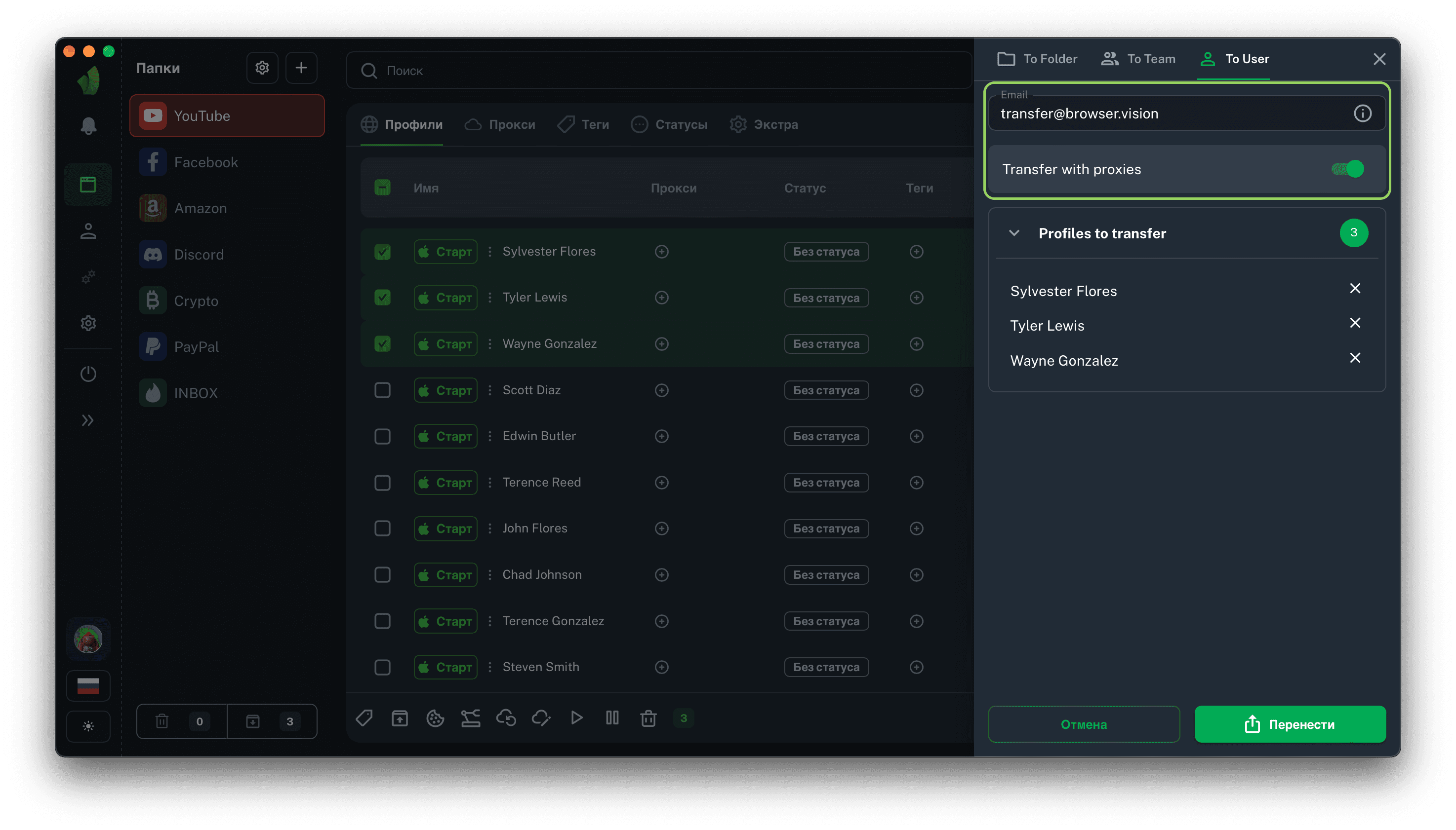 Вводим почту пользователя, которому хотим передать профиль, активируем свитчер передачи с прокси (при необходимости) и нажимаем кнопку Перенести