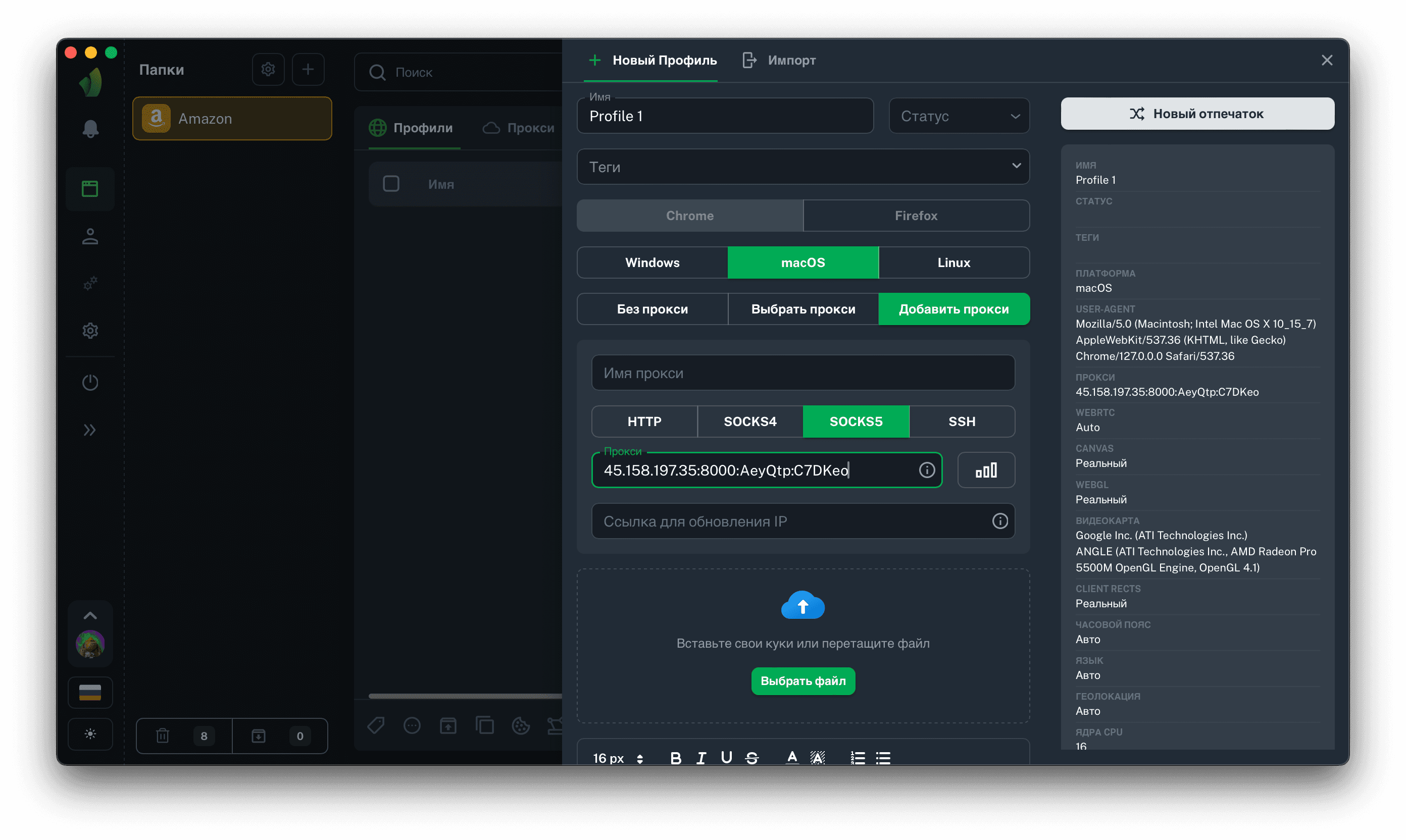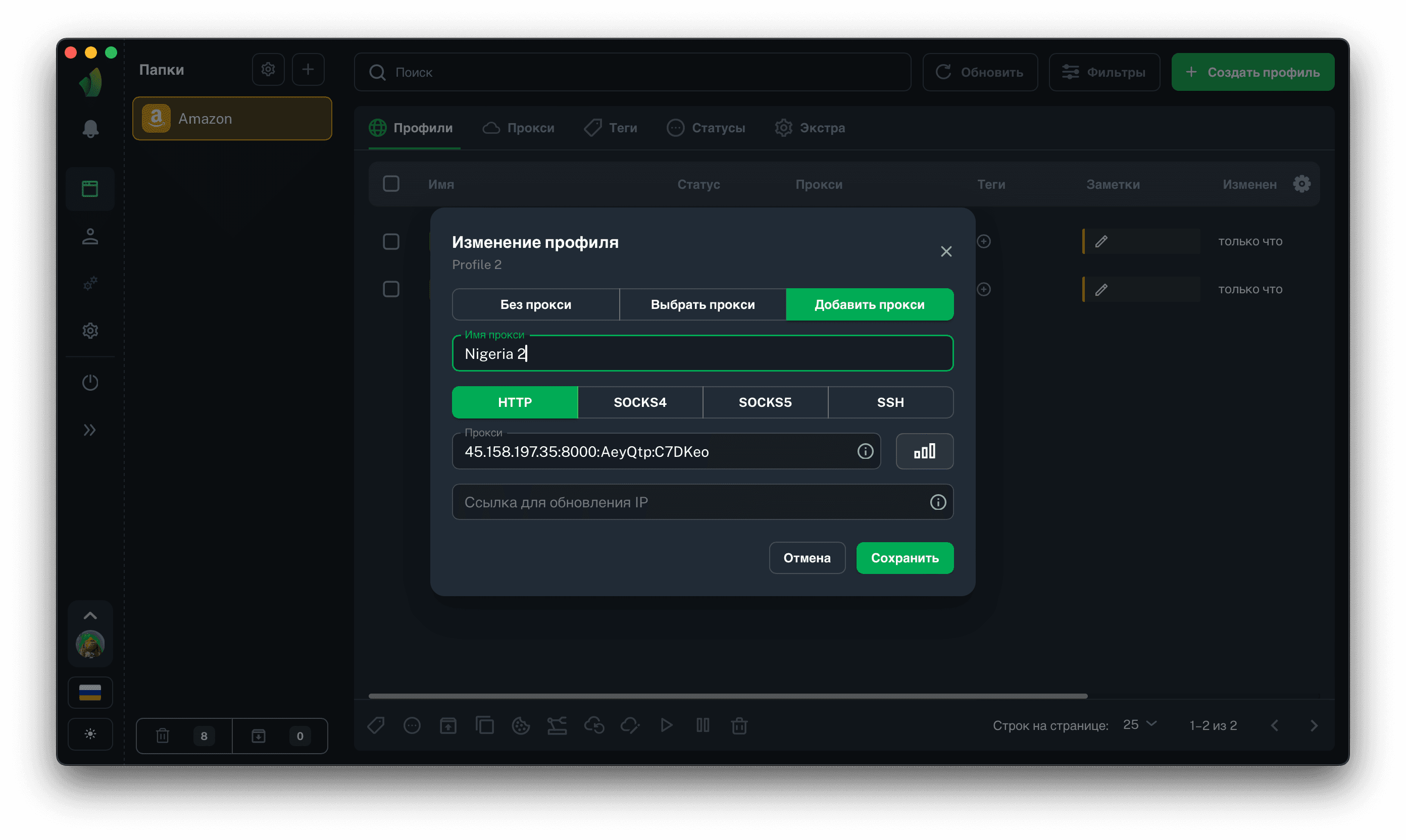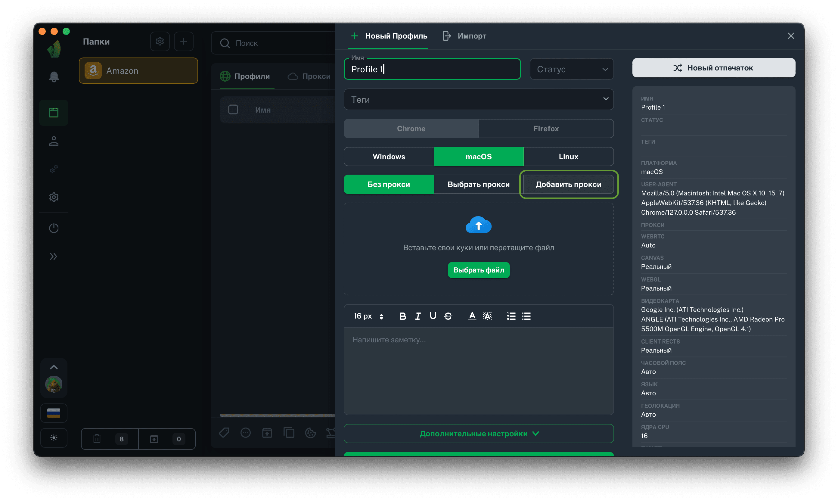 Ещё один способ - добавление прокси в сайдбаре создания профиля. Способ полностью аналогичен предыдущему, меняется лишь место добавления.