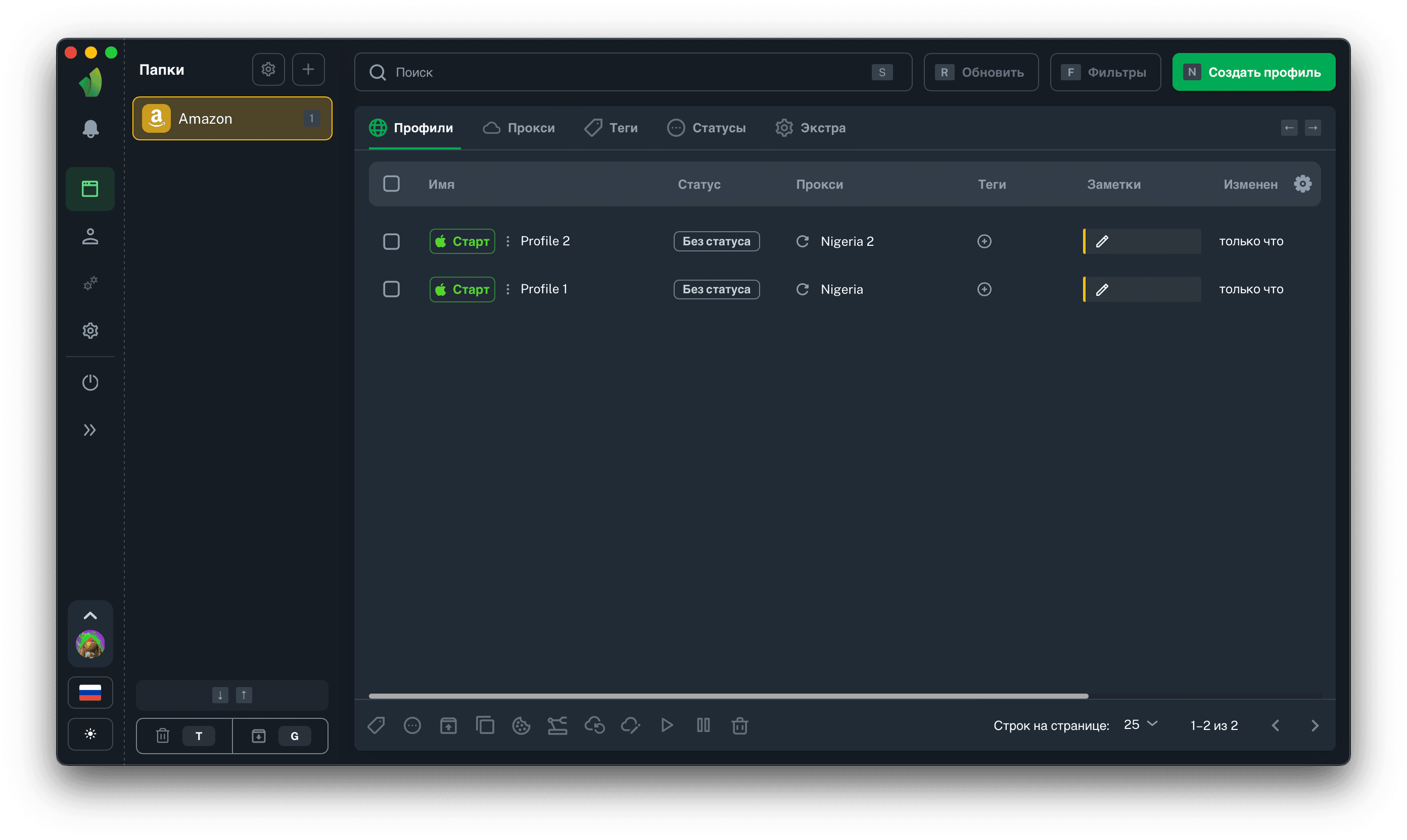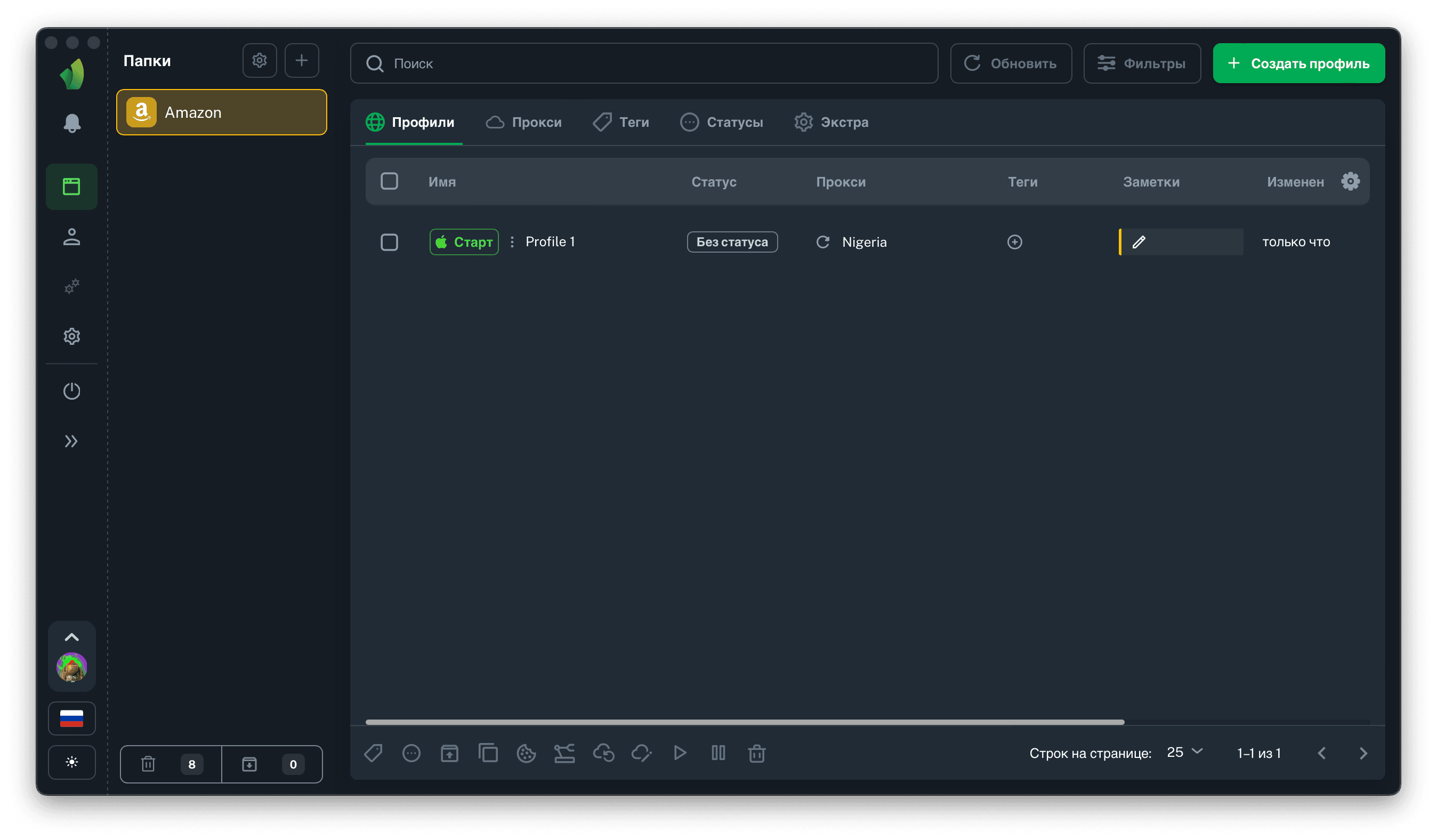На вкладке Профили нажмите кнопку Создать профиль, в открывшемся сайдбаре создания профиля нажмите Добавить прокси (выделена зелёным цветом)
