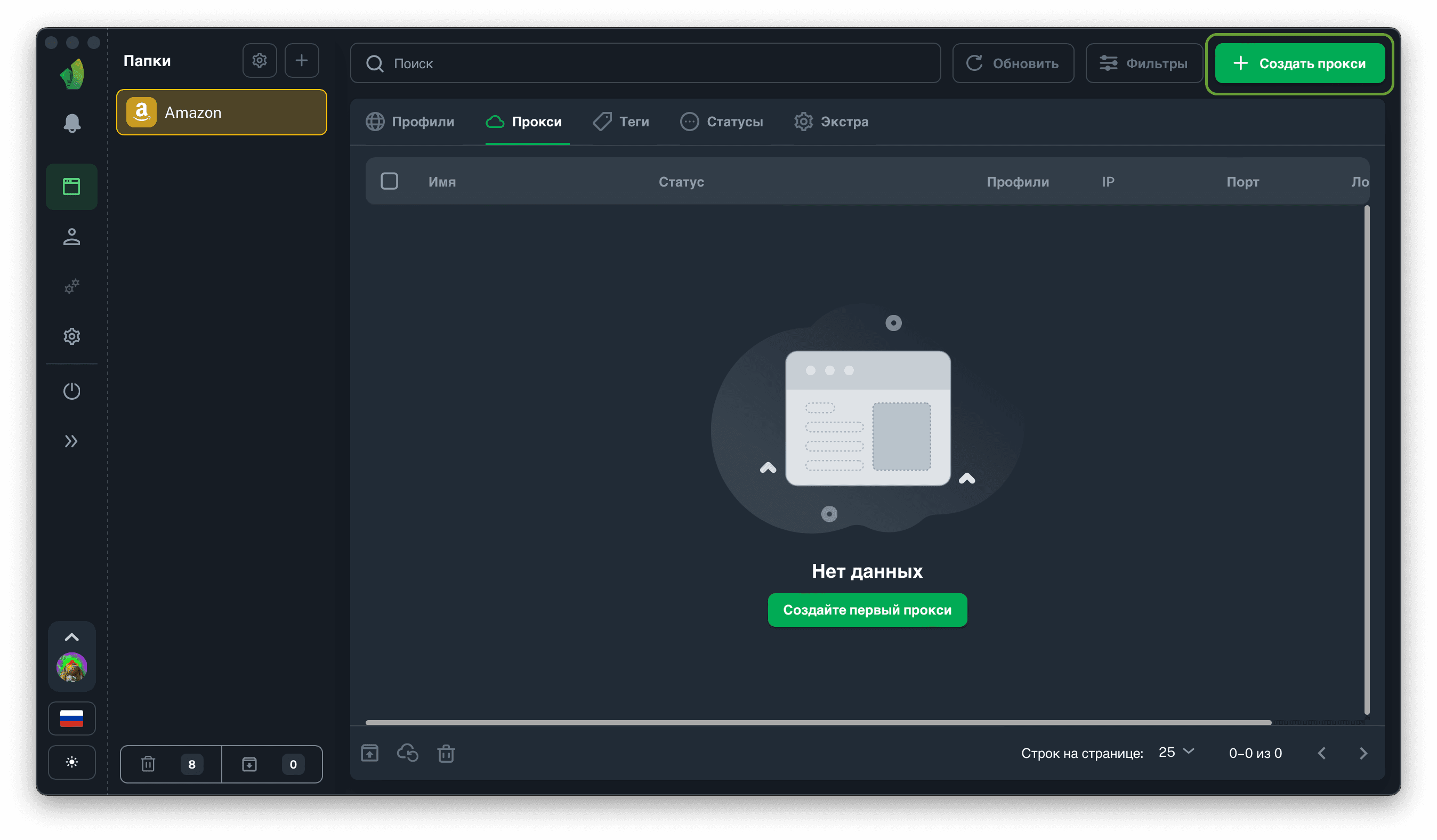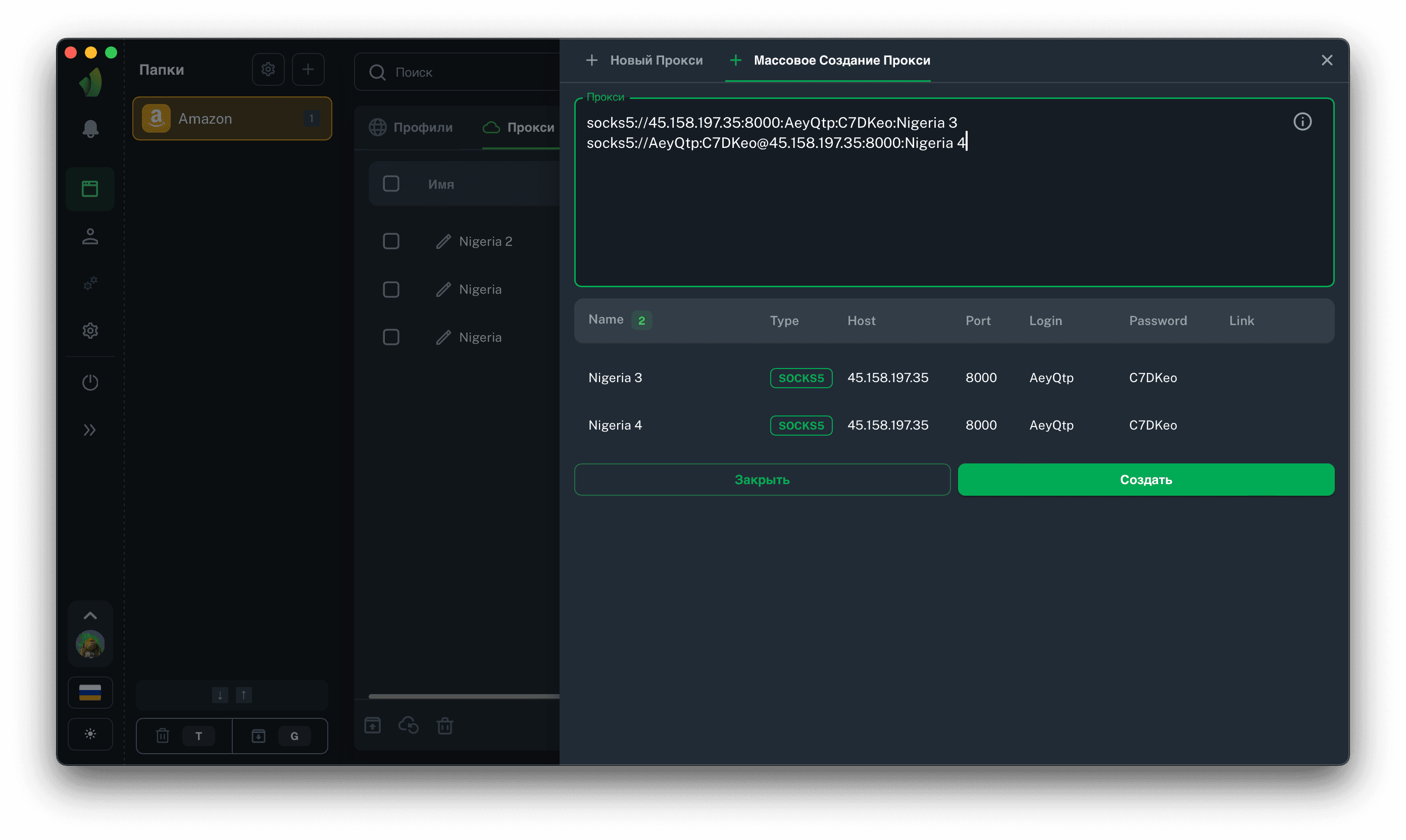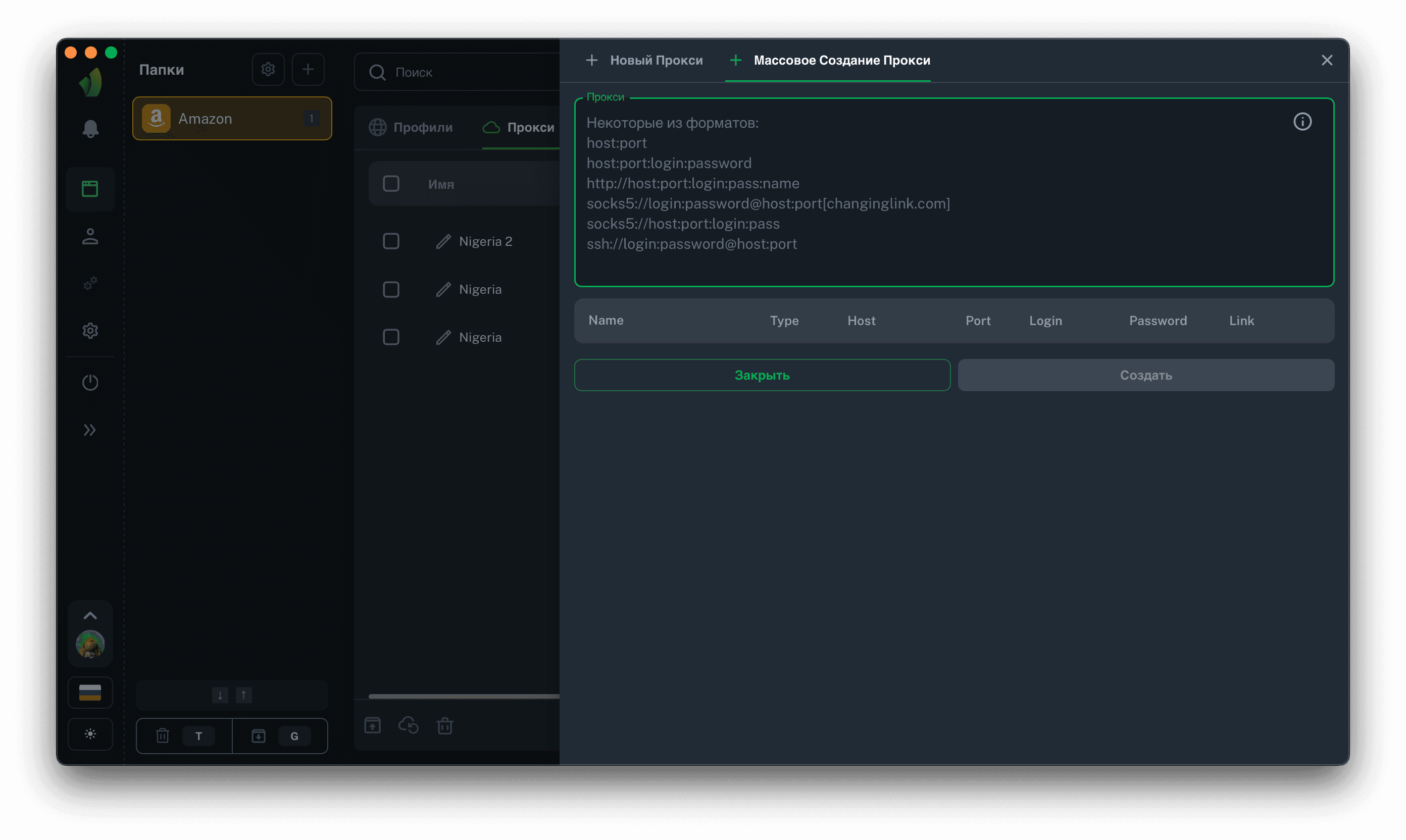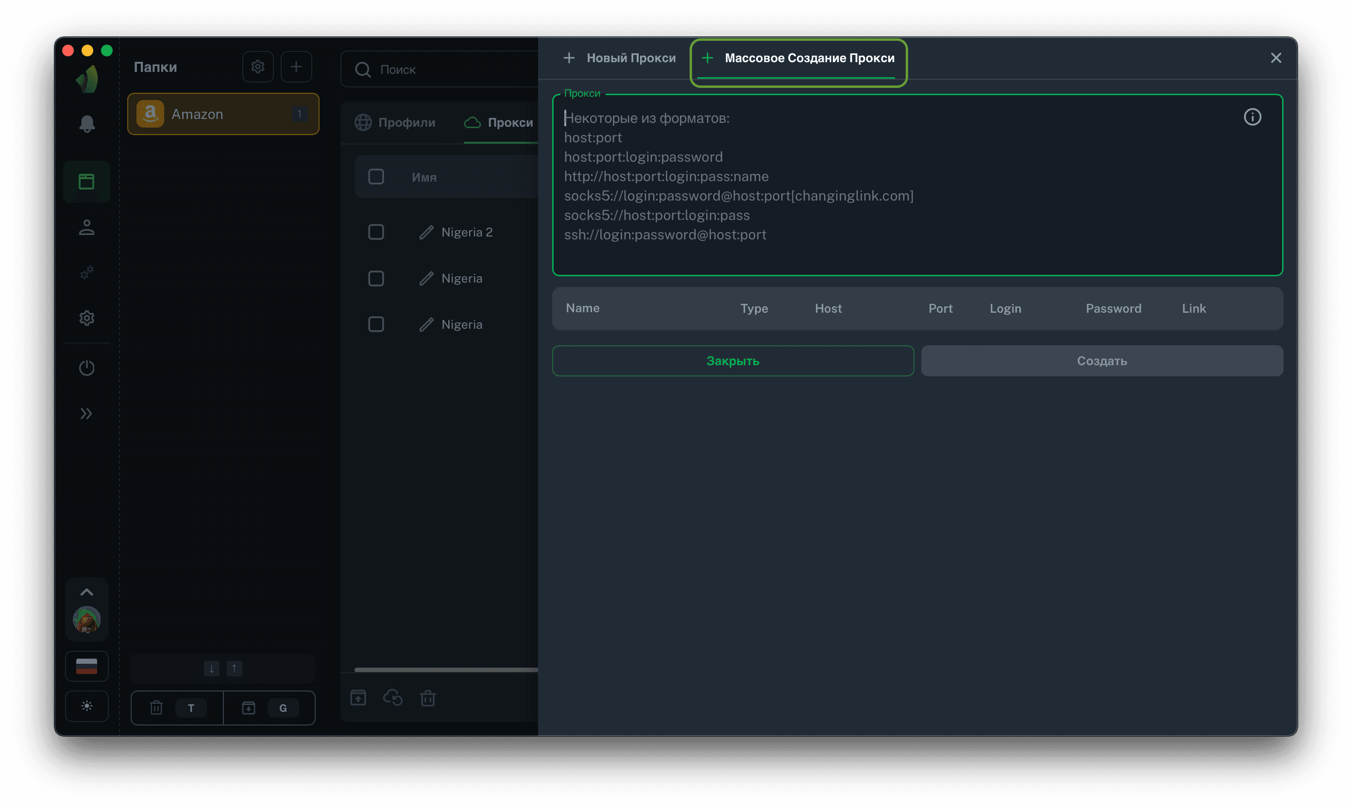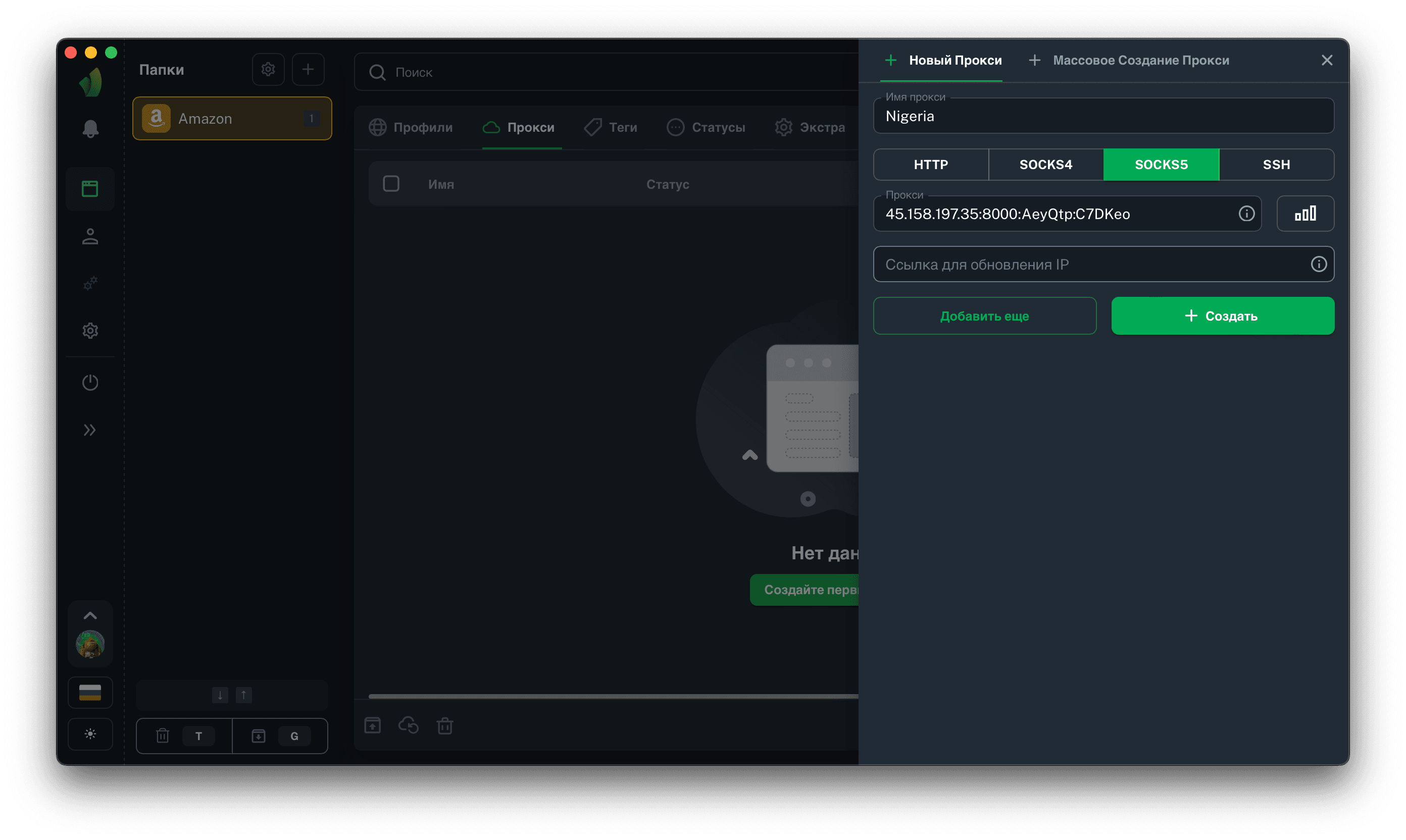 Для того, чтобы добавить прокси, необходимо нажать на кнопку Создать прокси, ввести все необходимые данные в сайдбаре создания прокси, а затем нажать на кнопку Создать.