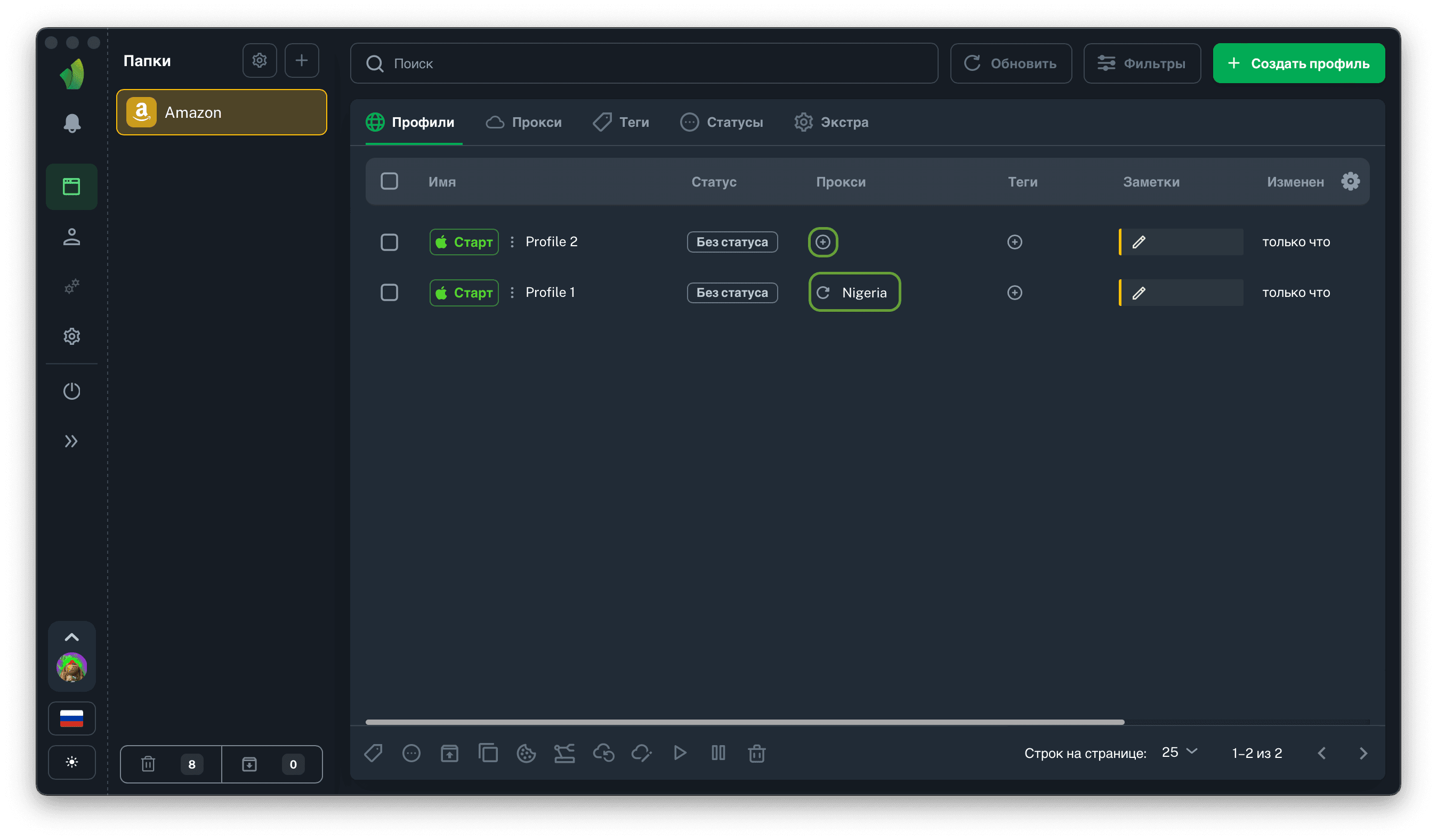 Следующий способ добавления прокси доступен в таблице браузерных профилей на вкладке Профили. Если у вас включен к отображению столбец Прокси в таблице профилей - вы сможете не только сменить прокси на конкретном профиле, но и добавить новый прокси.