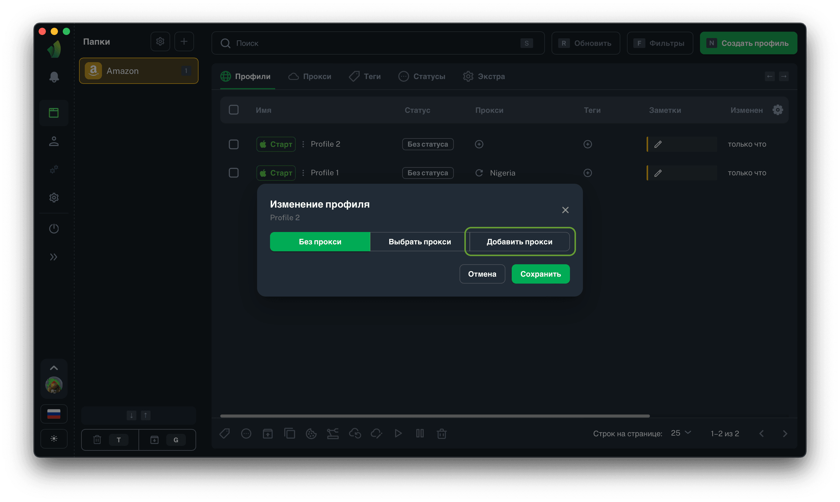 На вкладке Профили, в столбце Прокси нажмите на иконку + или на название прокси, которые сейчас привязаны к профилю (обведено зелёным цветом)