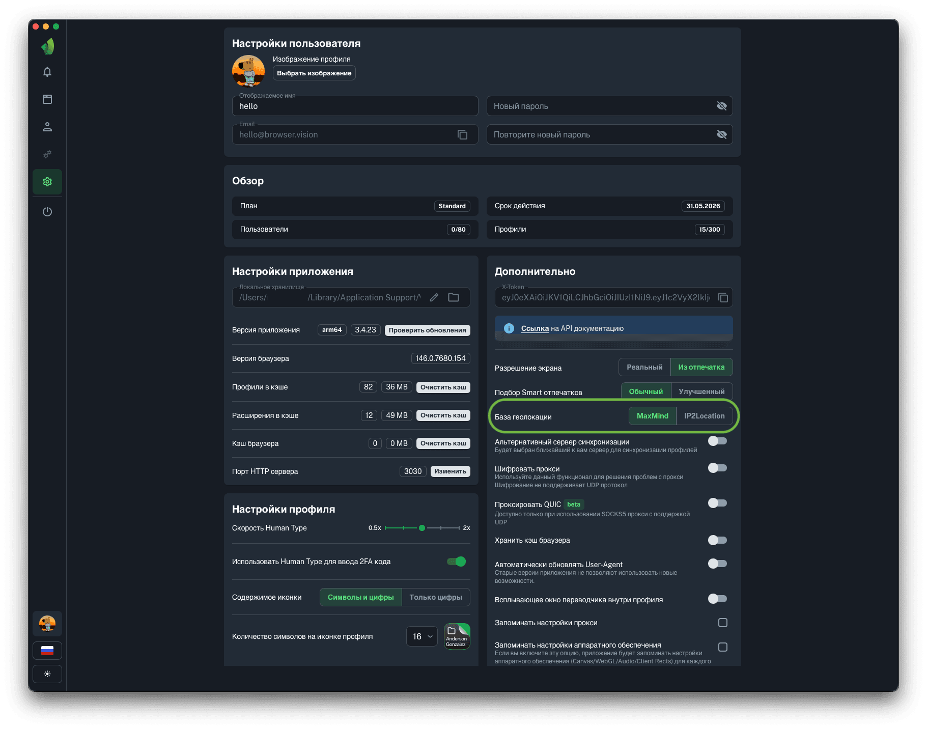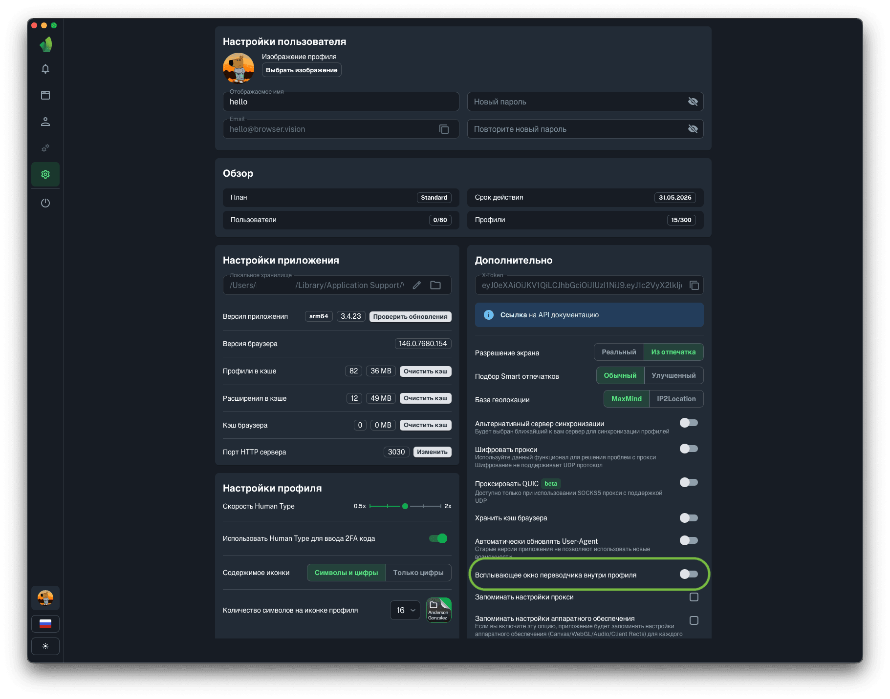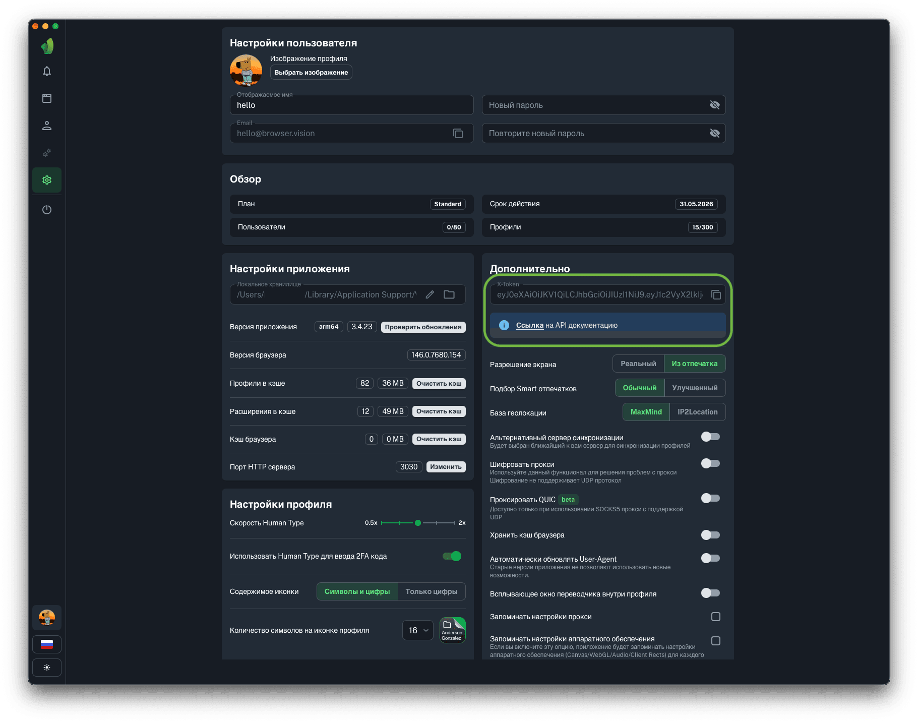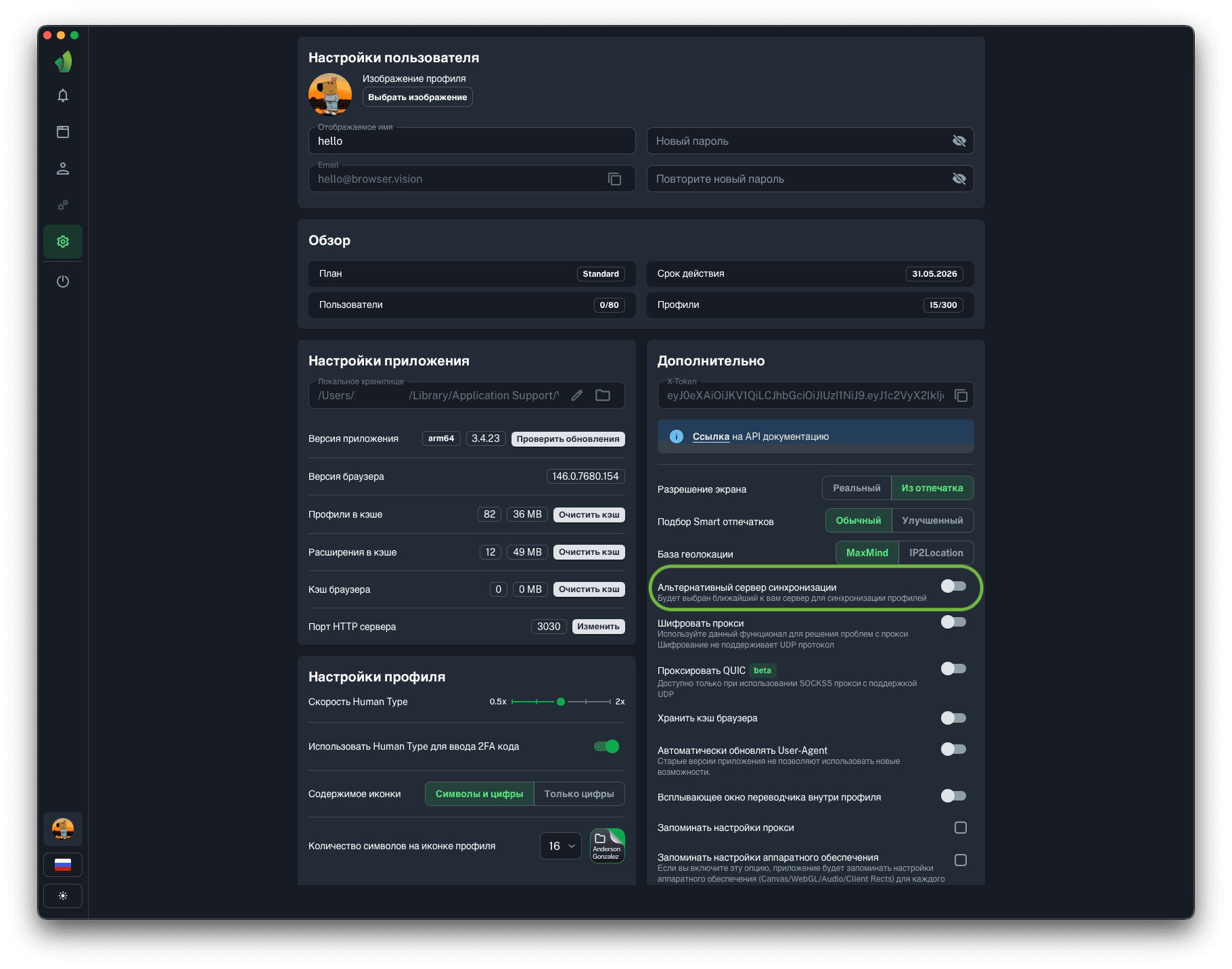 Для запуска профилей по API понадобится порт HTTP сервера, на который будут отправляться запросы на запуск и остановку профилей. Вы можете изменить порт HTTP сервера на любой, в диапазоне от 1025 до 65534 нажав на кнопку Изменить (обведена зелёным на скриншоте).