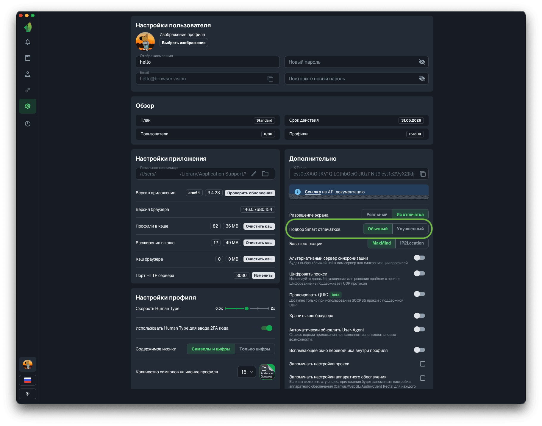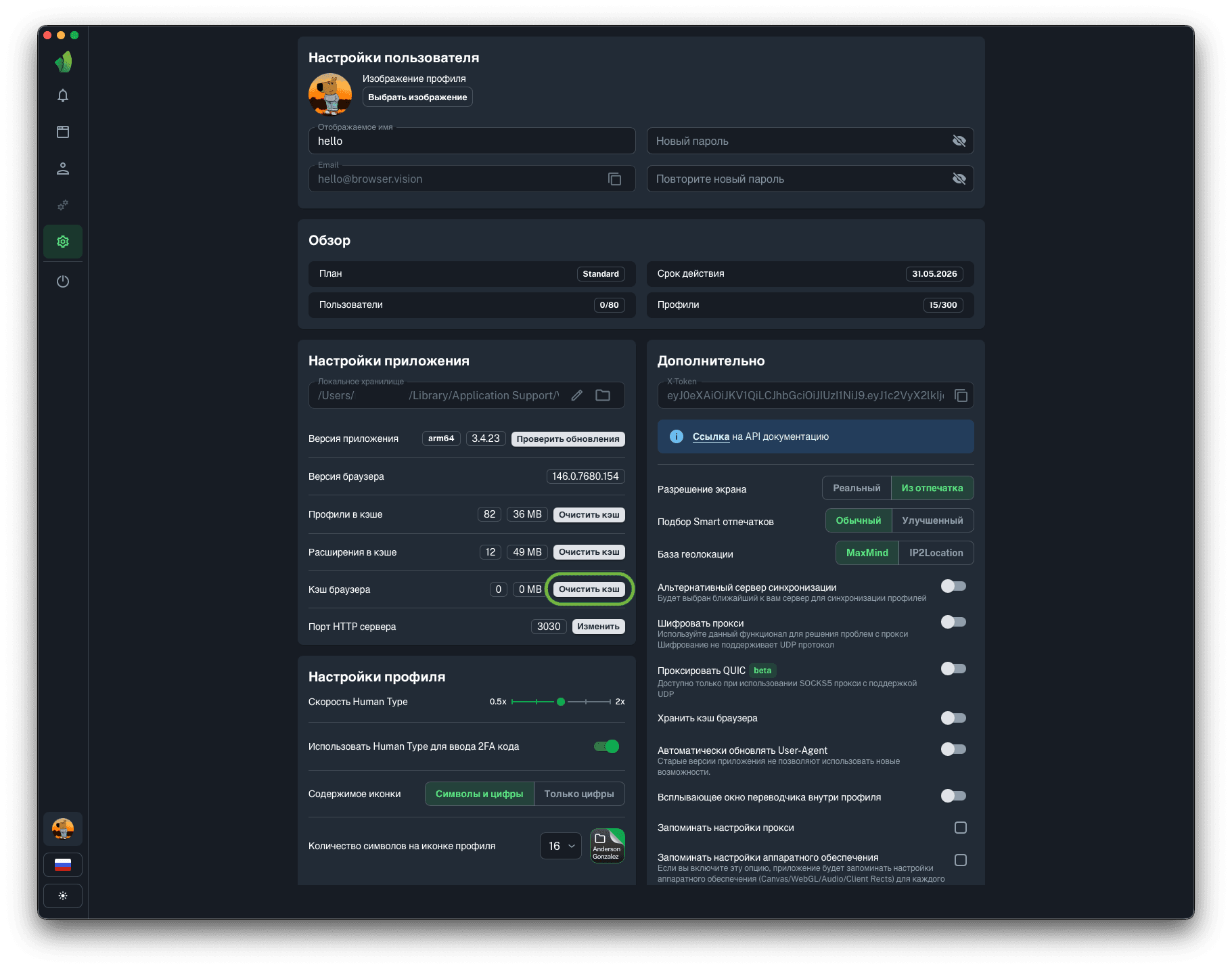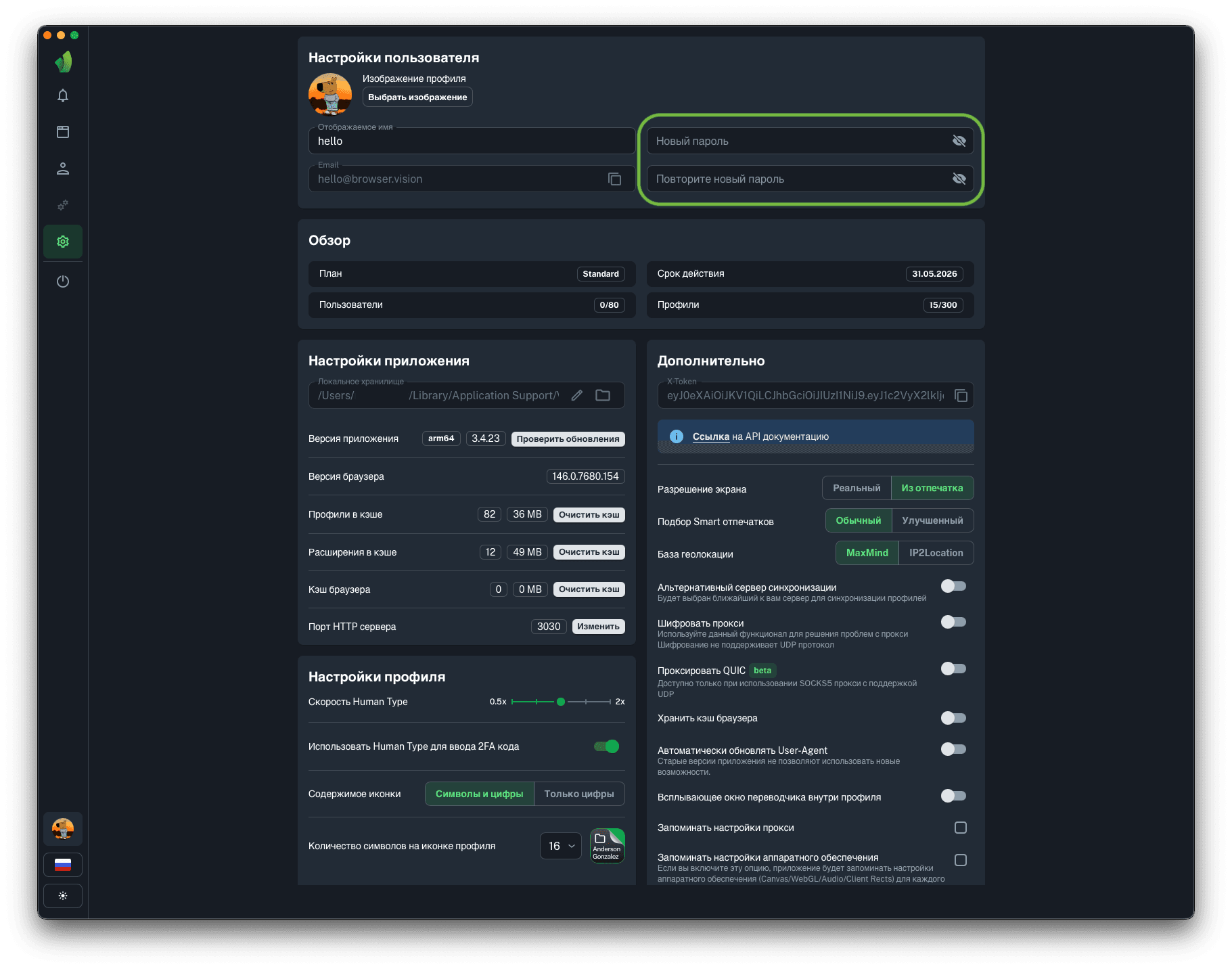 Для запуска профилей по API понадобится порт HTTP сервера, на который будут отправляться запросы на запуск и остановку профилей. Вы можете изменить порт HTTP сервера на любой, в диапазоне от 1025 до 65534 нажав на кнопку Изменить (обведена зелёным на скриншоте).