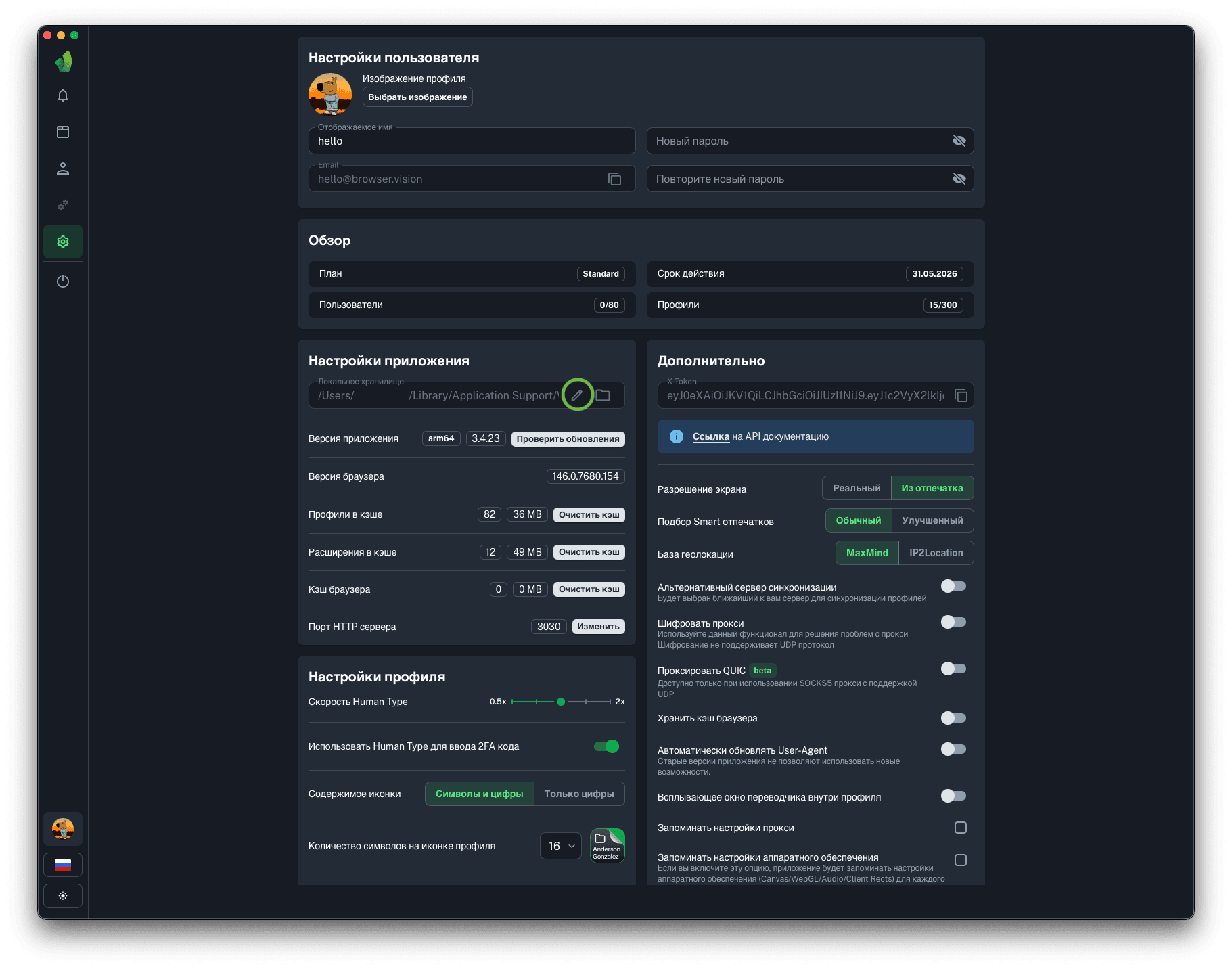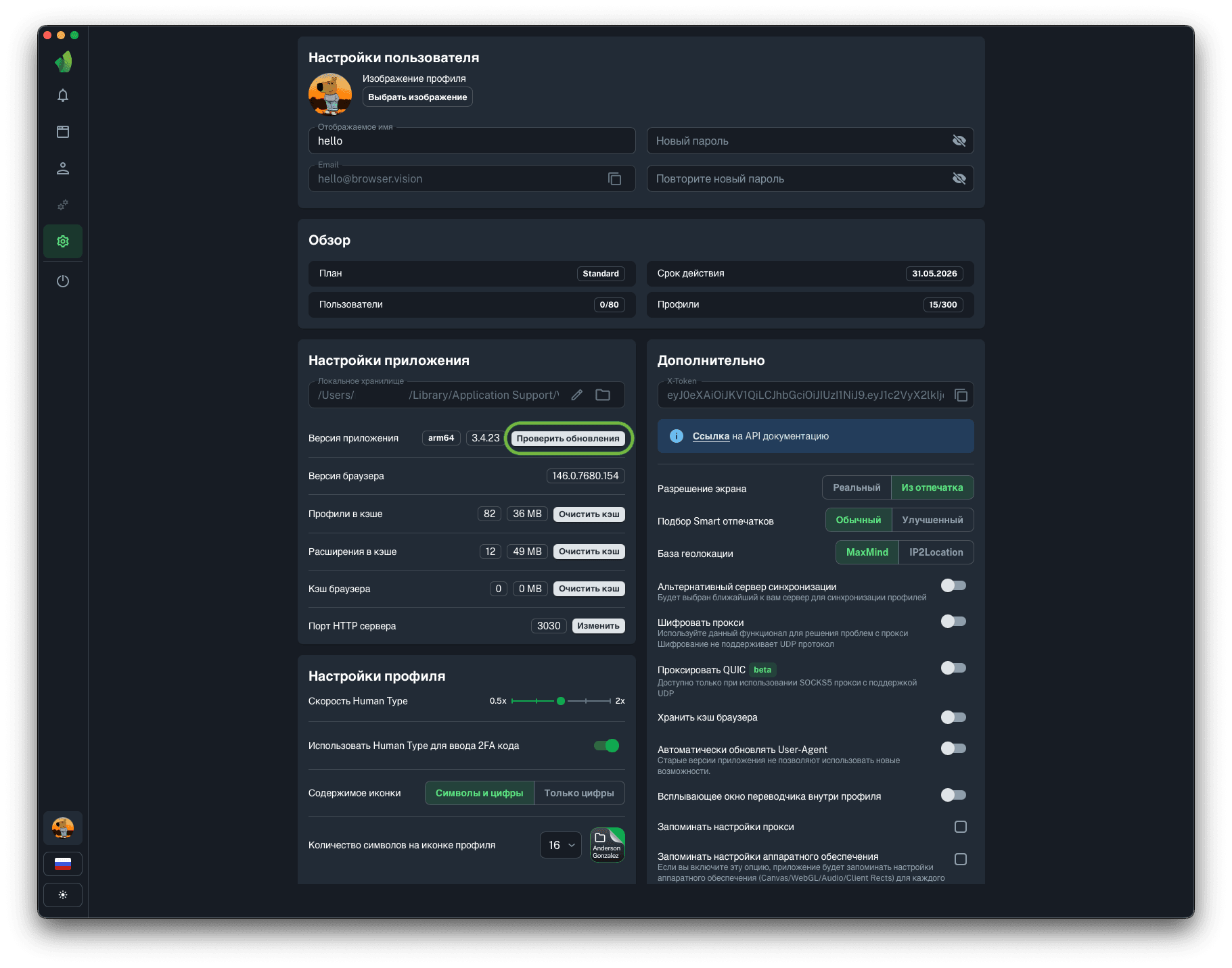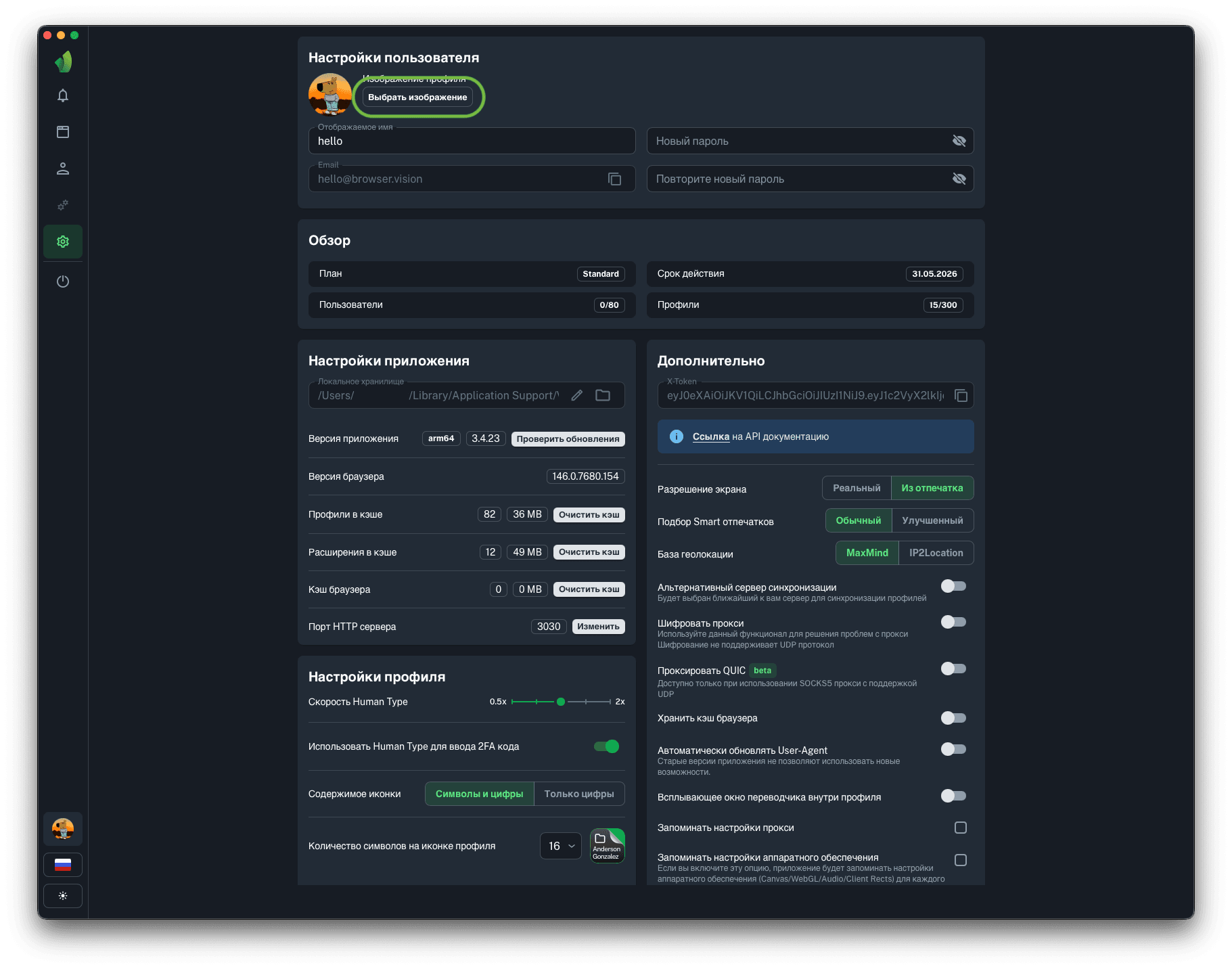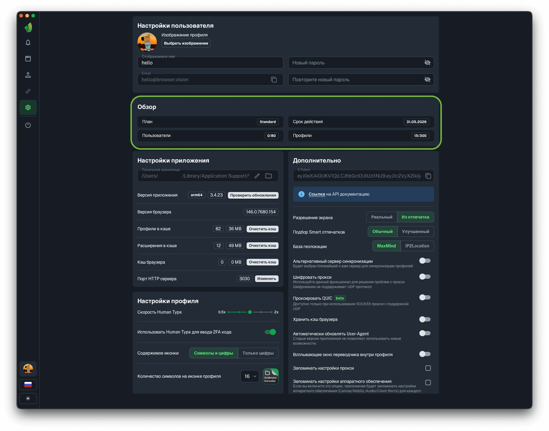 Для запуска профилей по API понадобится порт HTTP сервера, на который будут отправляться запросы на запуск и остановку профилей. Вы можете изменить порт HTTP сервера на любой, в диапазоне от 1025 до 65534 нажав на кнопку Изменить (обведена зелёным на скриншоте).