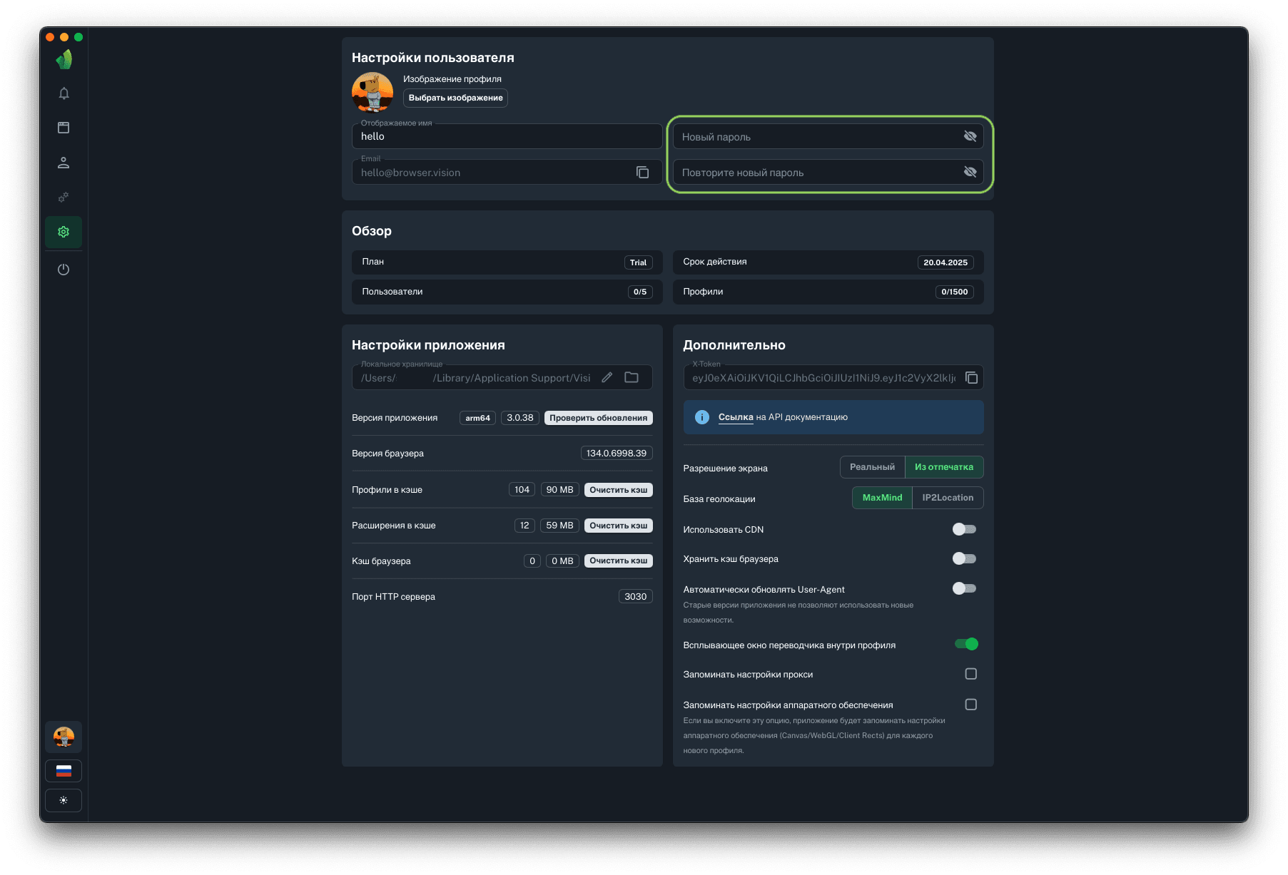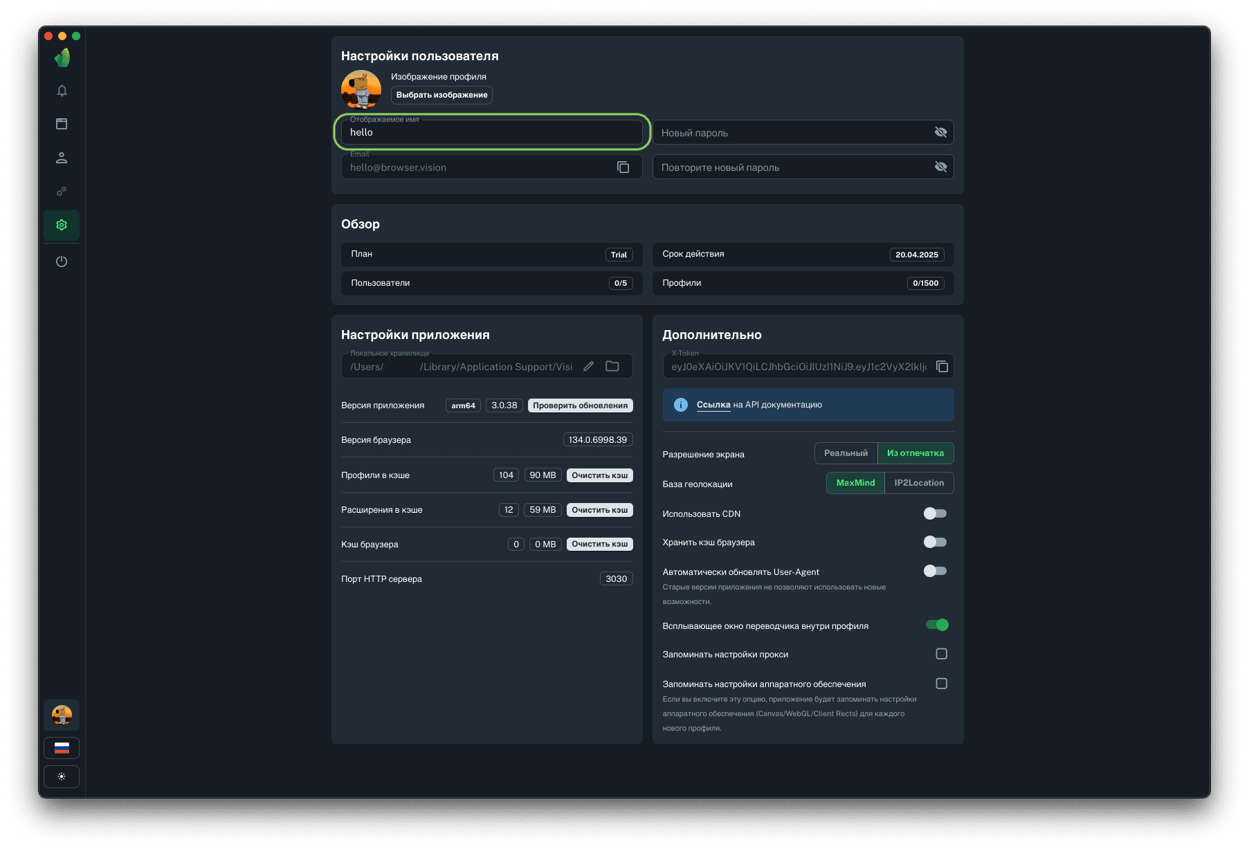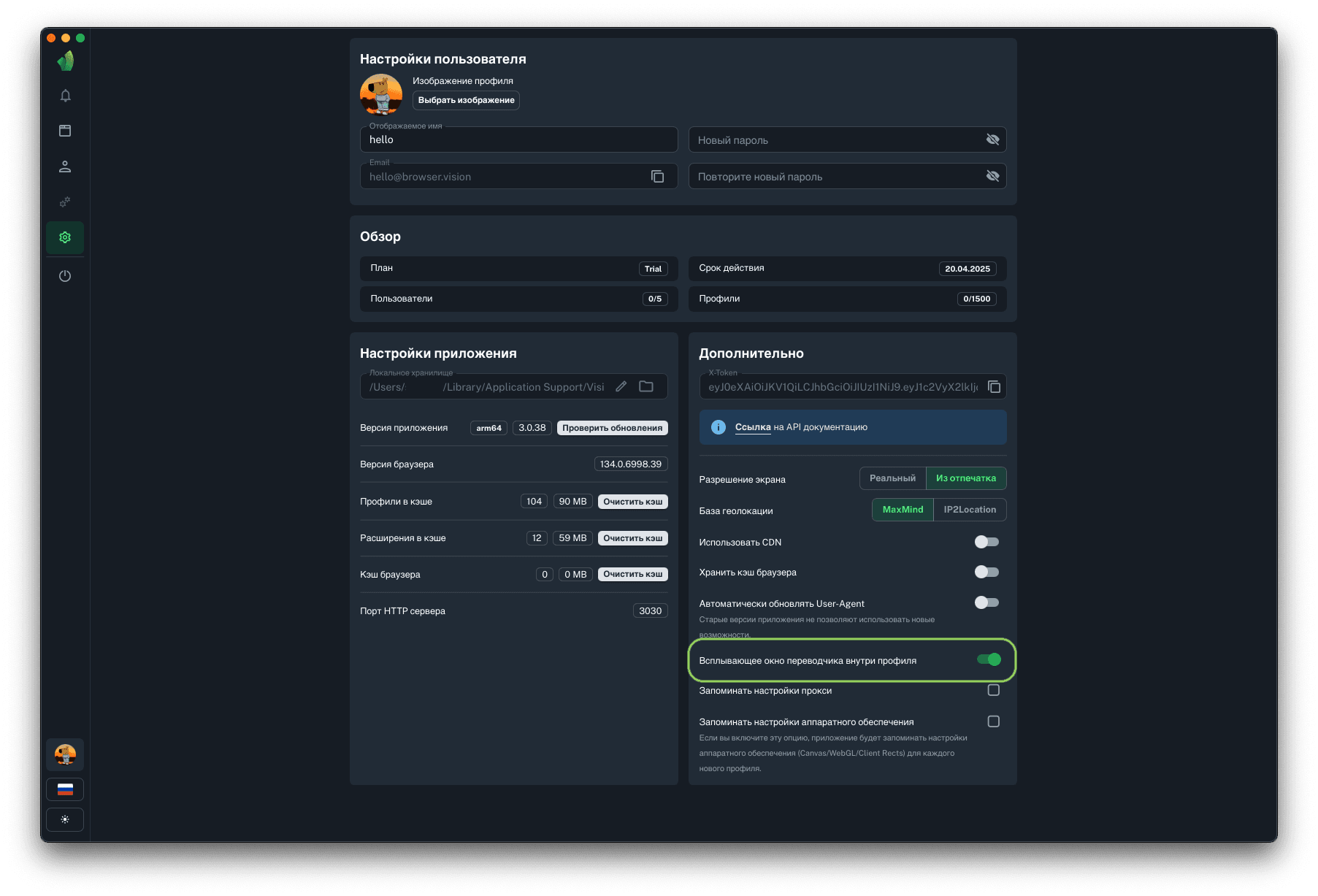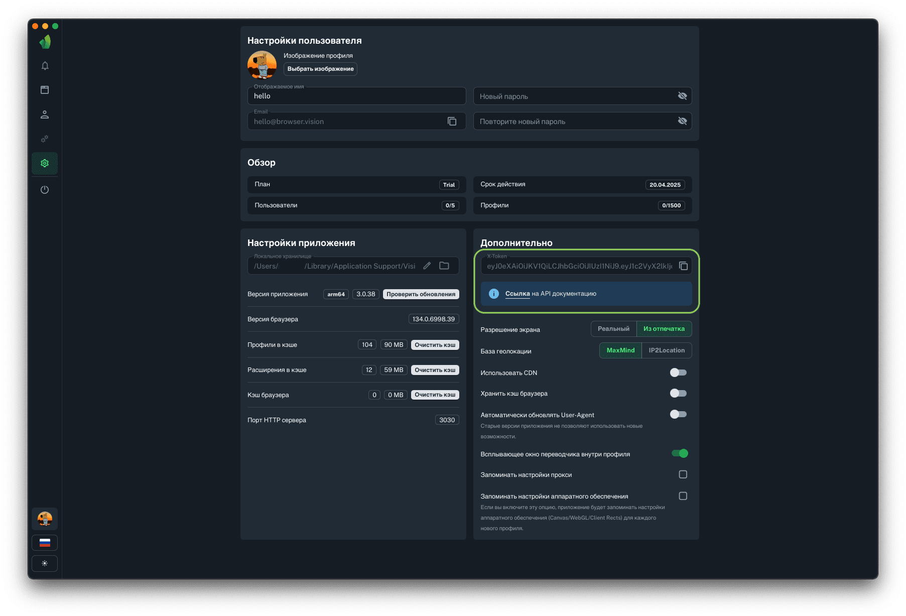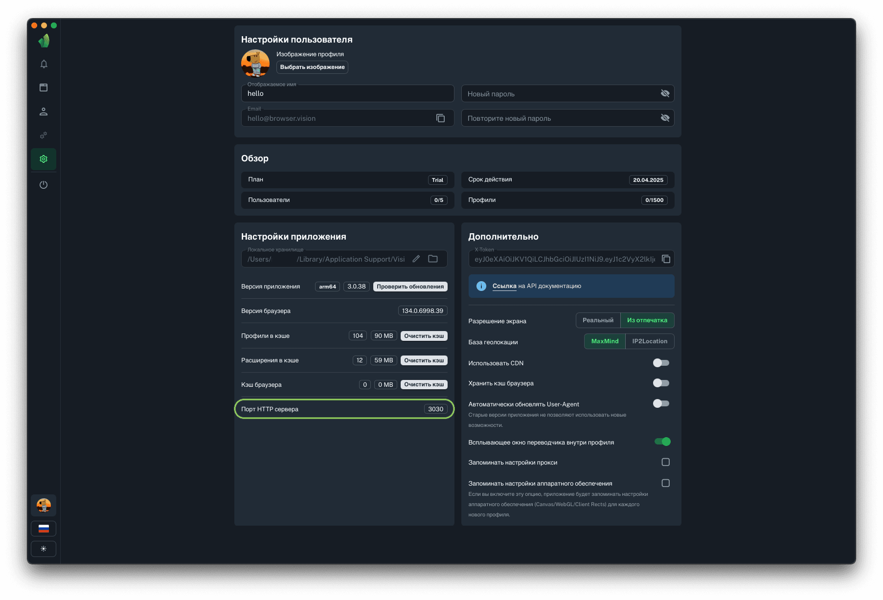 Для запуска профилей по API понадобится порт HTTP сервера, на который будут отправляться запросы на запуск и остановку профилей. Данный параметр не подлежит изменению.