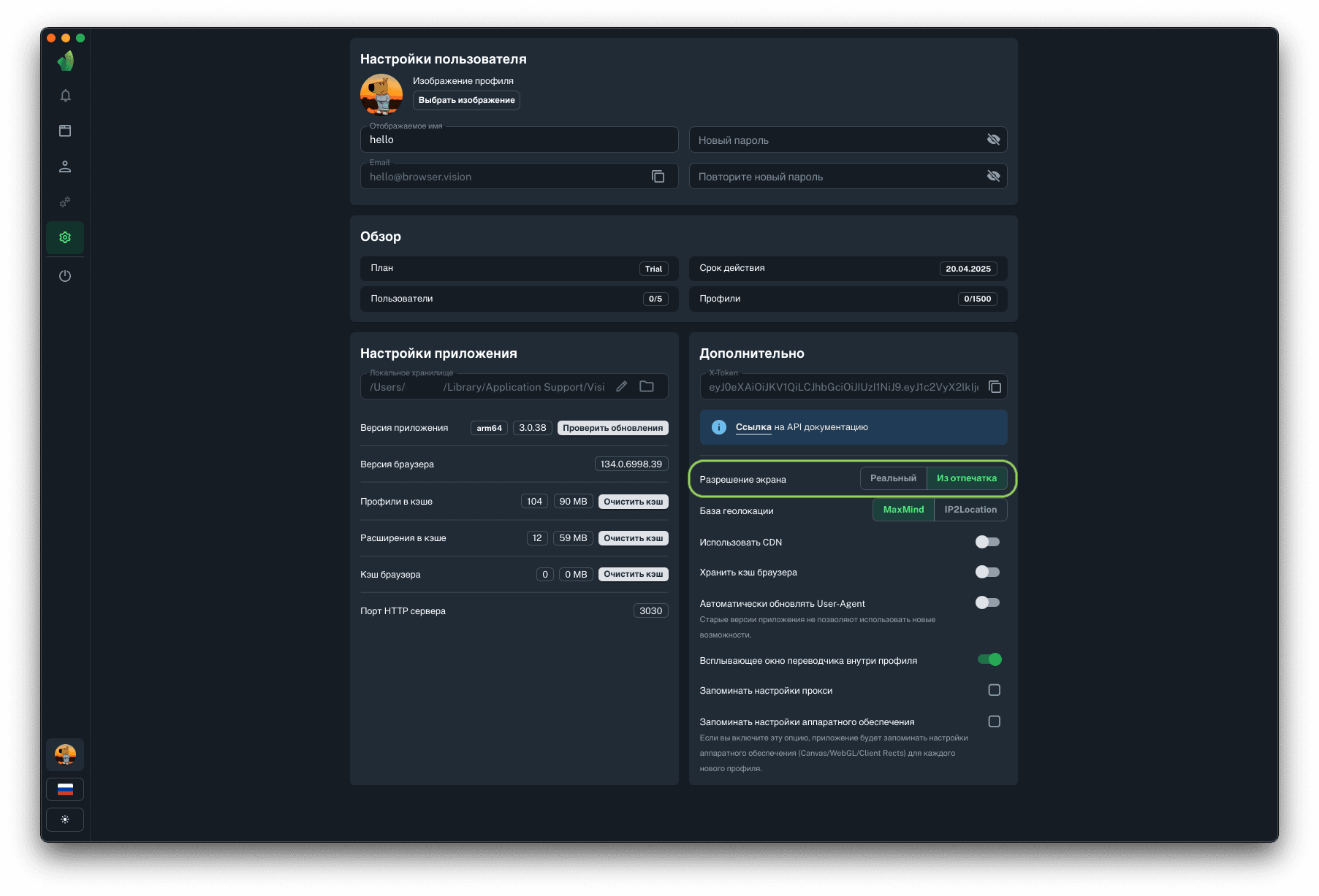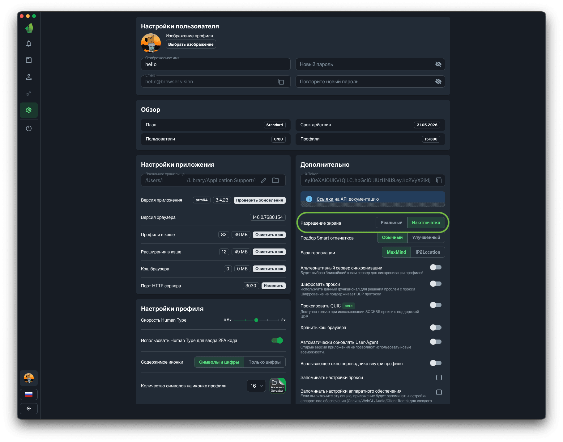 Если выбран вариант Из отпечатка, то каждый новый профиль будет создан с тем расширением, которое было указано в его отпечатке. Это однозначно повышает траст, так как исключается возможность выбора разрешения, не свойственного данного типа устройству. Например: не существует устройств MacBook с разрешением 640х480 пикселей. Однако, если указать в профиле для MacOS подобное разрешение, то любой анти-фрод системы могут возникнуть подозрения.