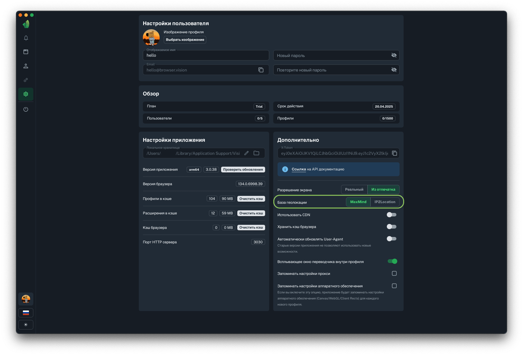 Данный функционал позволяет выбрать одну из двух баз определения геолокации по IP прокси: MaxMind или IP2Location.