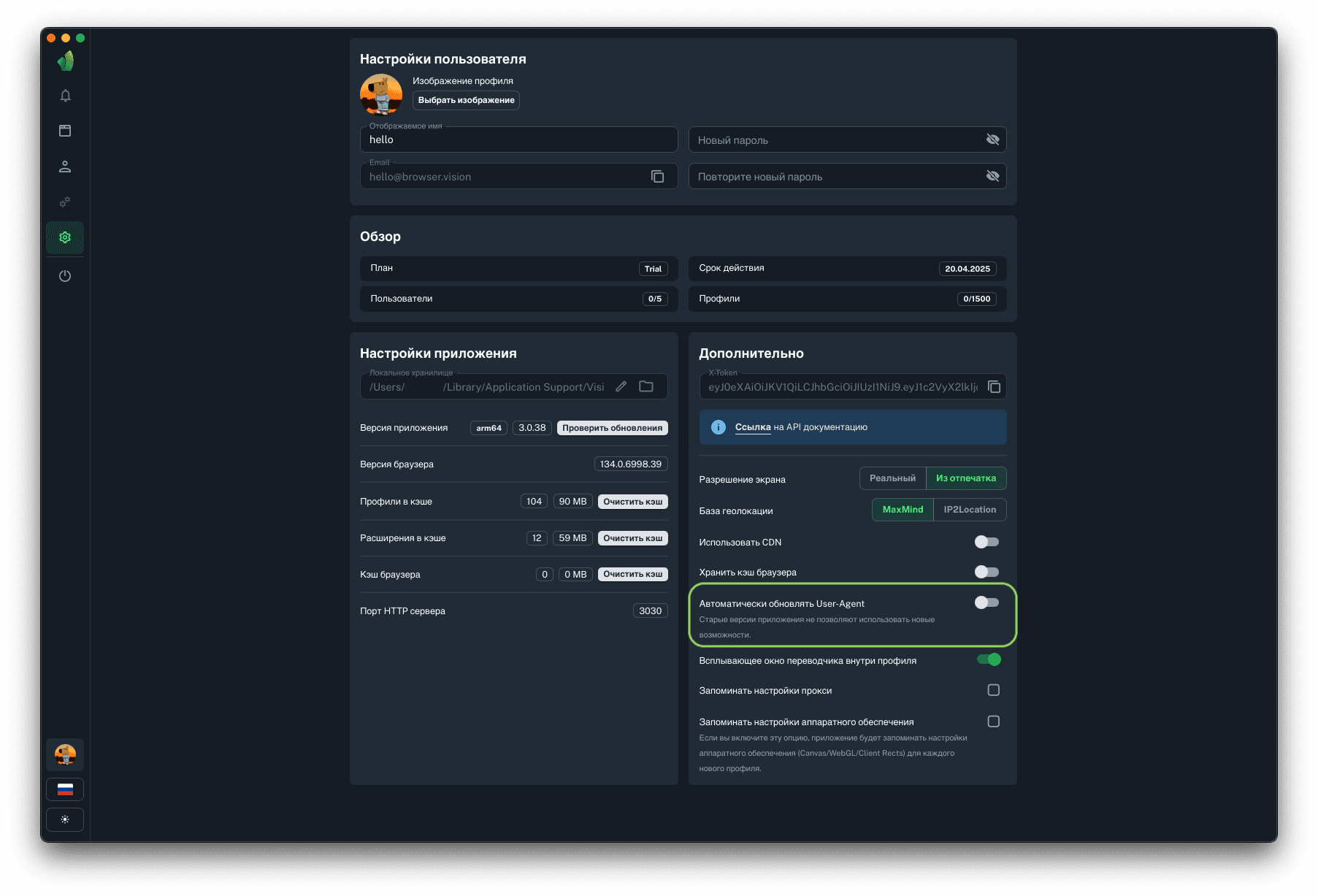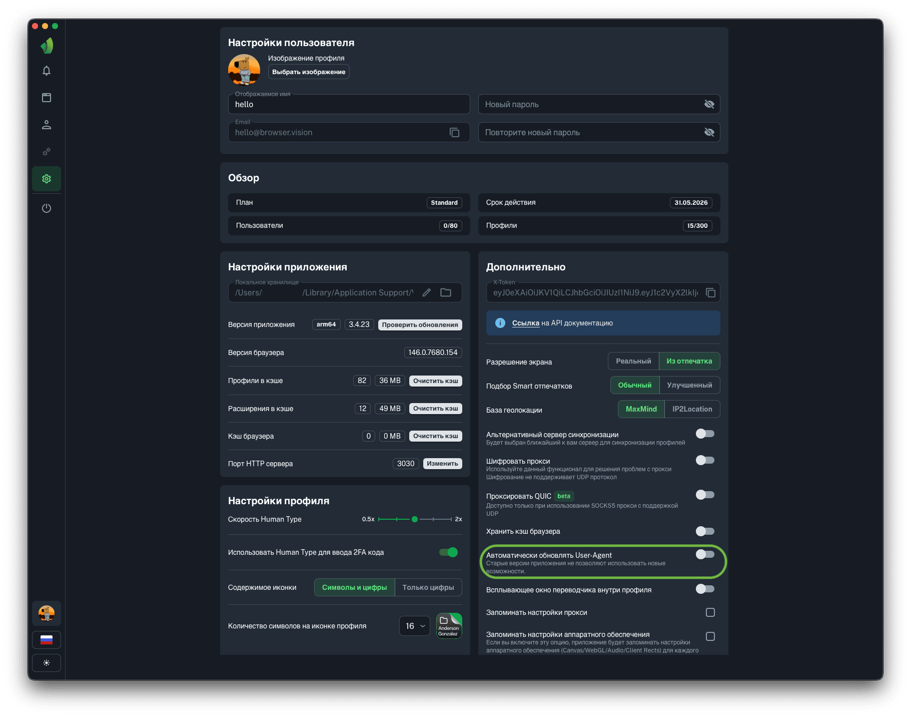 Если функция автоматического обновления User-Agent включена, то после очередного обновления ядра браузера при запуске профиля User-Agent будет автоматически актуализирован.