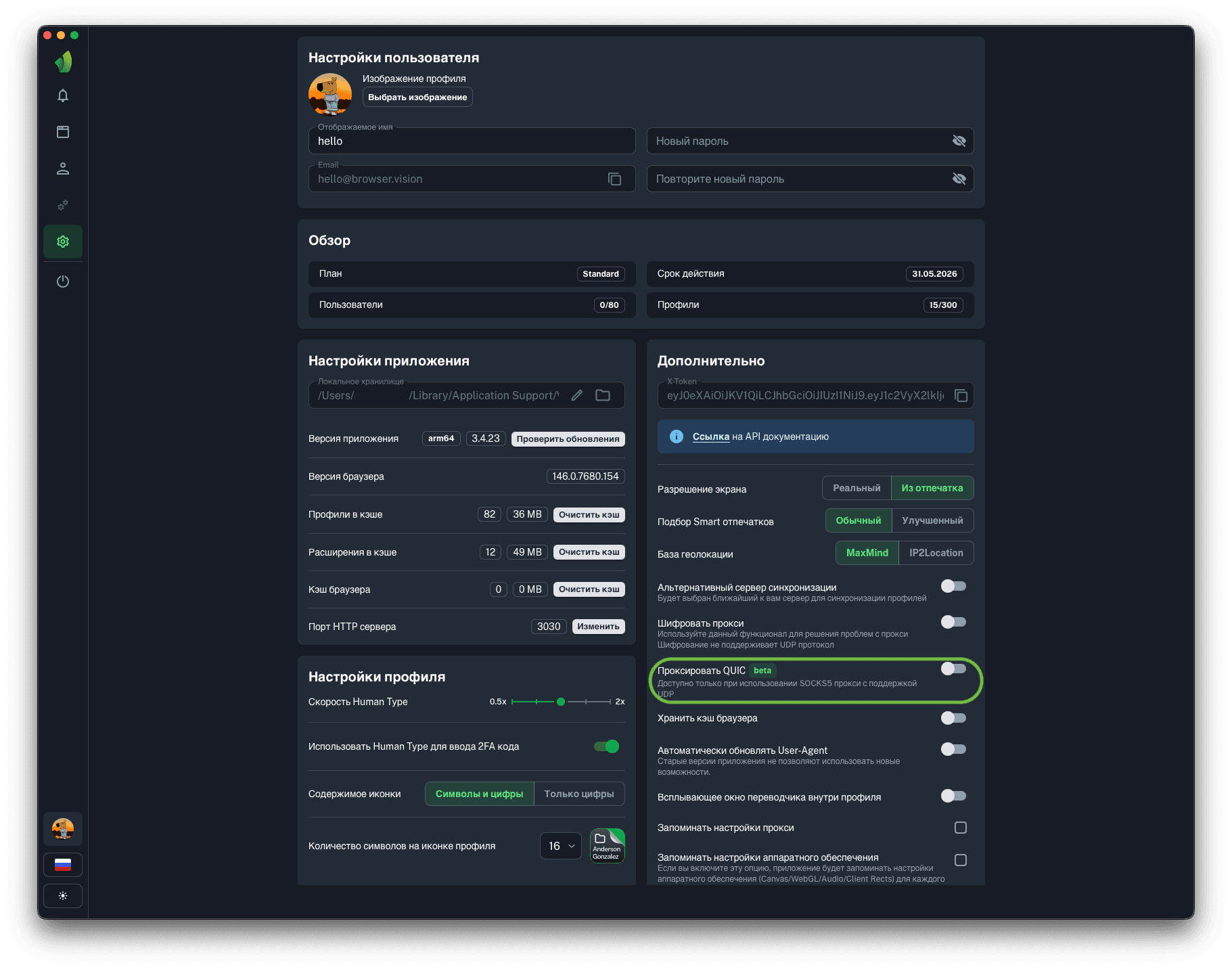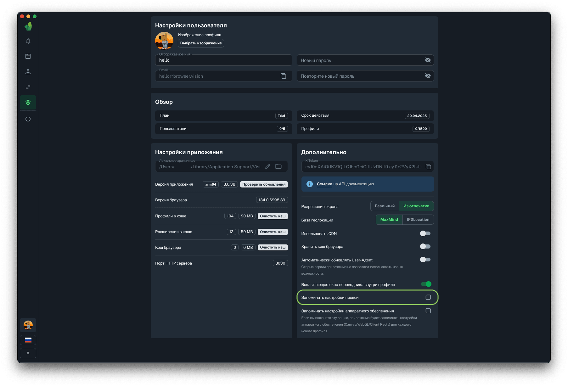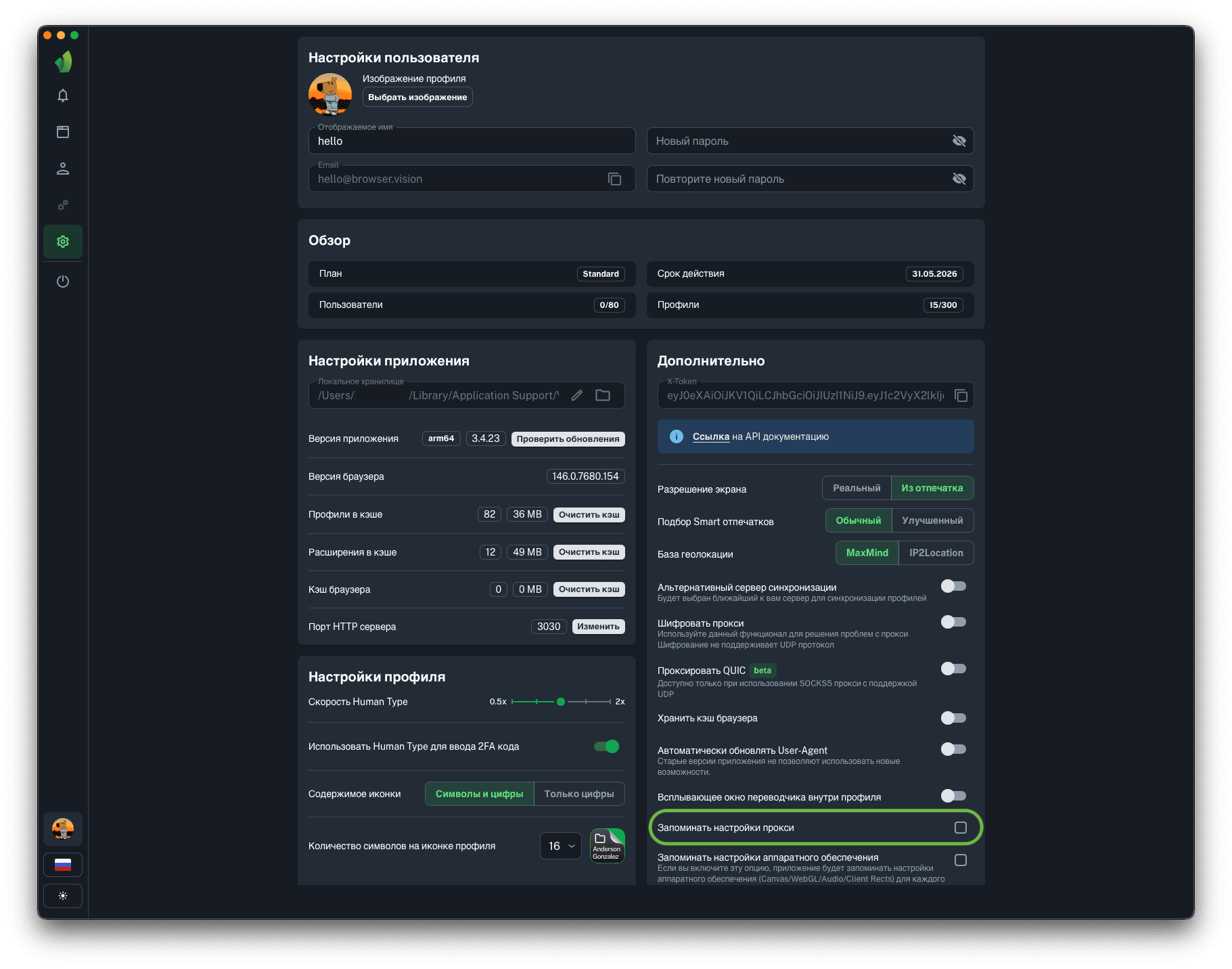 - функционал памяти прокси и настроек профиля