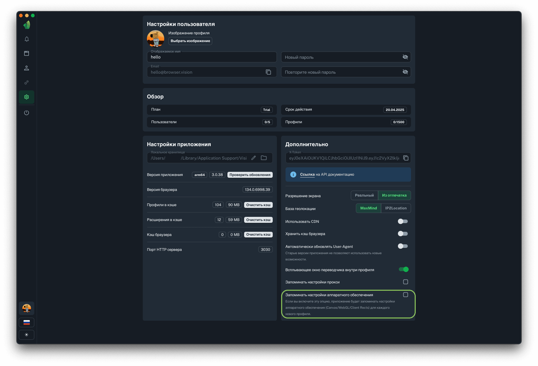 Включение данного функционала позволить запоминать настройки аппаратного обеспечения, которые были выбраны при создании профиля. Это значит, что при следующем открытии сайдбара создания профиля не будет необходимости выбирать те же самые настройки, что были выбраны на предыдущем профиле.