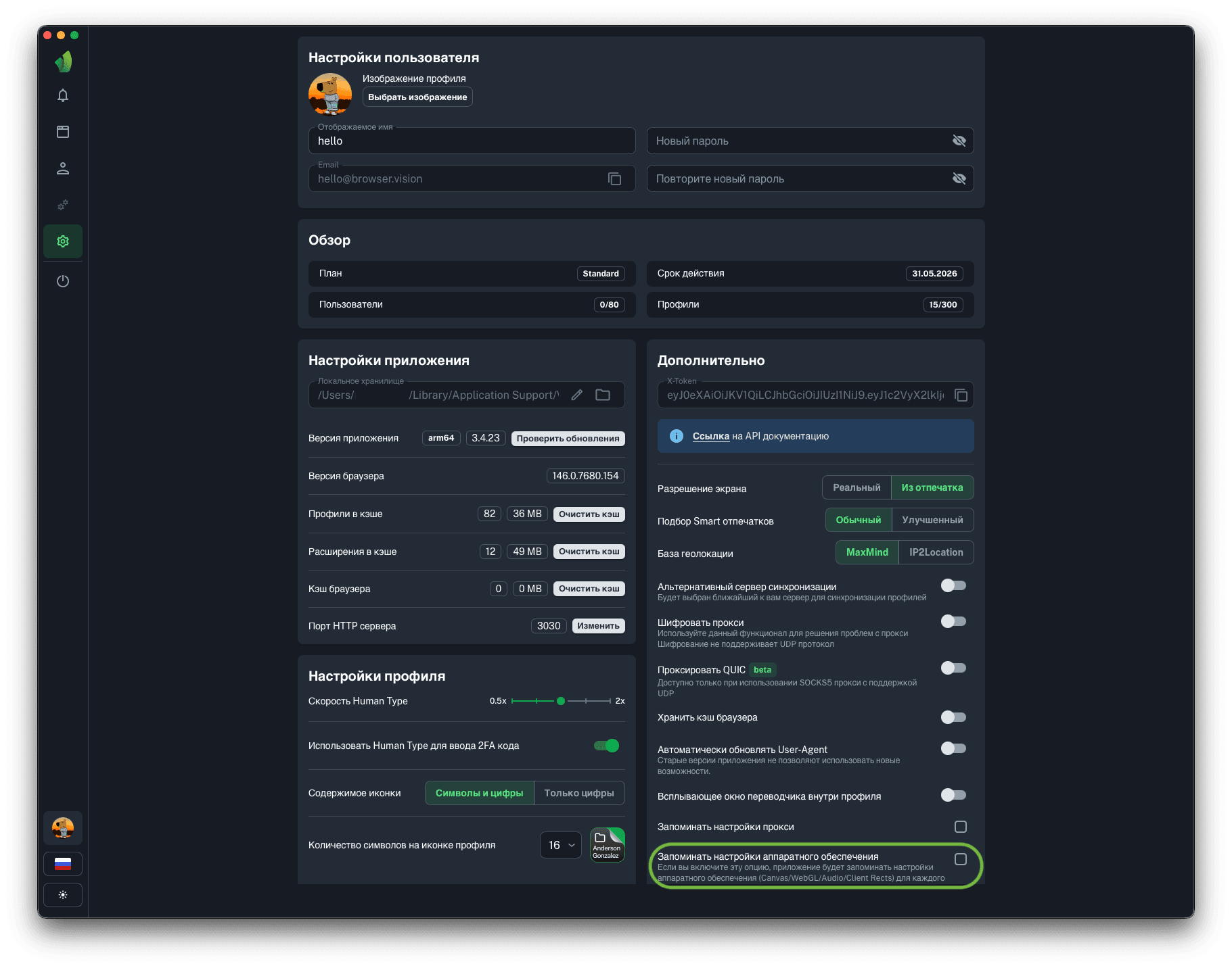 Включение данного функционала позволит запоминать настройки аппаратного обеспечения, которые были выбраны при создании профиля. Это значит, что при следующем открытии сайдбара создания профиля не будет необходимости выбирать те же самые настройки, что были выбраны на предыдущем профиле.
