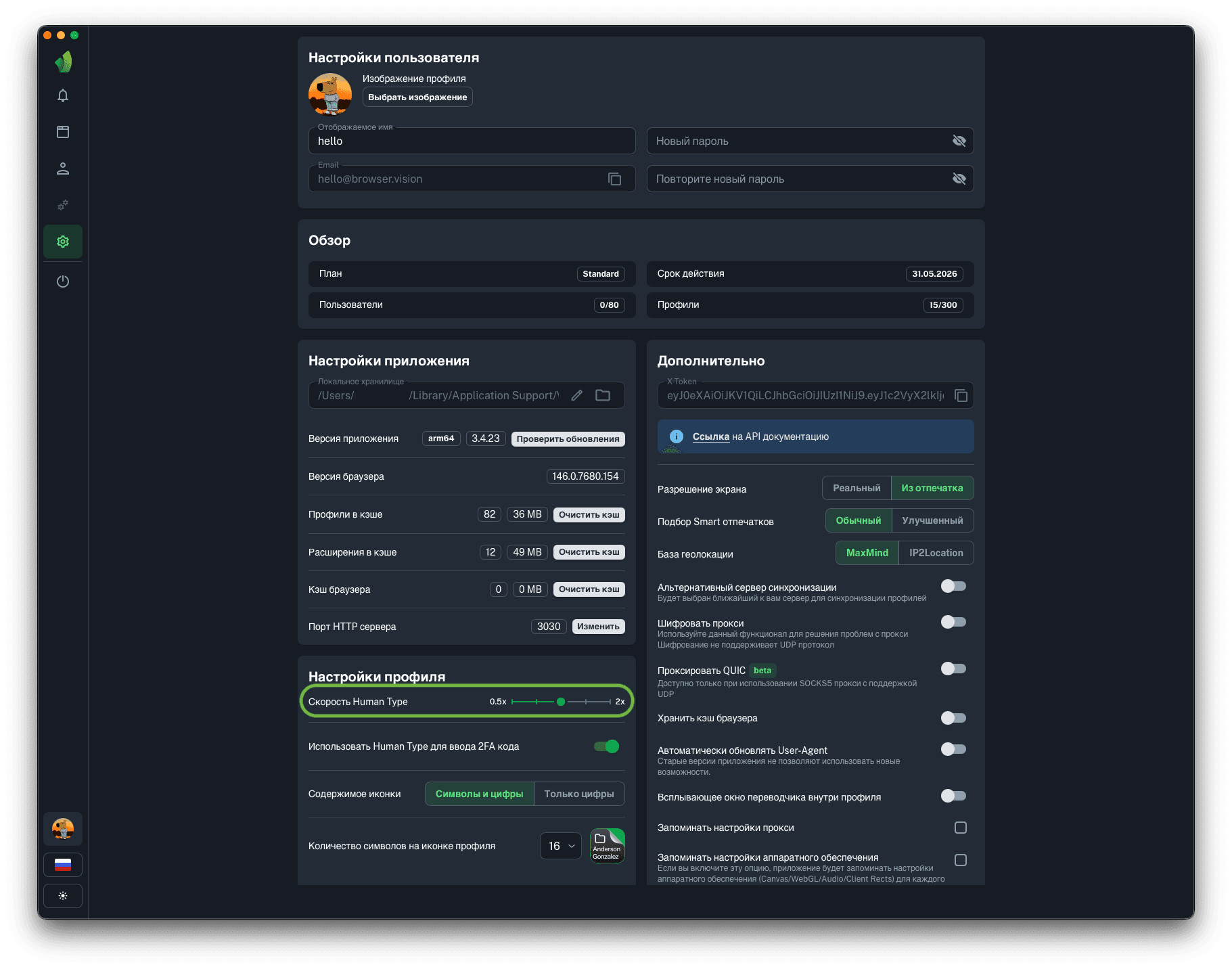 В Vision есть возможность регулировать скорость Human Type. Передвигая ползунок (выделен зеленым на скриншоте) можно изменять количество вводимых символов в минуту, подбирая оптимальную скорость ввода. Данная настройка является глобальной и будет применена ко всем профилям.