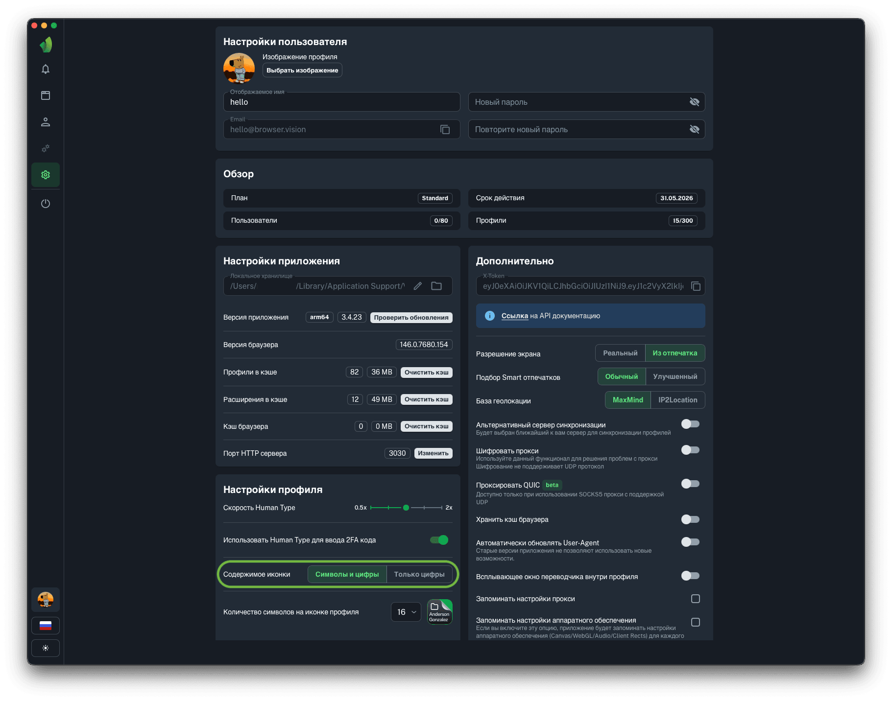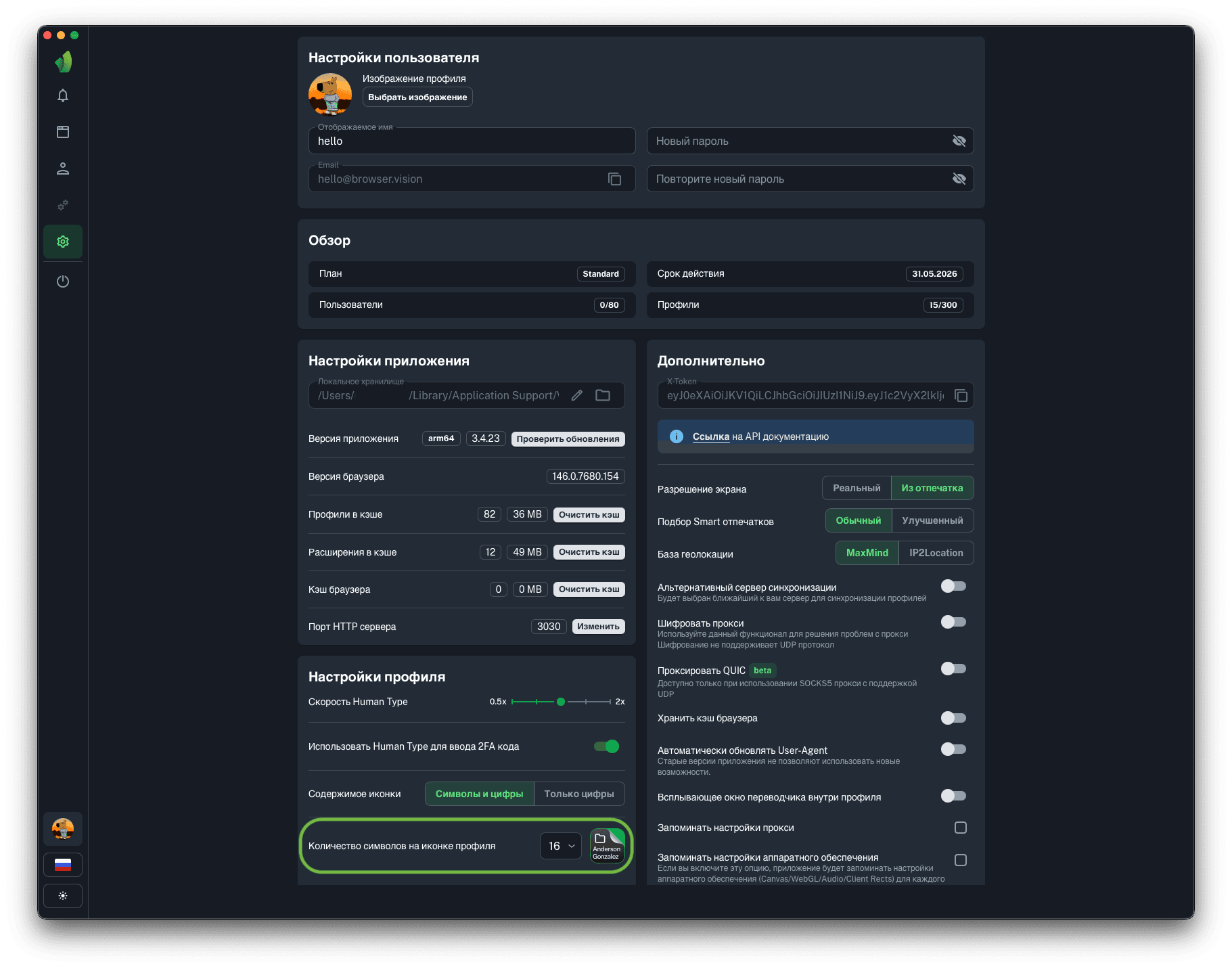 В Vision также есть возможность выбрать количество отображаемых символов на иконке профиля в Dock (macOS) или в панели задач (Windows). Доступные значения: от 4 до 16 символов. Данная настройка также является глобальной и будет применена ко всем профилям.