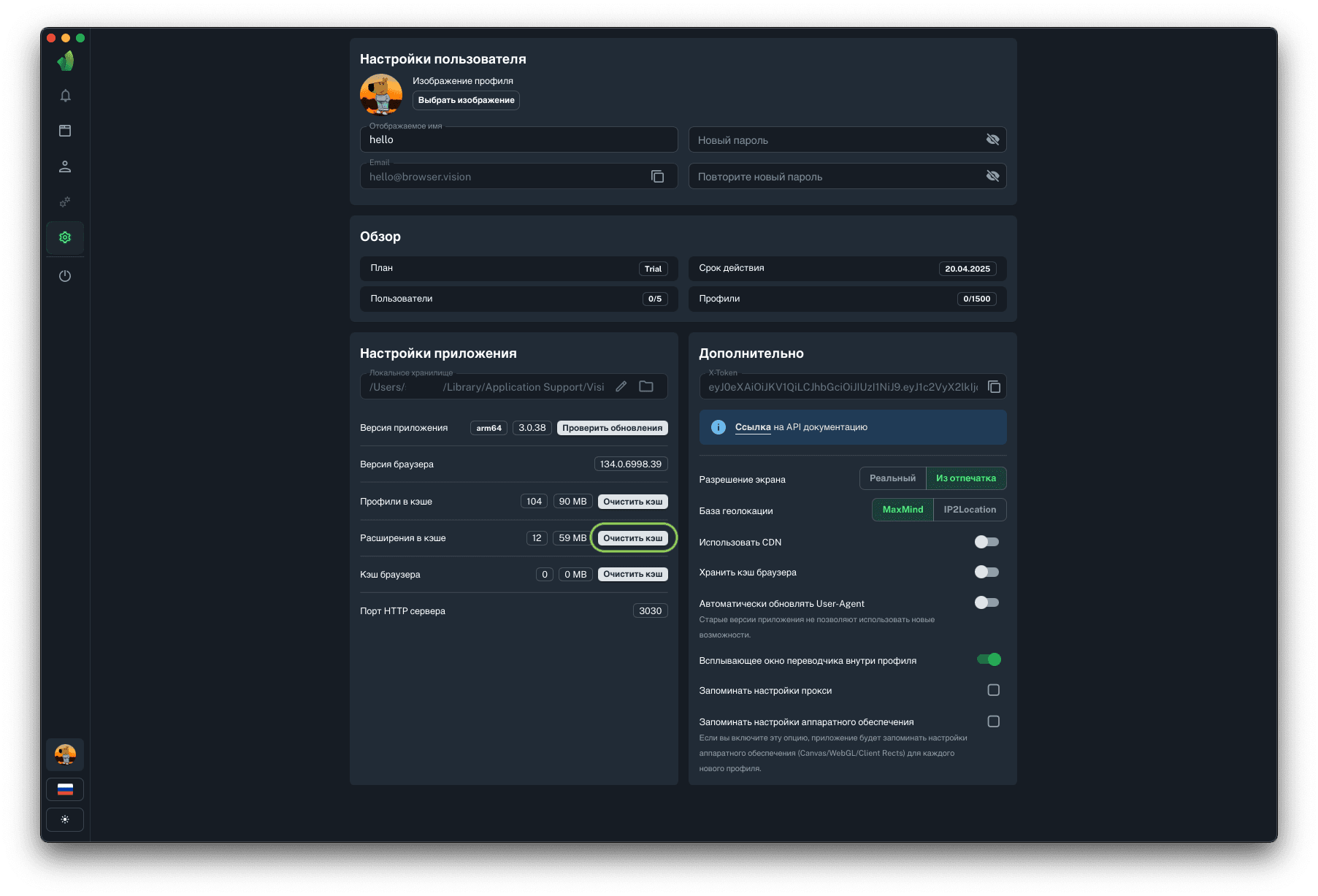 Данный параметр служит информацией о том, сколько места занимает информация о профилях и их содержимое. Также, есть возможность очистки кэша профилей, что будет означать удаление локальных копий архивов, которые хранятся на жёстком диске. При нажатии кнопки Очистить кэш происходит удаление этих данных.