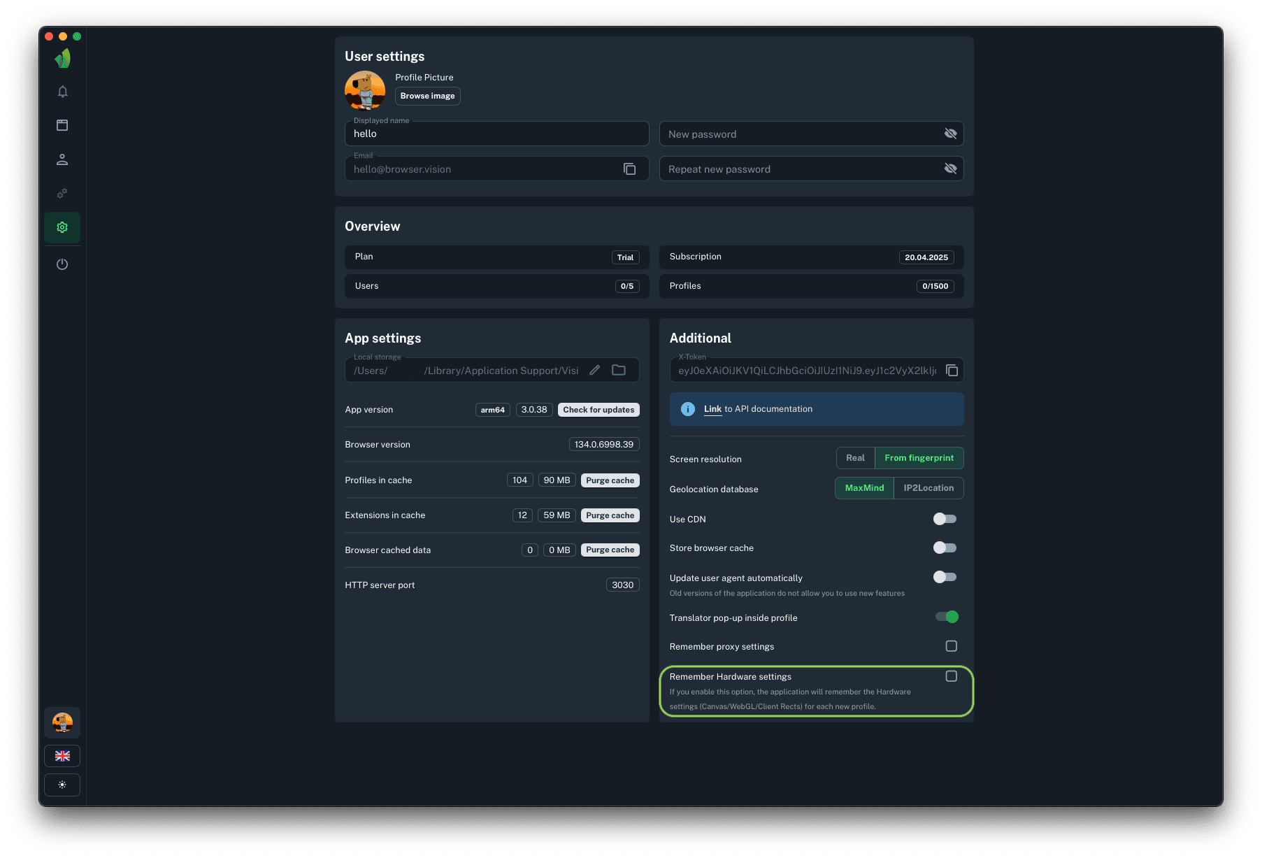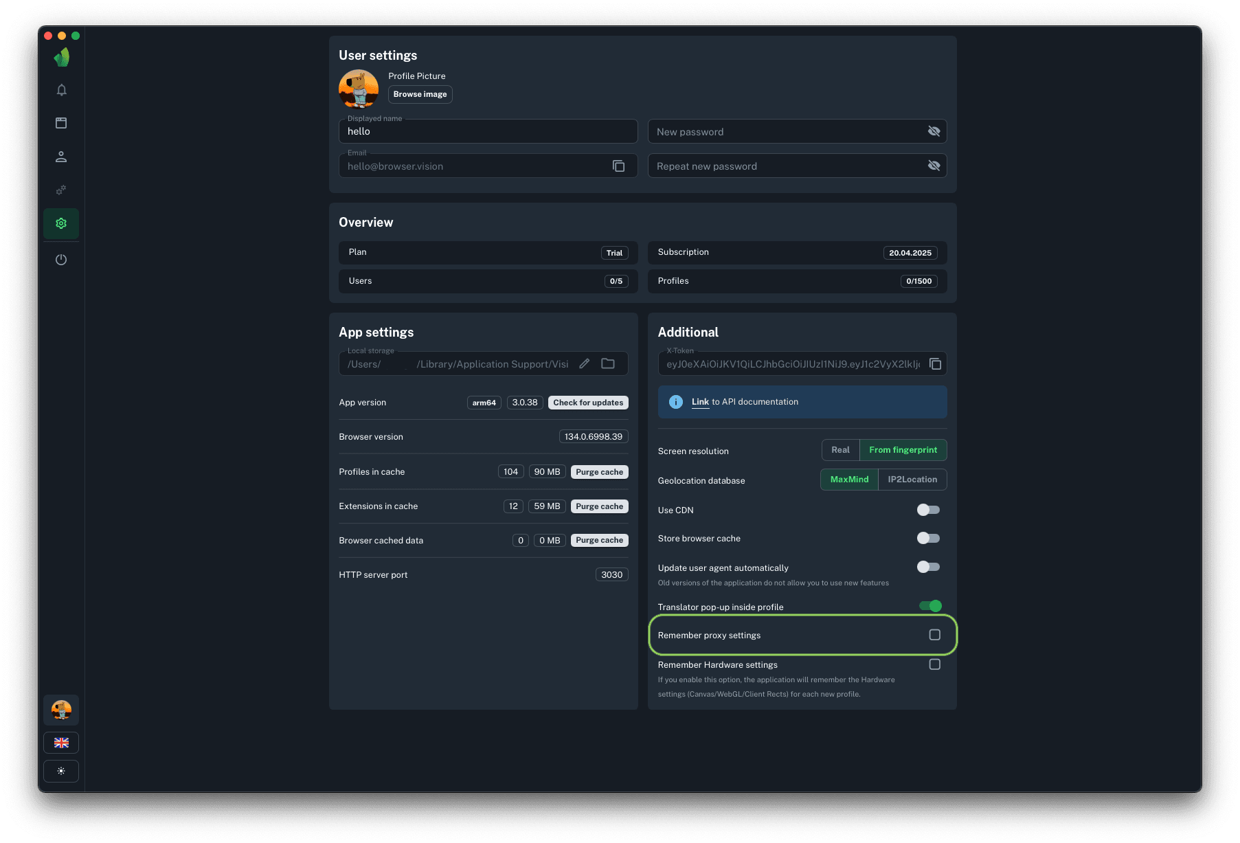 - Proxy and profile settings memory functionality