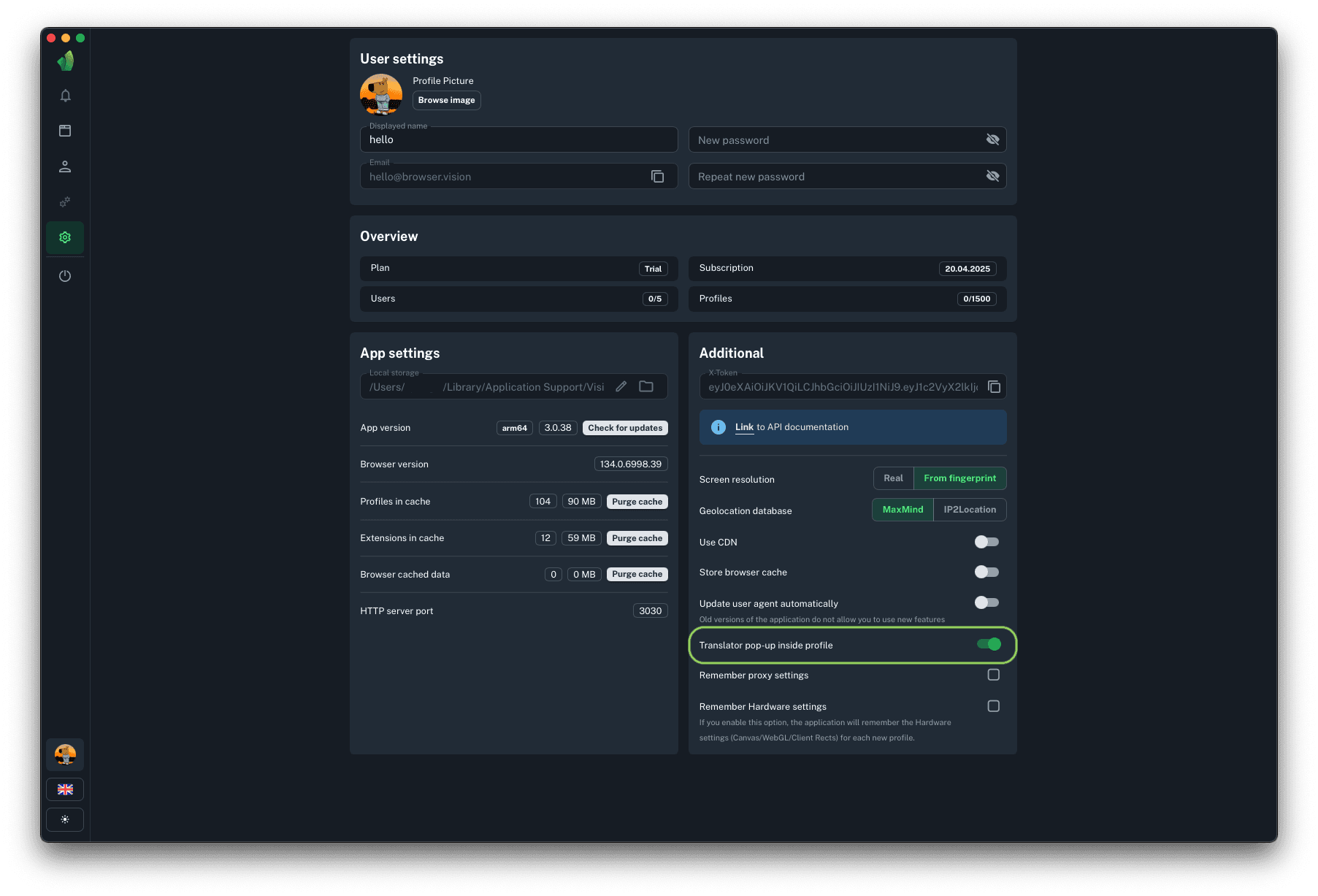 Enabling or disabling this feature allows you to hide or show the translator modal pop-up window that appears in the upper right corner of your browser when you load a site whose language is different from the language set in your profile. This setting is global and applies to all folders and profiles in them.