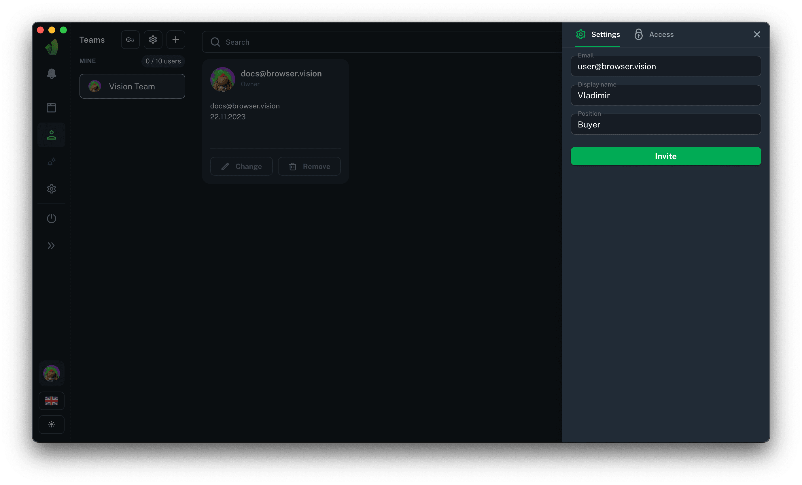 When the data on the Settings tab is entered and the necessary rights on the Permissions tab are granted, click the Invite button. The user whose e-mail address was specified during the invitation will receive an e-mail notification and will be able to accept the invitation in the Teams section.