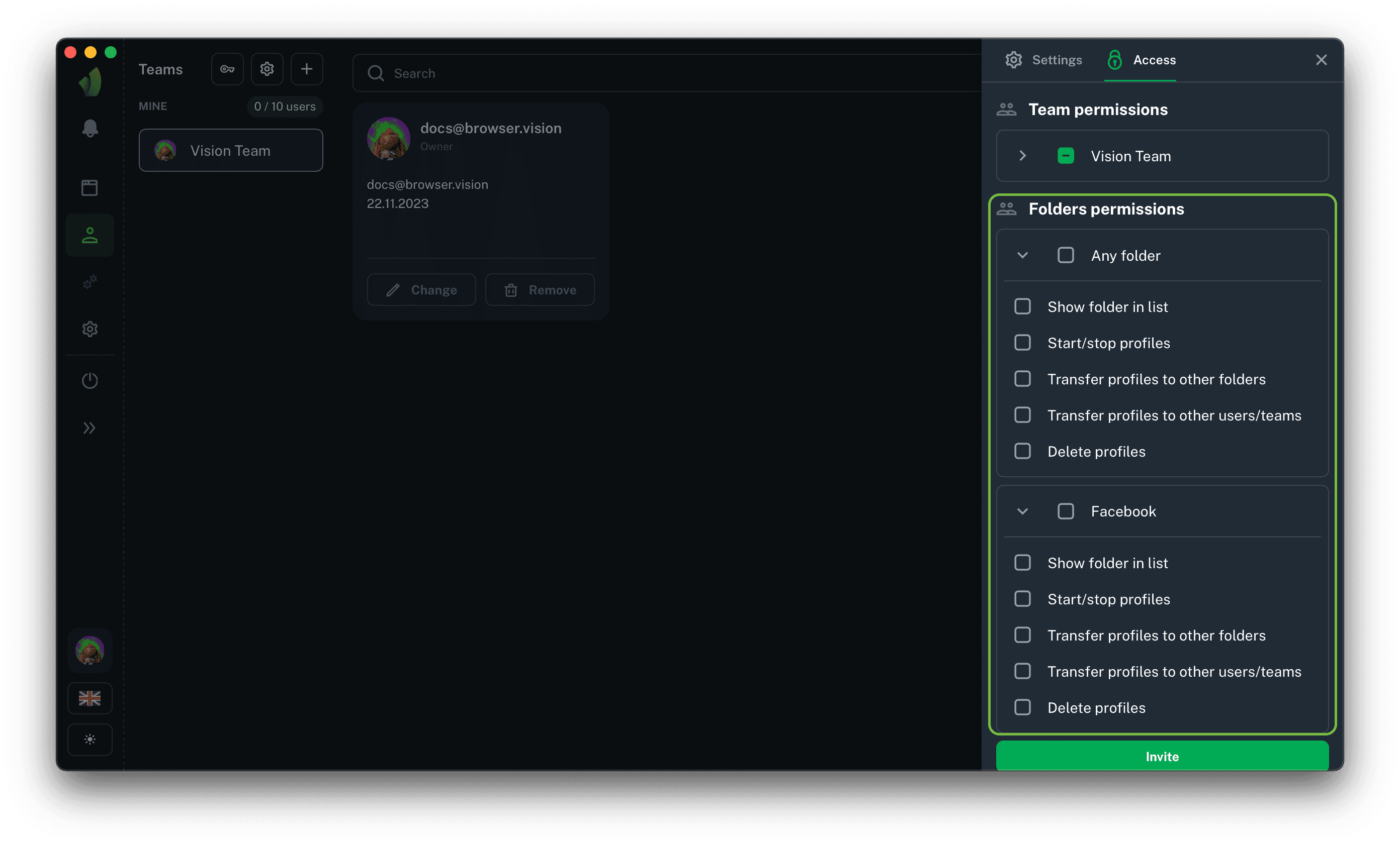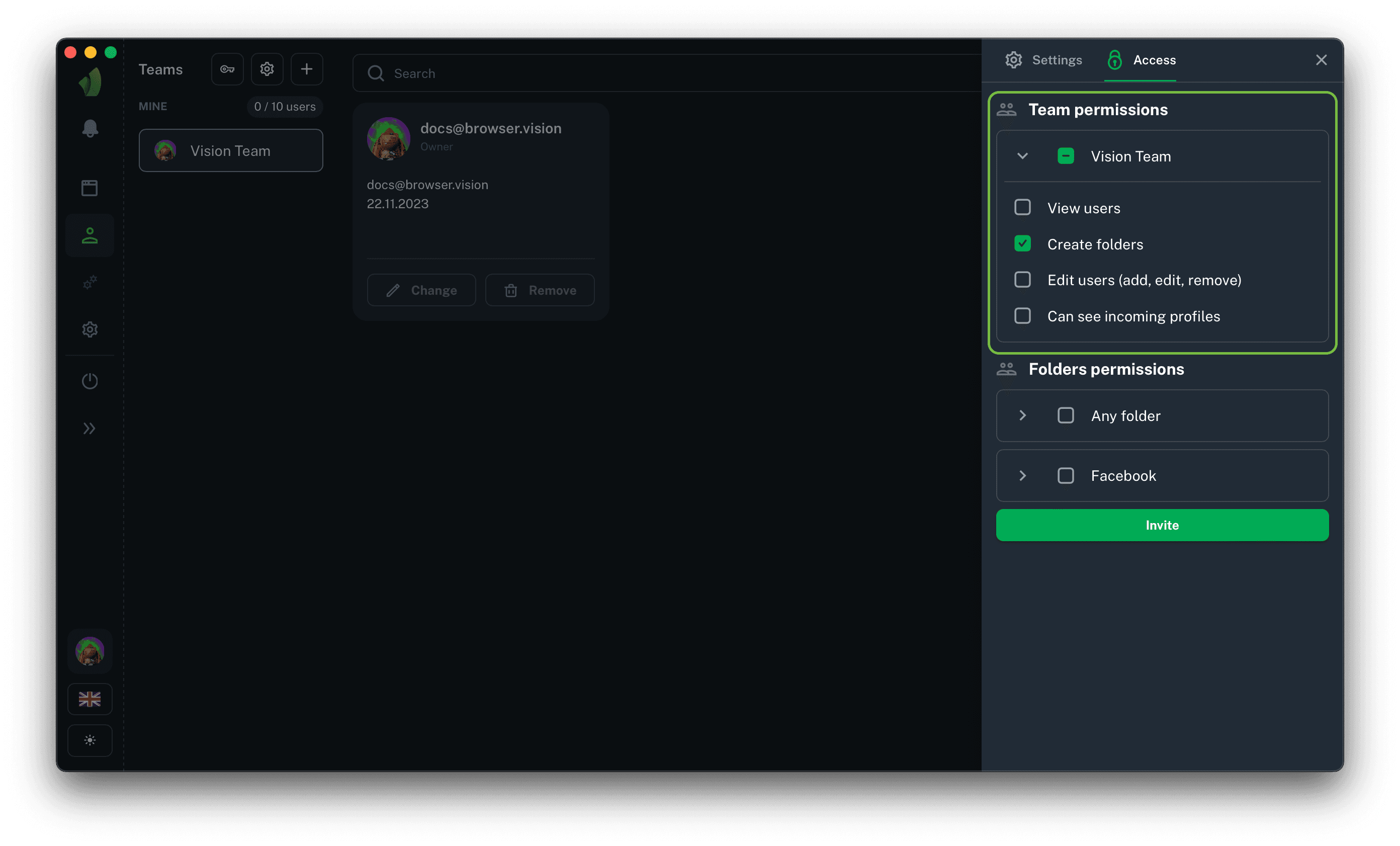 For easy management of your employees, Vision provides a system of access permissions. The interface for setting permissions is available when inviting and editing users in a team.