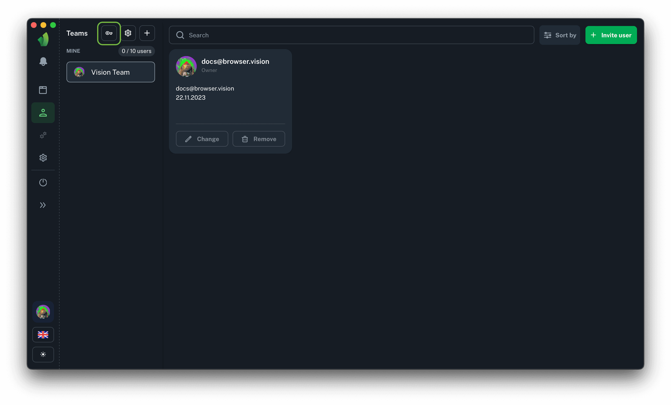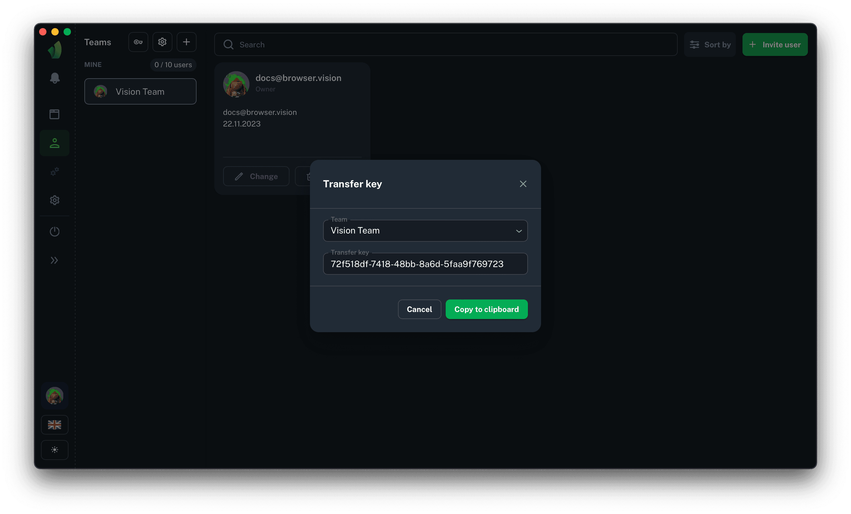 In order to get a transfer key to get profiles into a team, you need to go to the Teams section in the main sidebar and in the sidebar with the list of teams, and then click on the key icon, which is highlighted in green in the screenshot above.